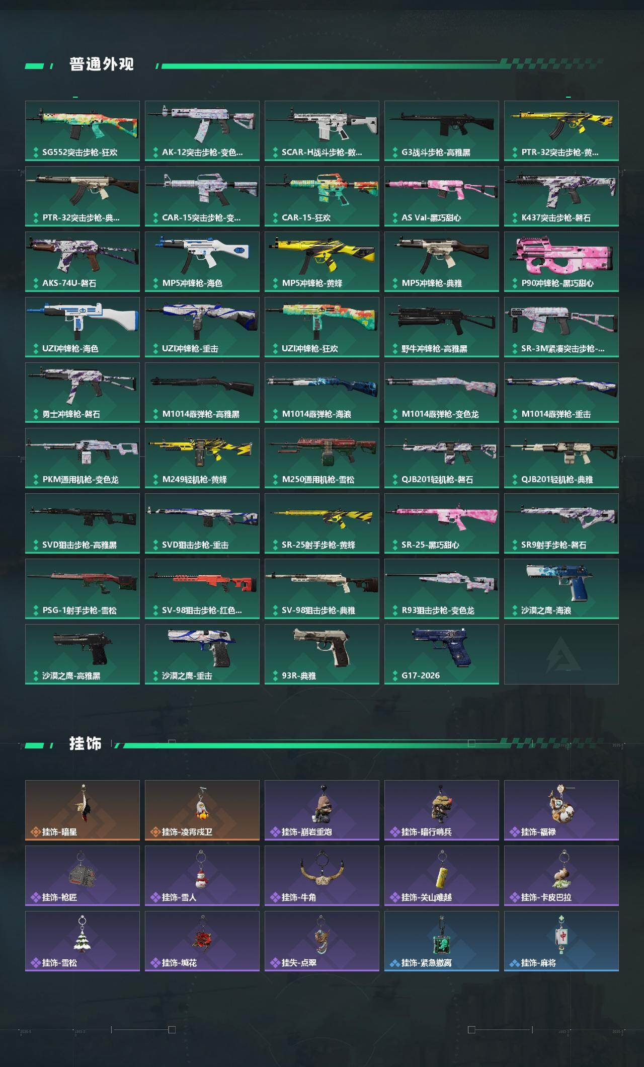 【传说外观】:AKM突击步枪-锦绣,QBZ95-1突击步枪-凌霄戍卫,K416突击步枪-行动记录,SG552突击步枪-运动员,SG552突击步枪-点翠,KC17突击步枪-点翠,MK47突击步枪-暗星,Vector冲锋枪-夜莺,SR-3M紧凑突击步枪-暗星,M14射手步枪-蛮荒,M14射手步枪-缄花,SR-25射手步枪-