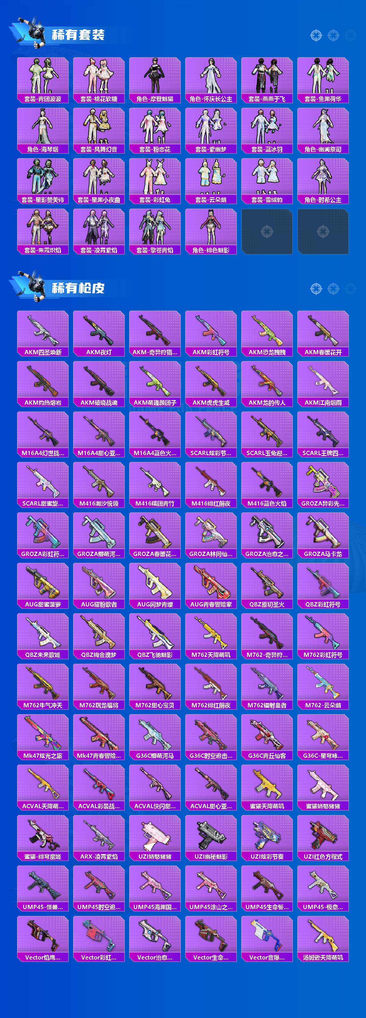 【粉色套装】:粉装-天使彩虹糖,粉装-金属狂野,粉装-银刃赛罗,粉装-冰霜白皇,粉装-蝶舞蔷薇,粉装-蓝莓炮弹,粉装-紫电风暴,