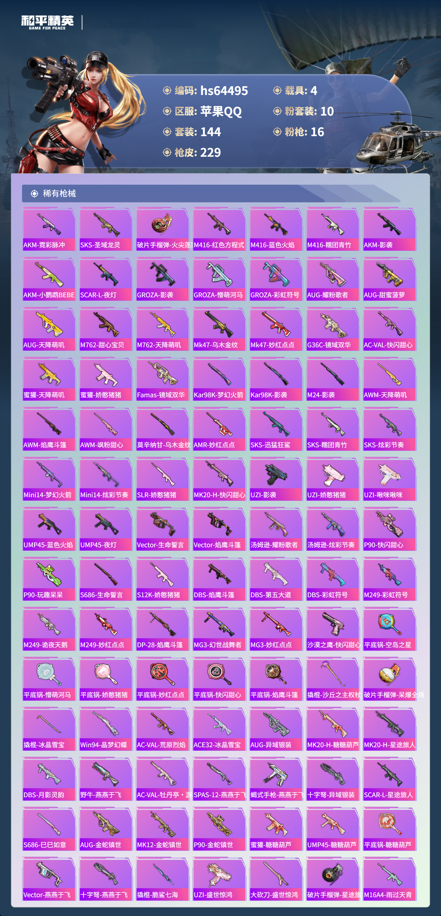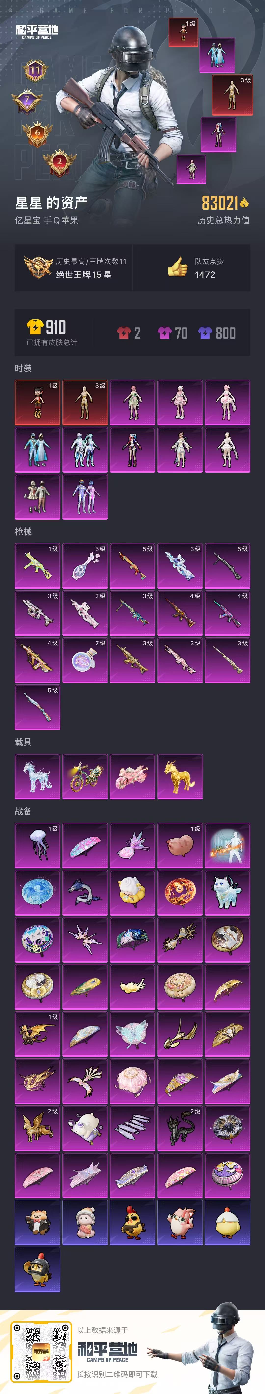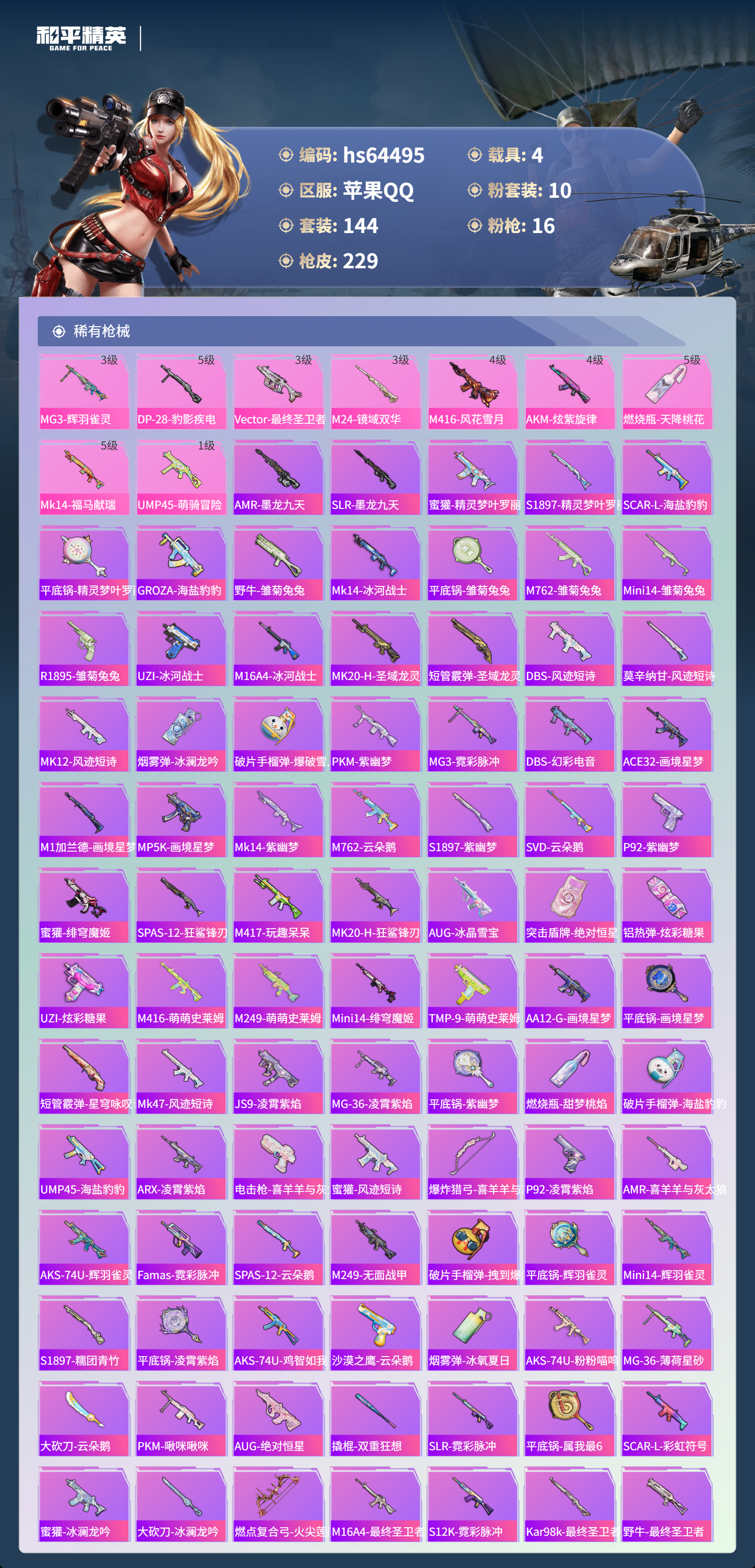 hs64495 苹果手Q-11王牌印记-2红装-10粉装-16特效枪-4载具-83021热力值-144套装-229枪皮-7卓越印记-6传奇印记