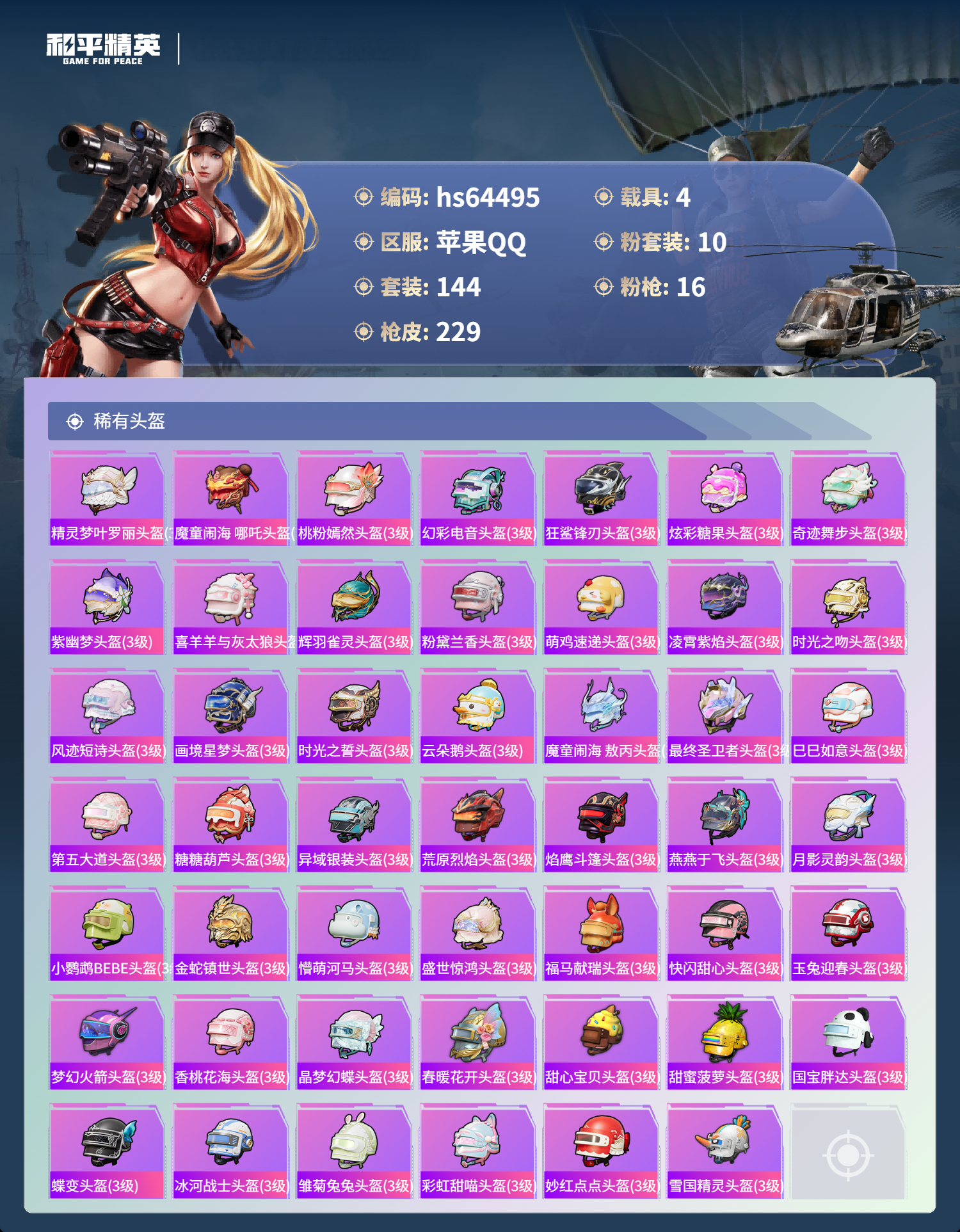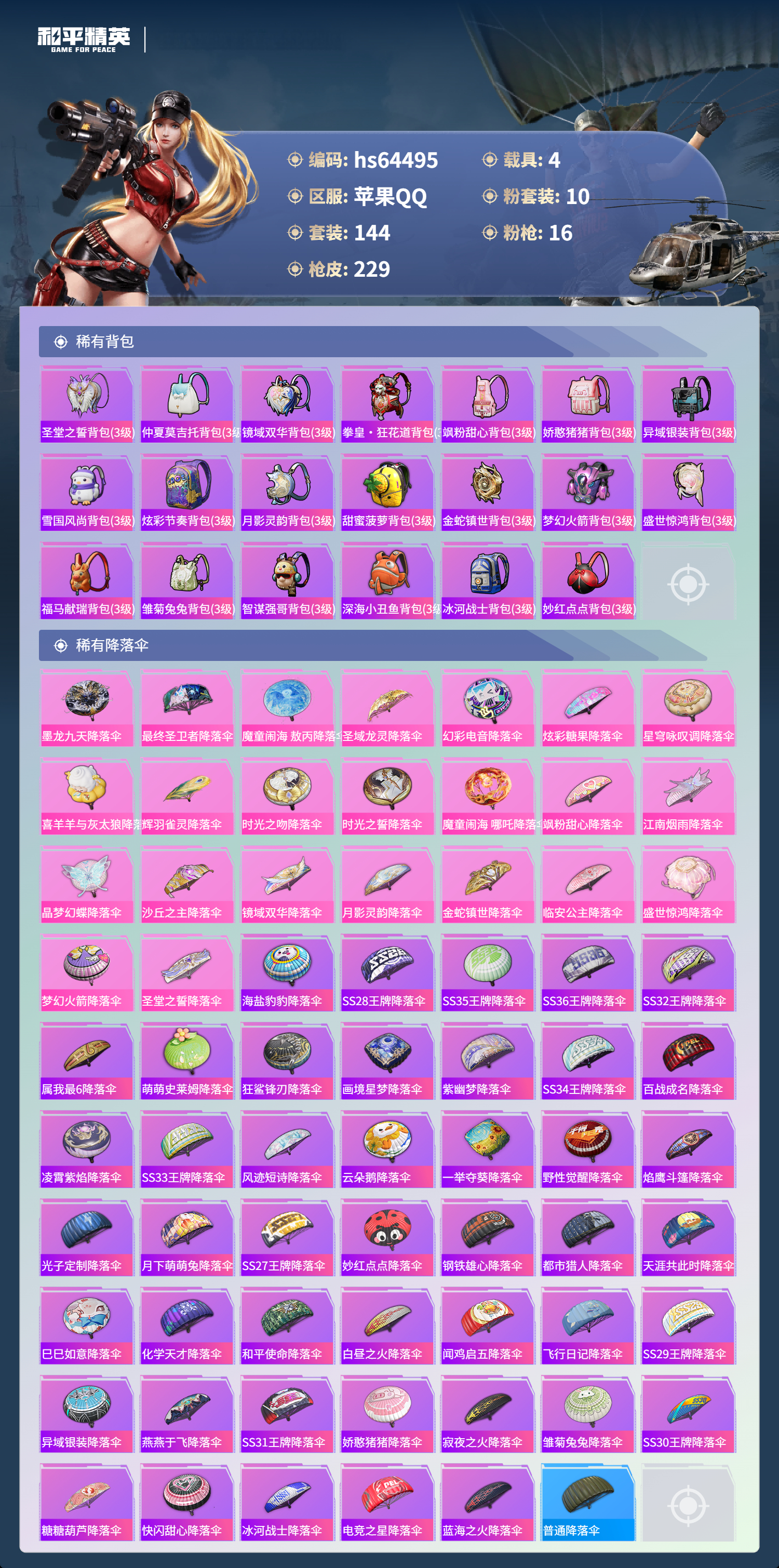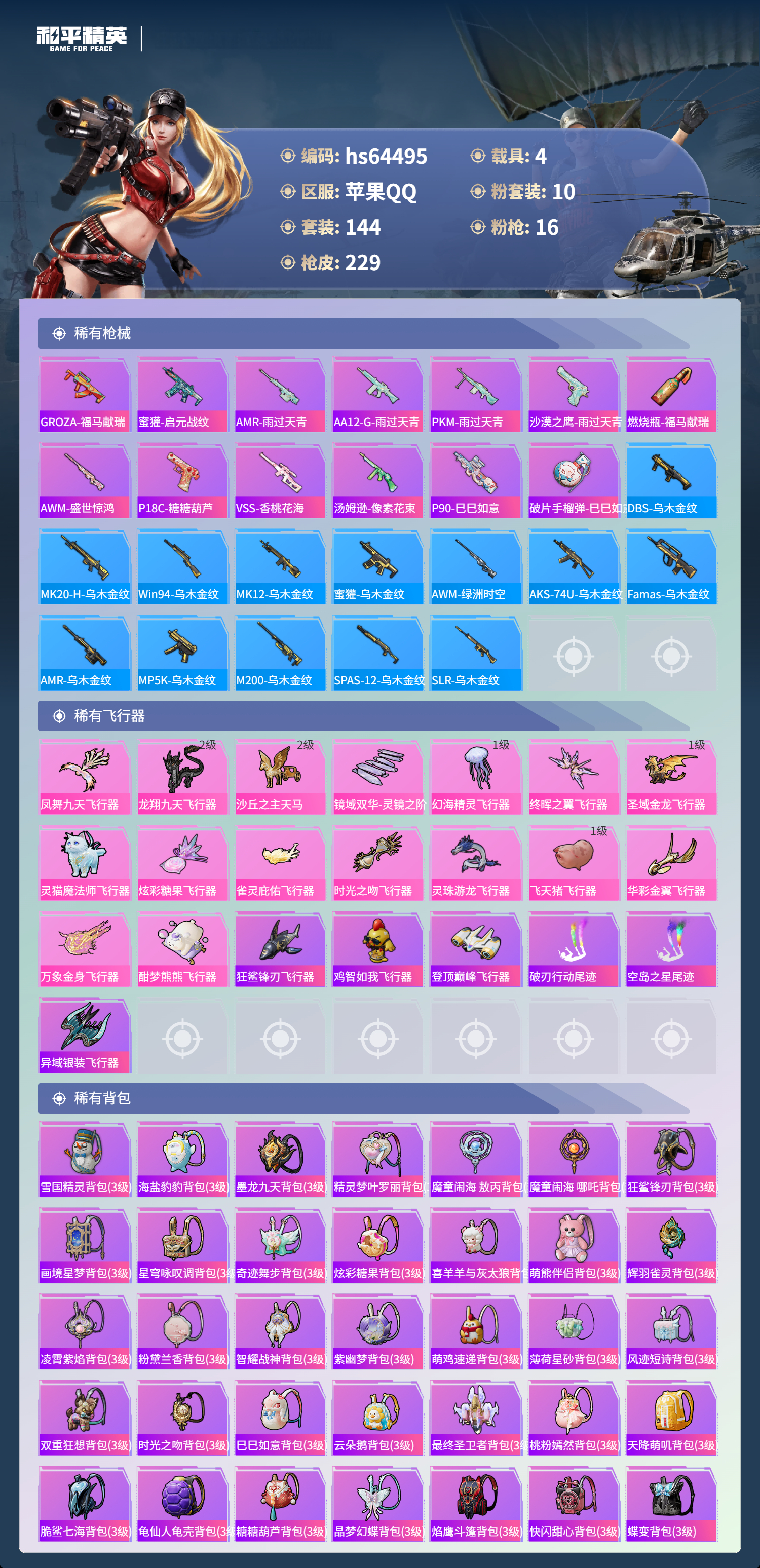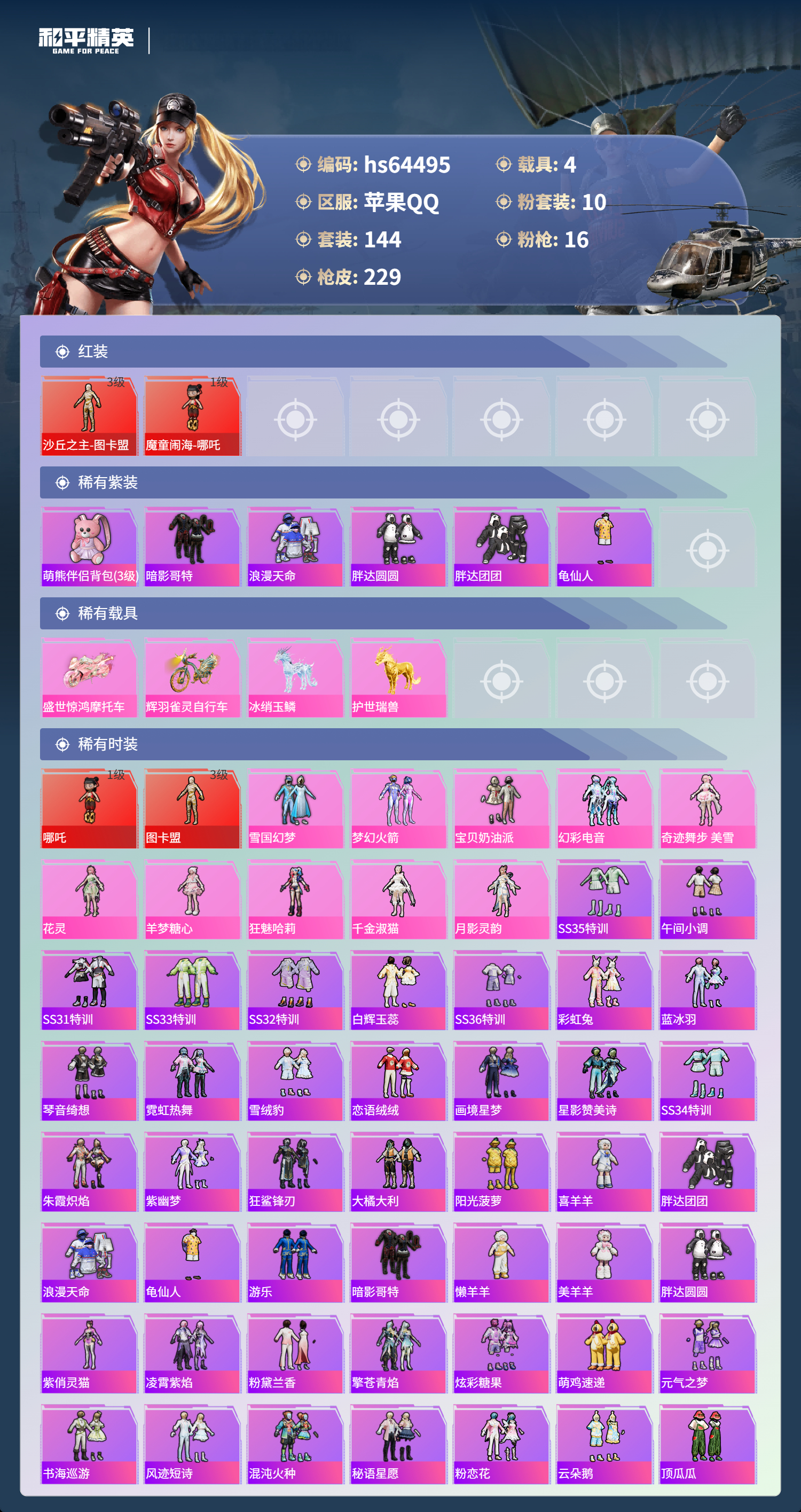 hs64495 苹果手Q-11王牌印记-2红装-10粉装-16特效枪-4载具-83021热力值-144套装-229枪皮-7卓越印记-6传奇印记
