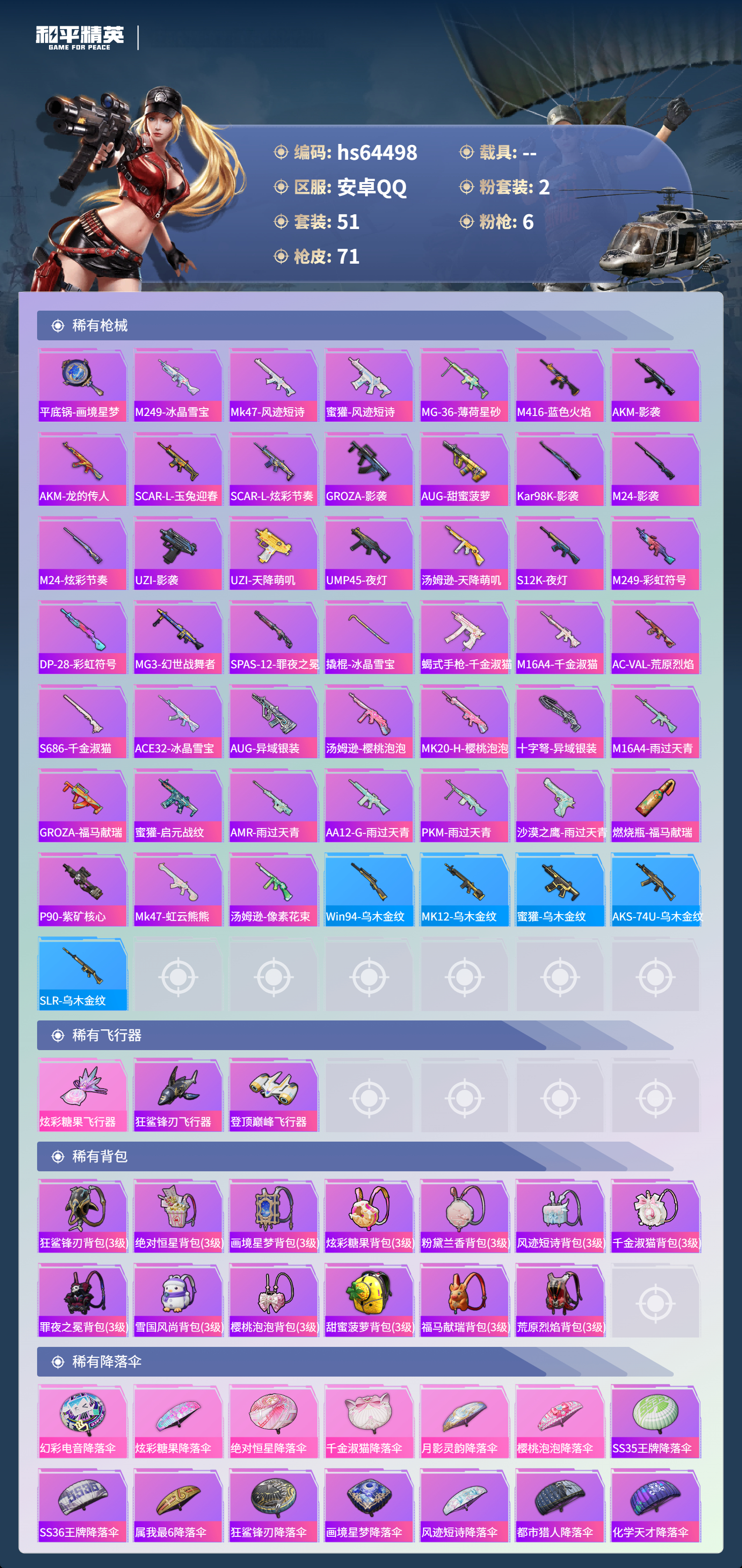 hs64498 安卓手Q-3王牌印记-2粉装-6特效枪-21323热力值-51套装-71枪皮-2卓越印记-1传奇印记