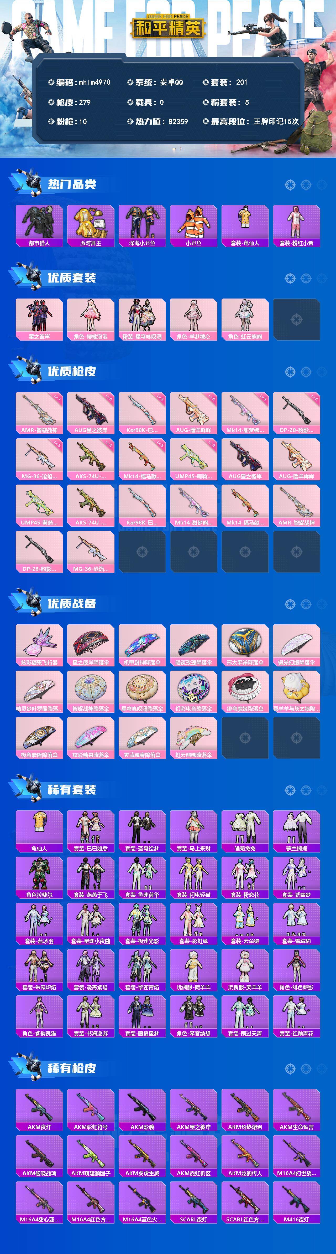 【mhlm4970】安卓 手Q-5粉装-10特效枪-0载具-1粉色飞行器-82359热力值-15王牌印记-201套装-279枪皮