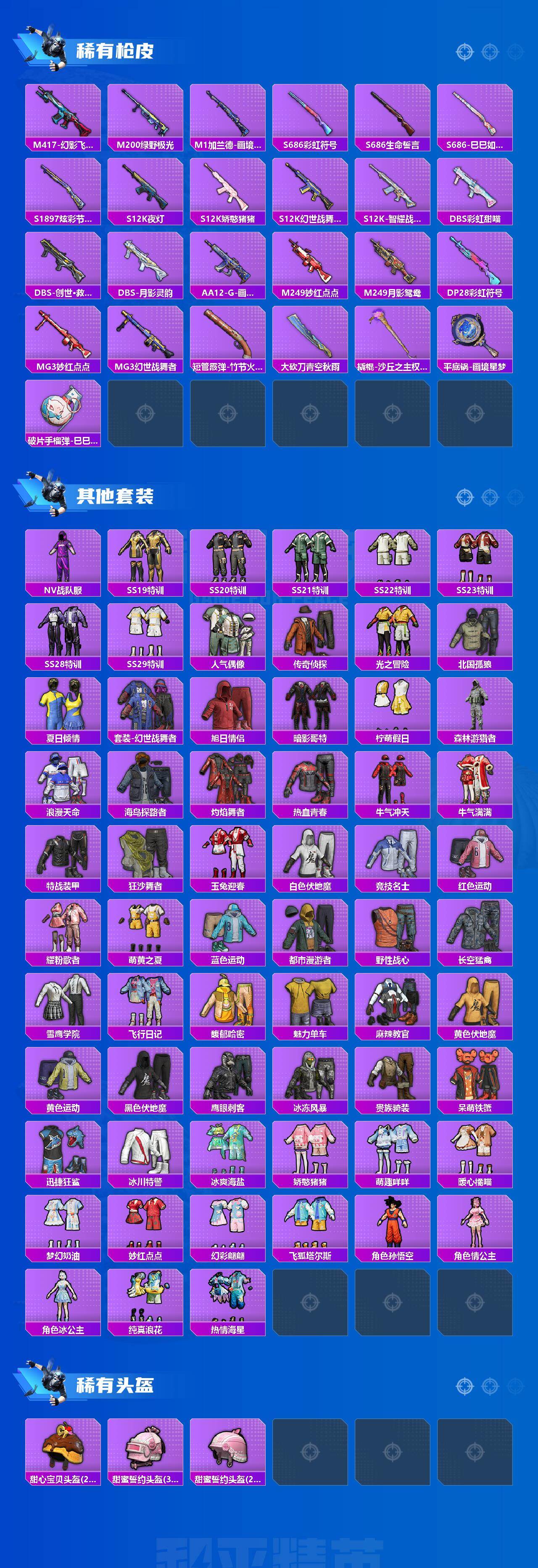 【粉色枪皮等级】:M416-心之恋语(五级),AUG-暖羊咩咩(五级),M762-鬼刀(五级),UMP45-量子极限(五级),Kar98K-巳巳如意(五级),Mk14-福马献瑞(五级),AMR-智耀战神(五级),DP-28-豹影疾电(五