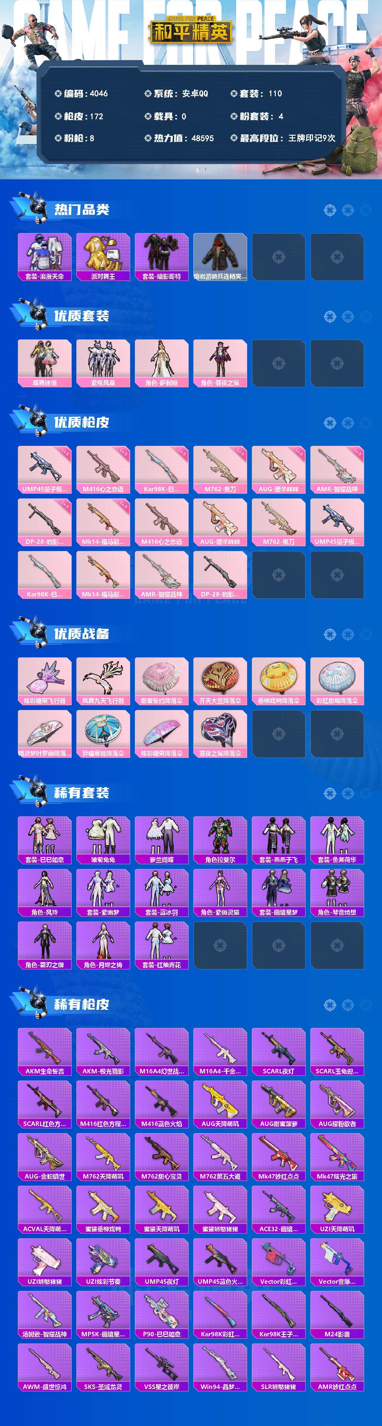 安卓 手Q-4粉装-8特效枪-0载具-2粉色飞行器-48595热力值-9王牌印记-110套装-172枪皮