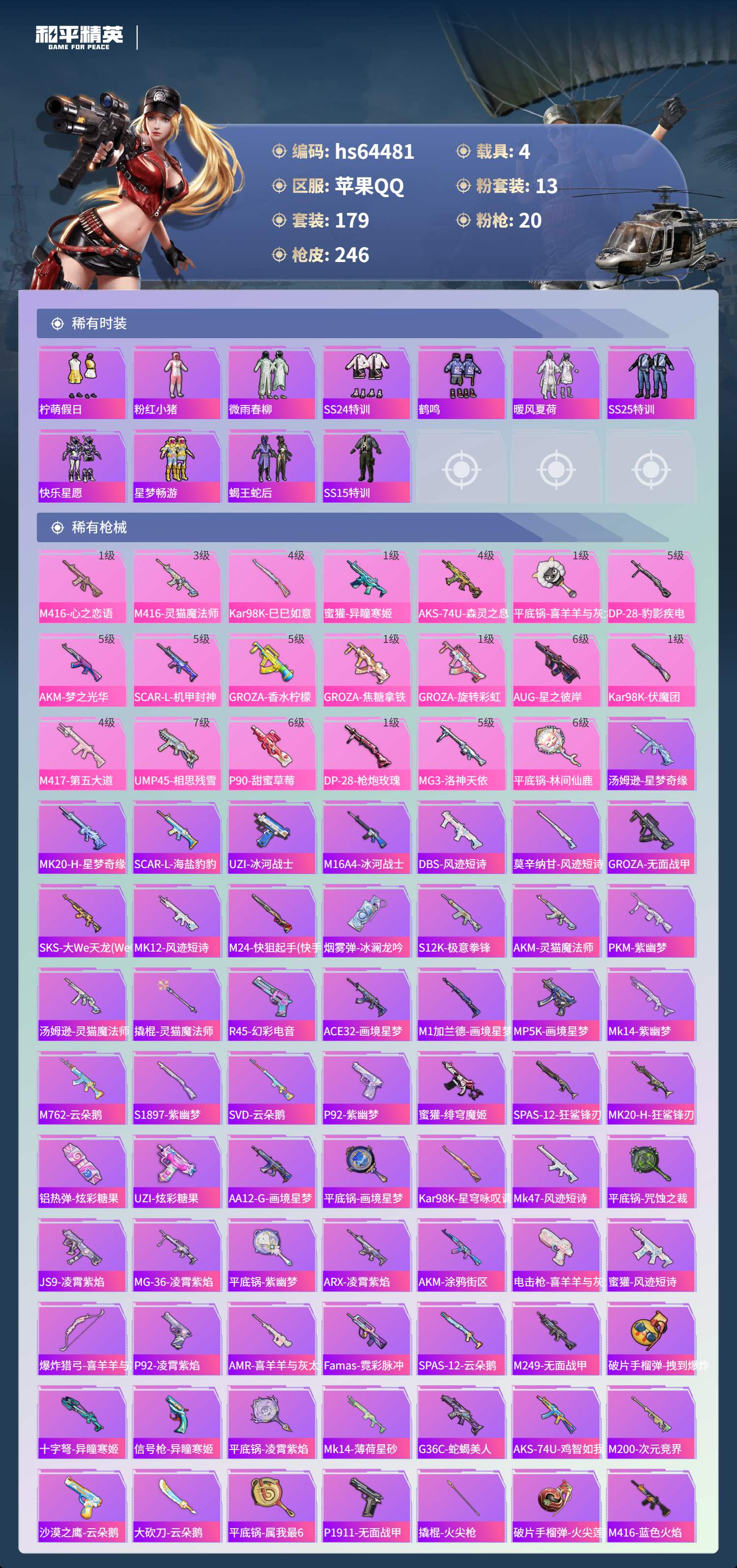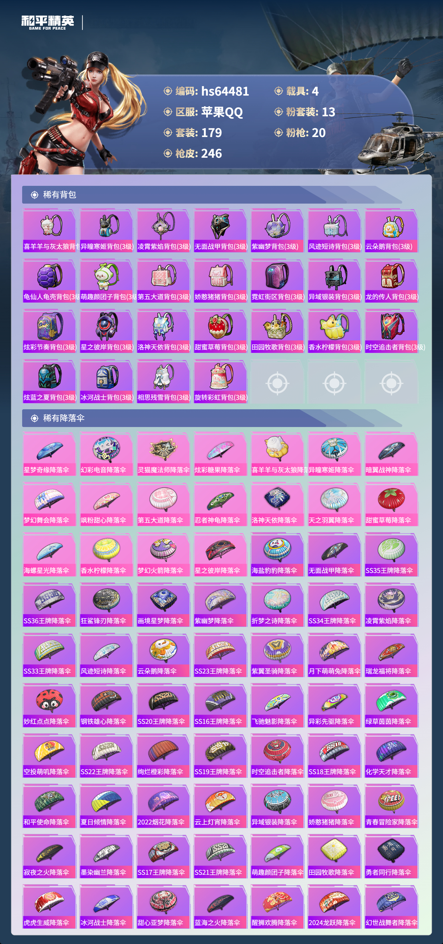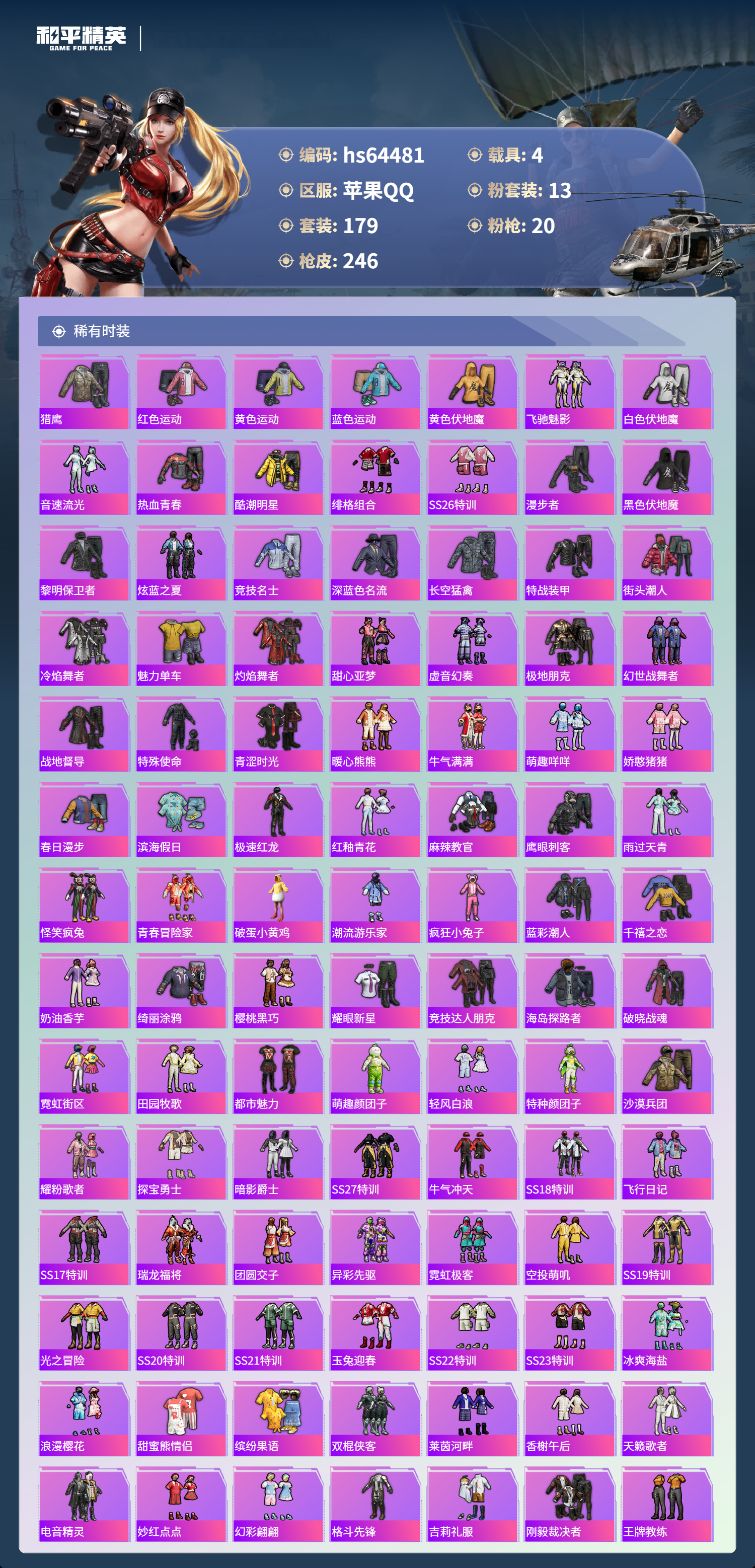 hs64481 苹果手Q-14王牌印记-13粉装-20特效枪-4载具-91625热力值-179套装-246枪皮-2卓越印记-1传奇印记