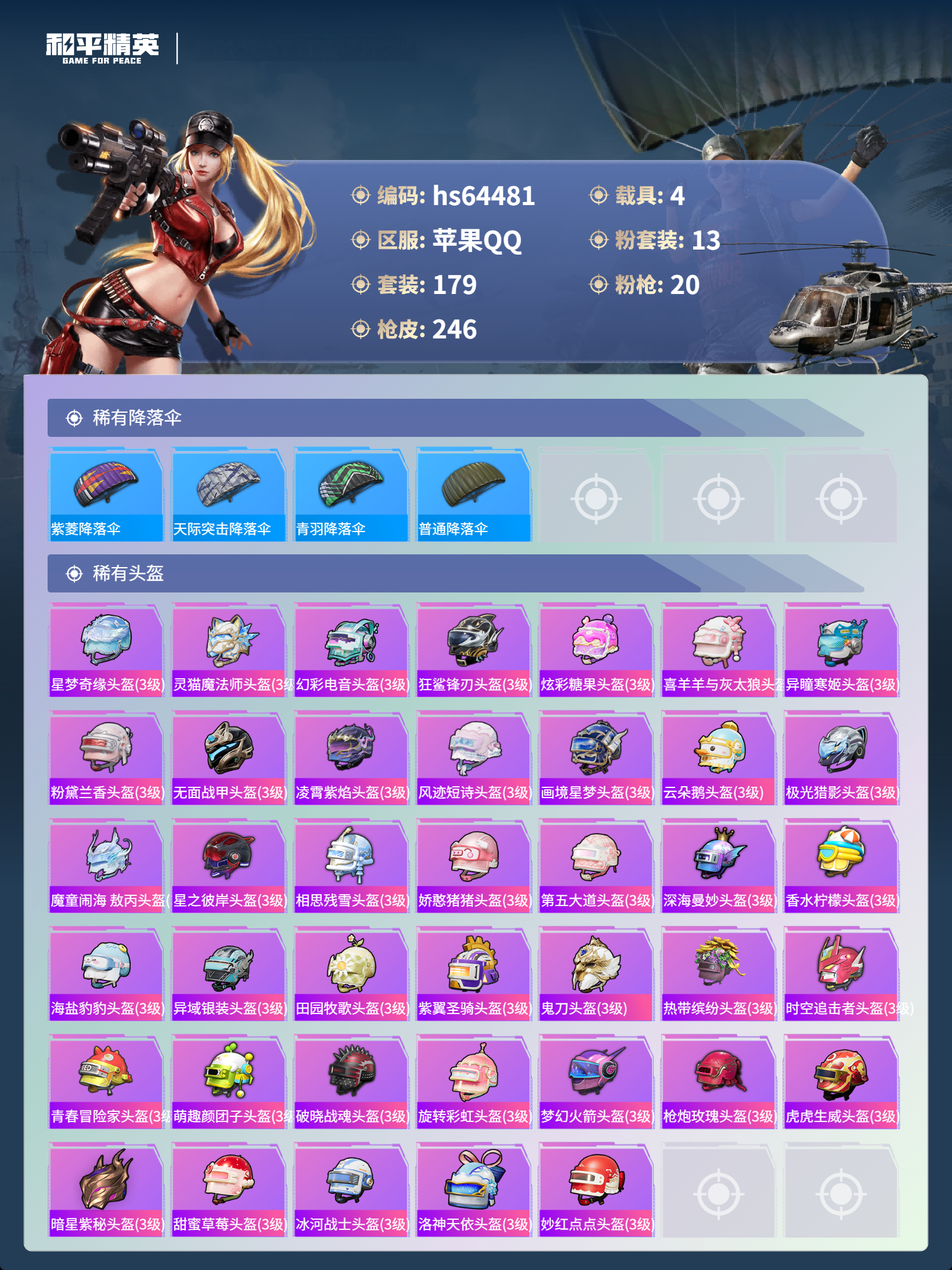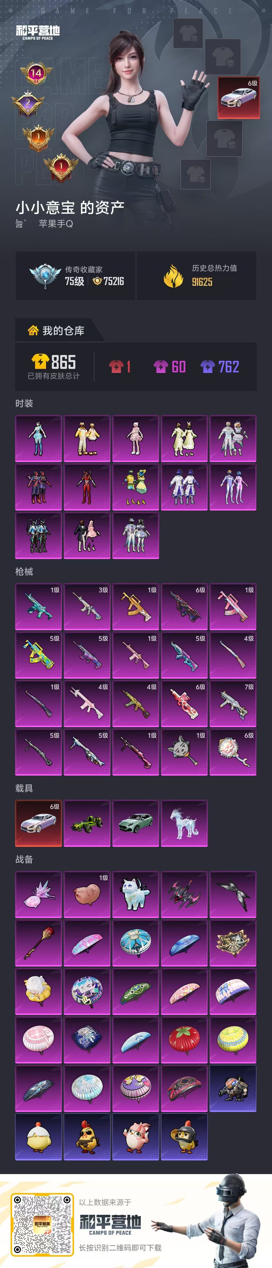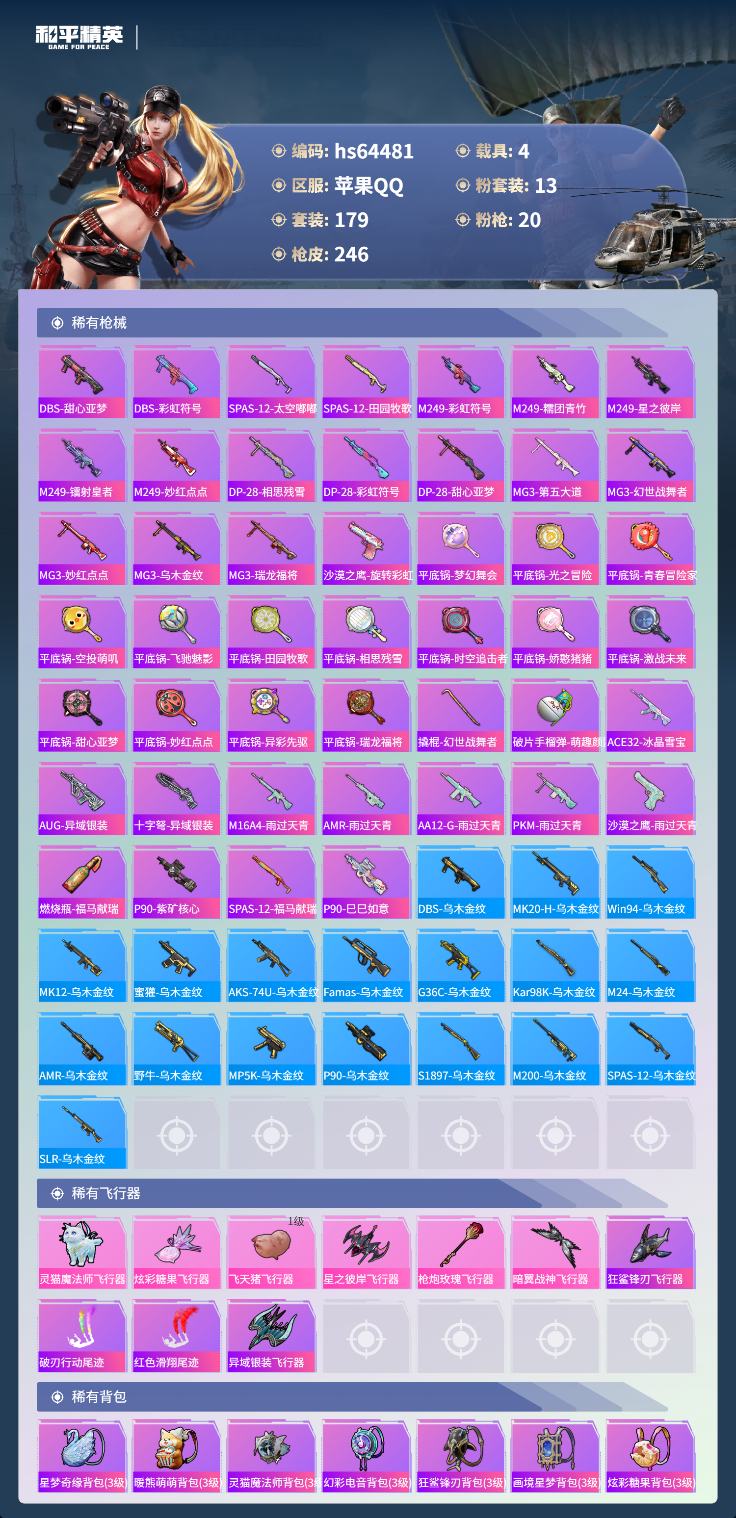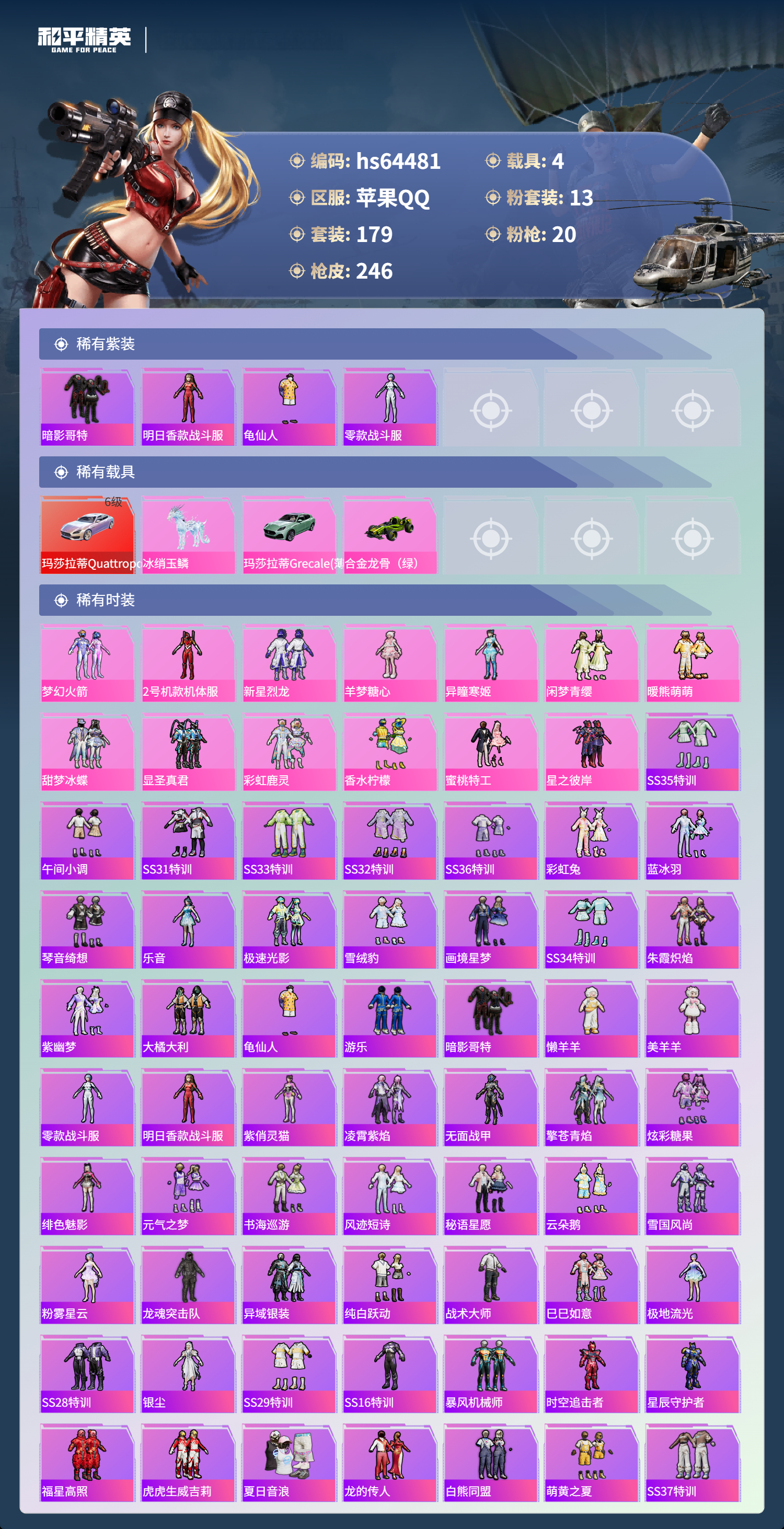 hs64481 苹果手Q-14王牌印记-13粉装-20特效枪-4载具-91625热力值-179套装-246枪皮-2卓越印记-1传奇印记