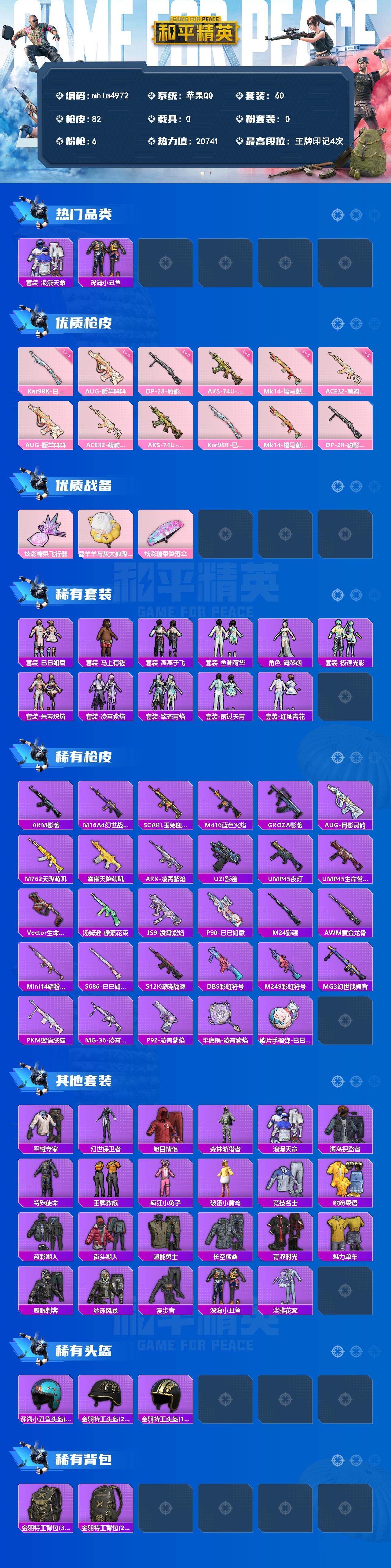 【mhlm4972】苹果 手Q-0粉装-6特效枪-0载具-1粉色飞行器-20741热力值-4王牌印记-60套装-82枪皮