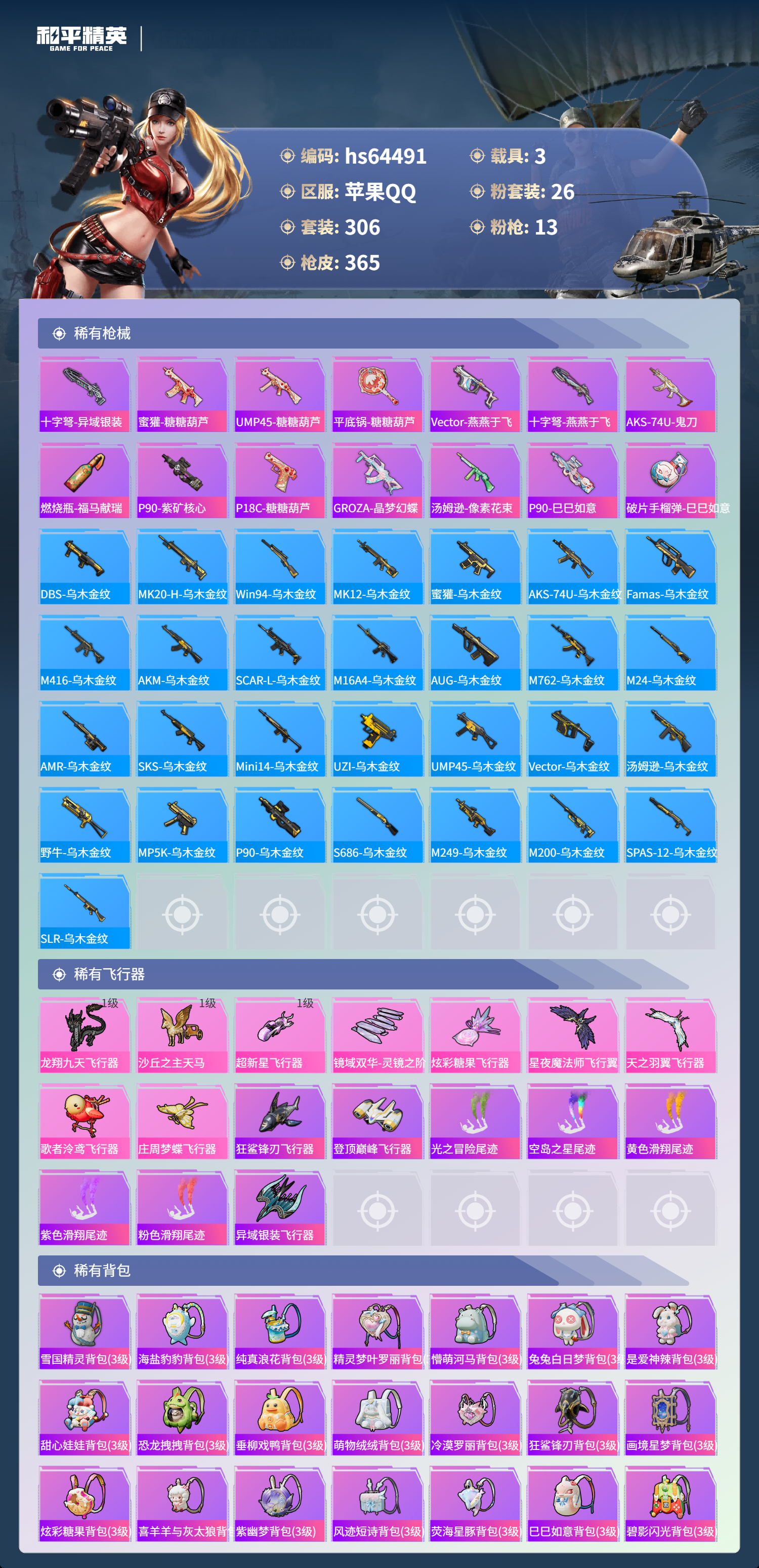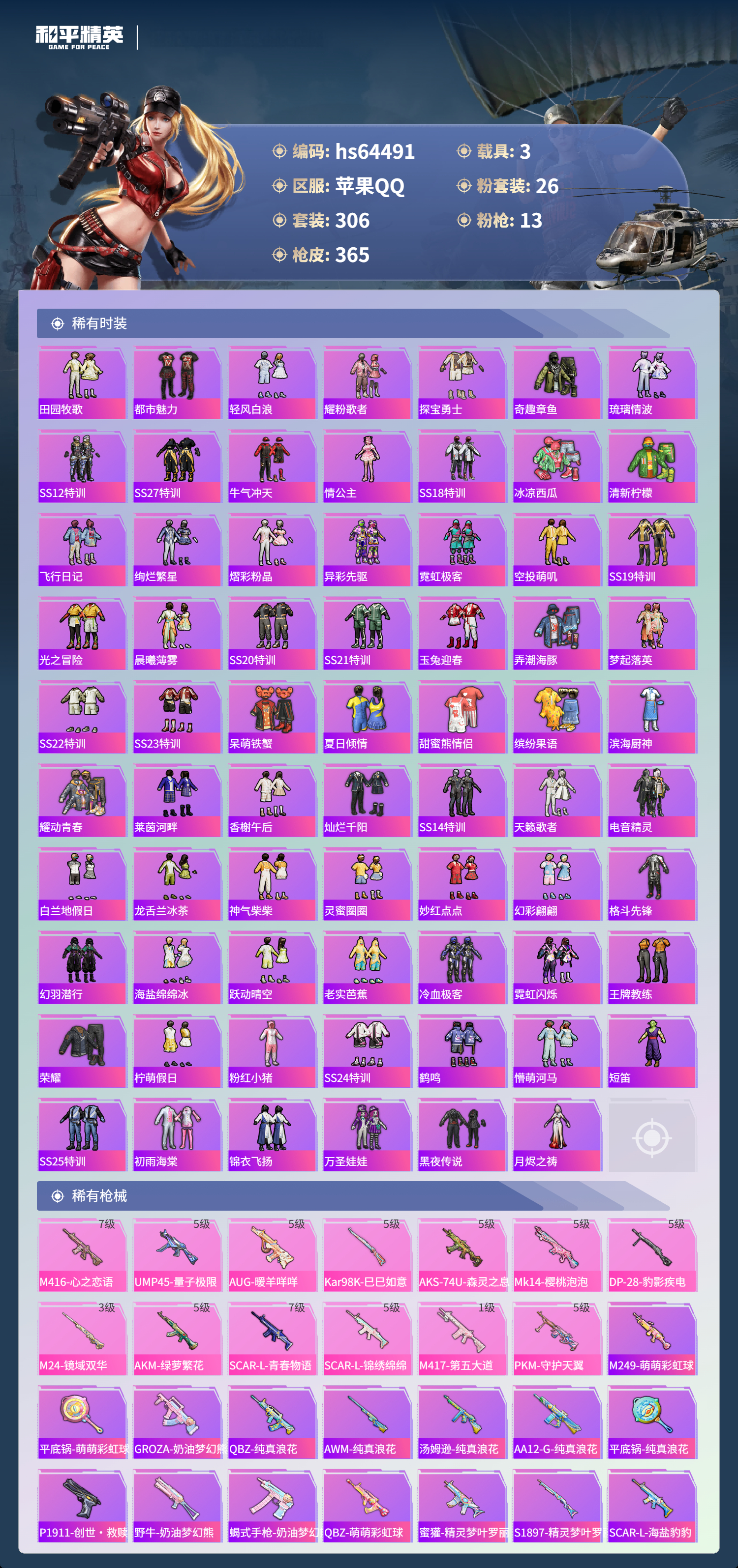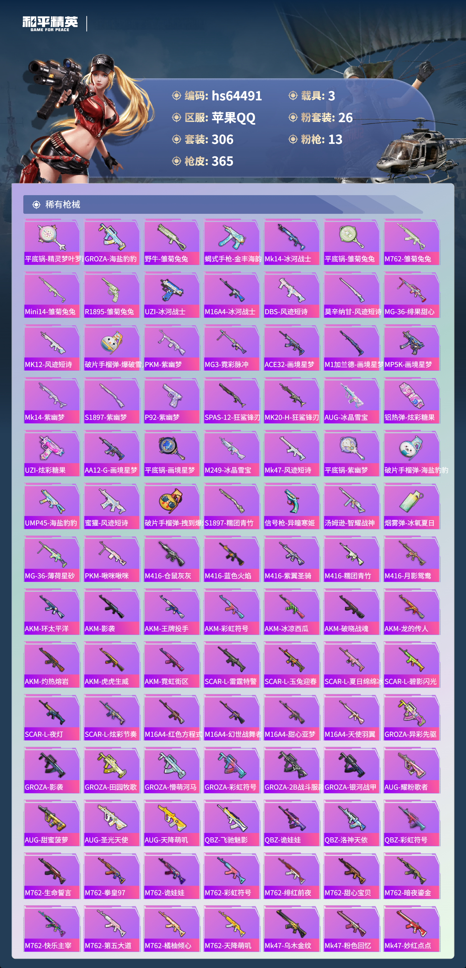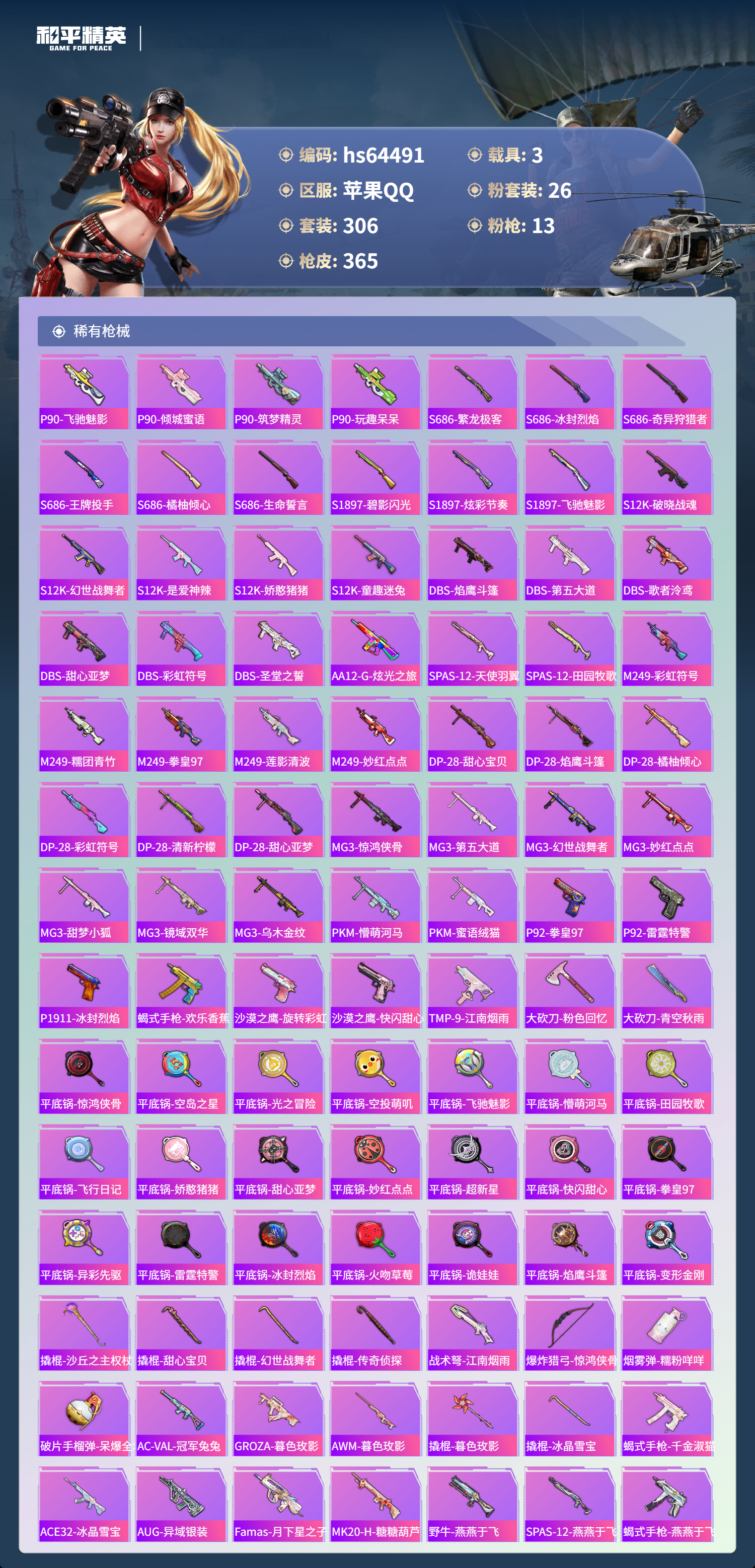 hs64491 苹果手Q-23王牌印记-有战神框-2红装-26粉装-13特效枪-3载具-热力值-306套装-365枪皮-7卓越印记-6传奇印记