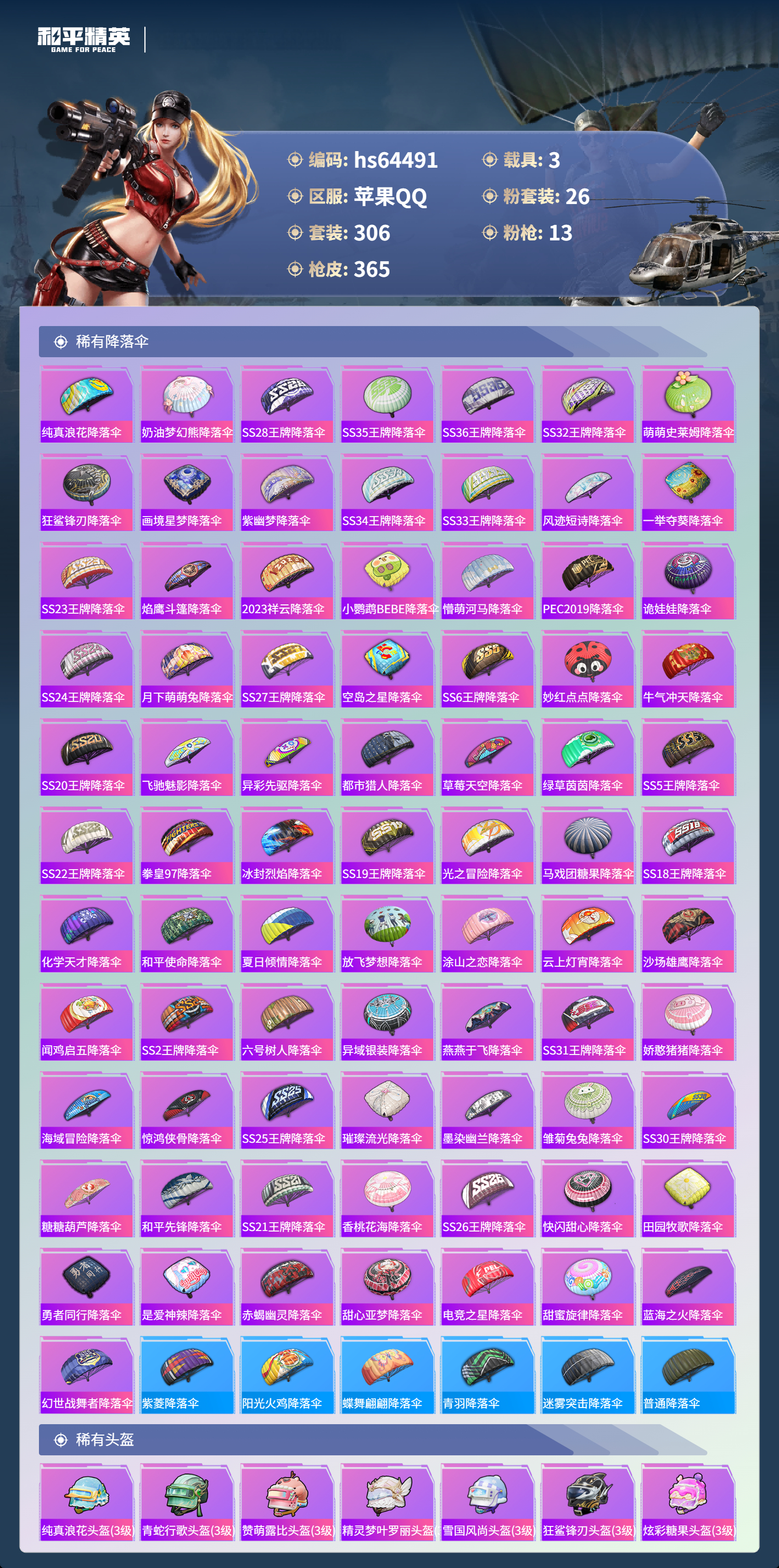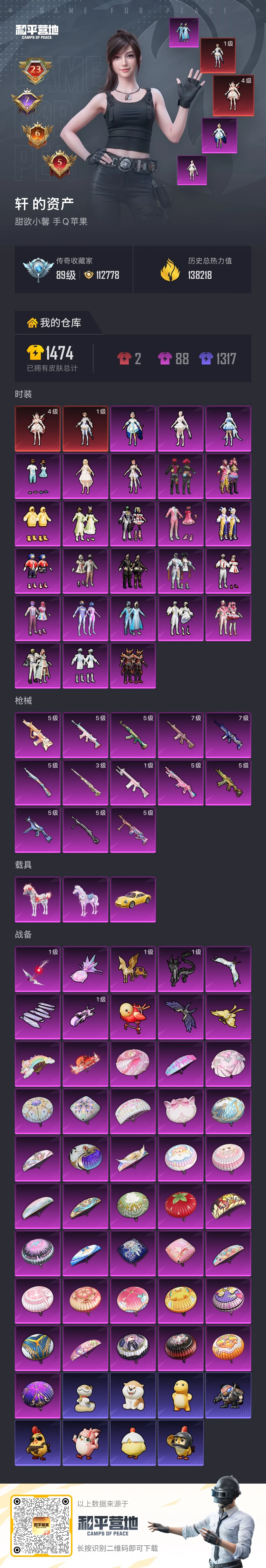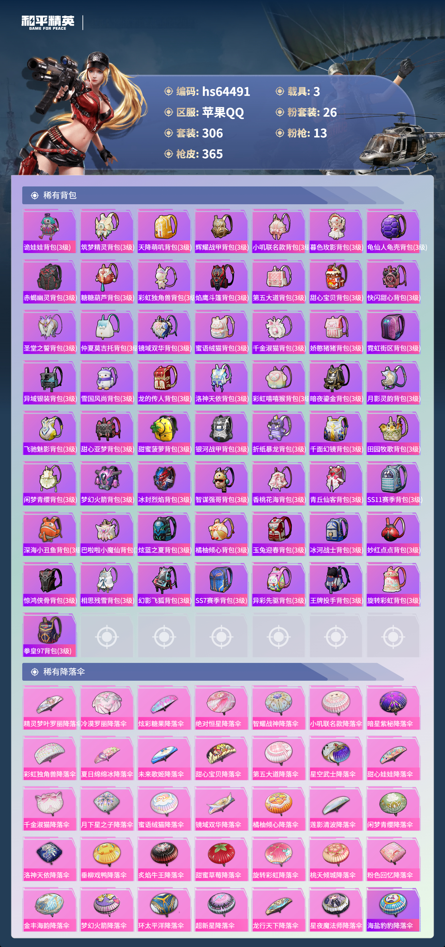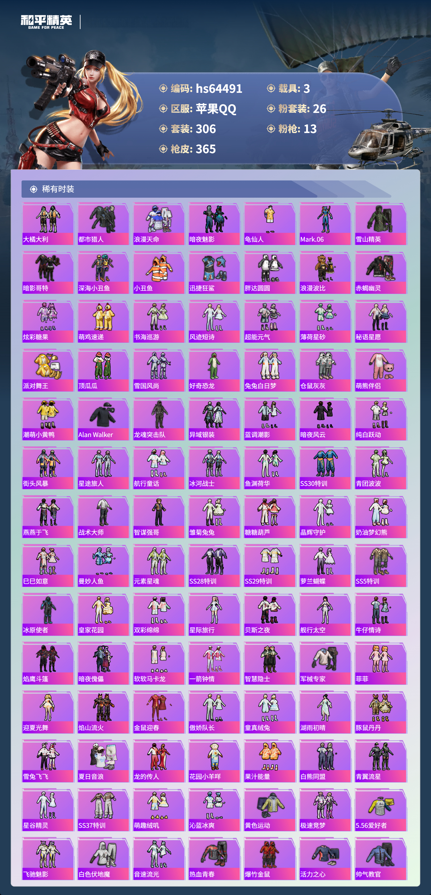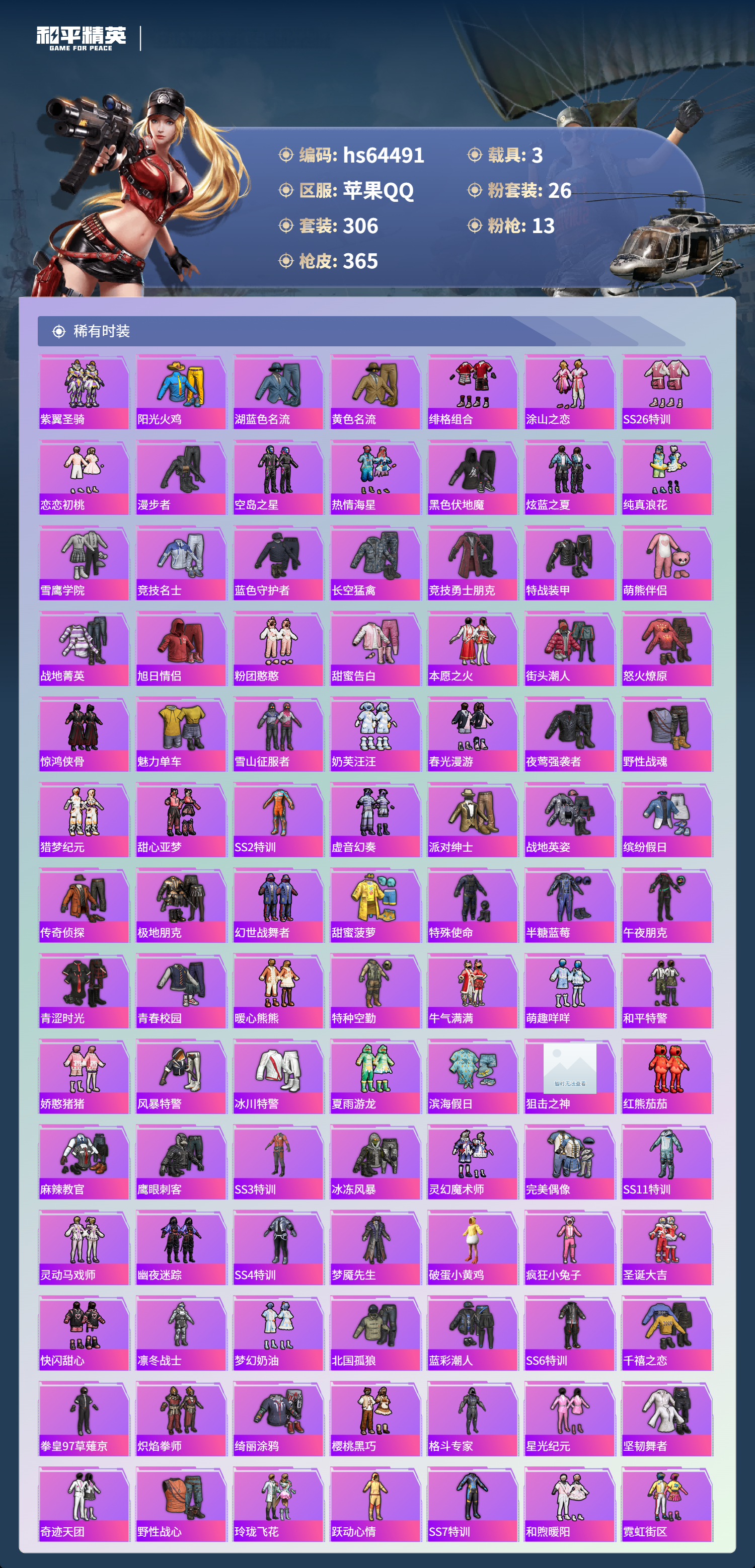 hs64491 苹果手Q-23王牌印记-有战神框-2红装-26粉装-13特效枪-3载具-热力值-306套装-365枪皮-7卓越印记-6传奇印记