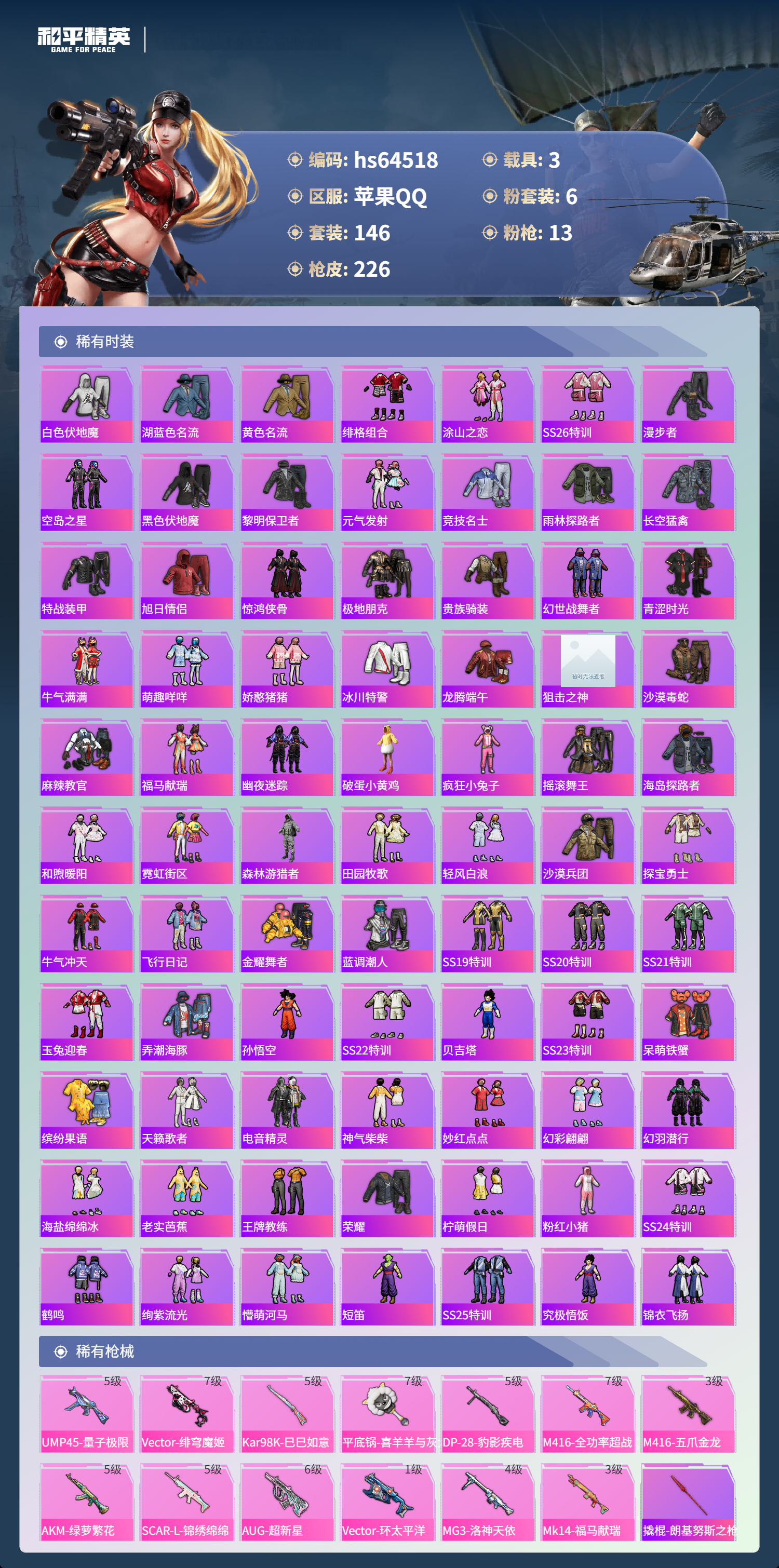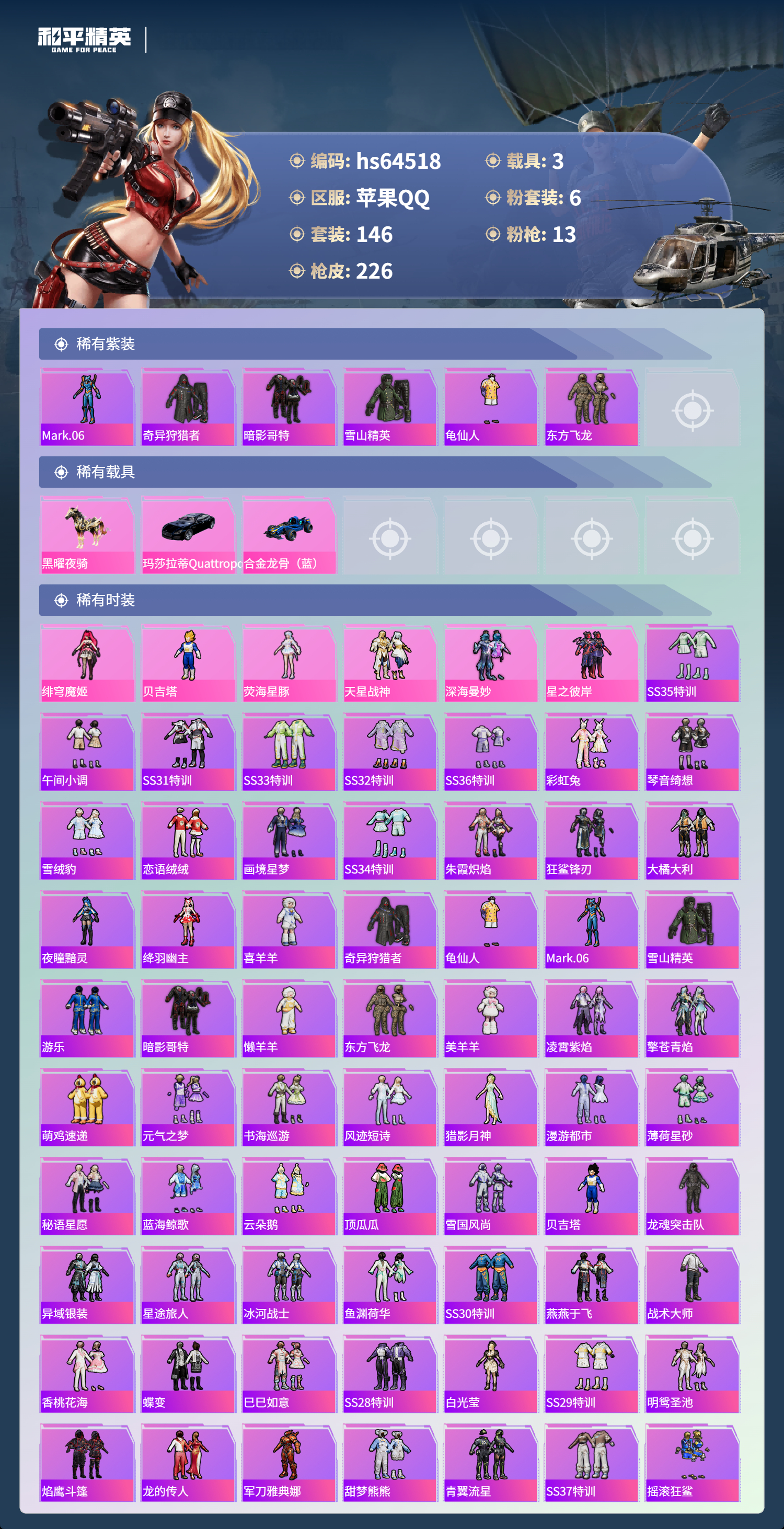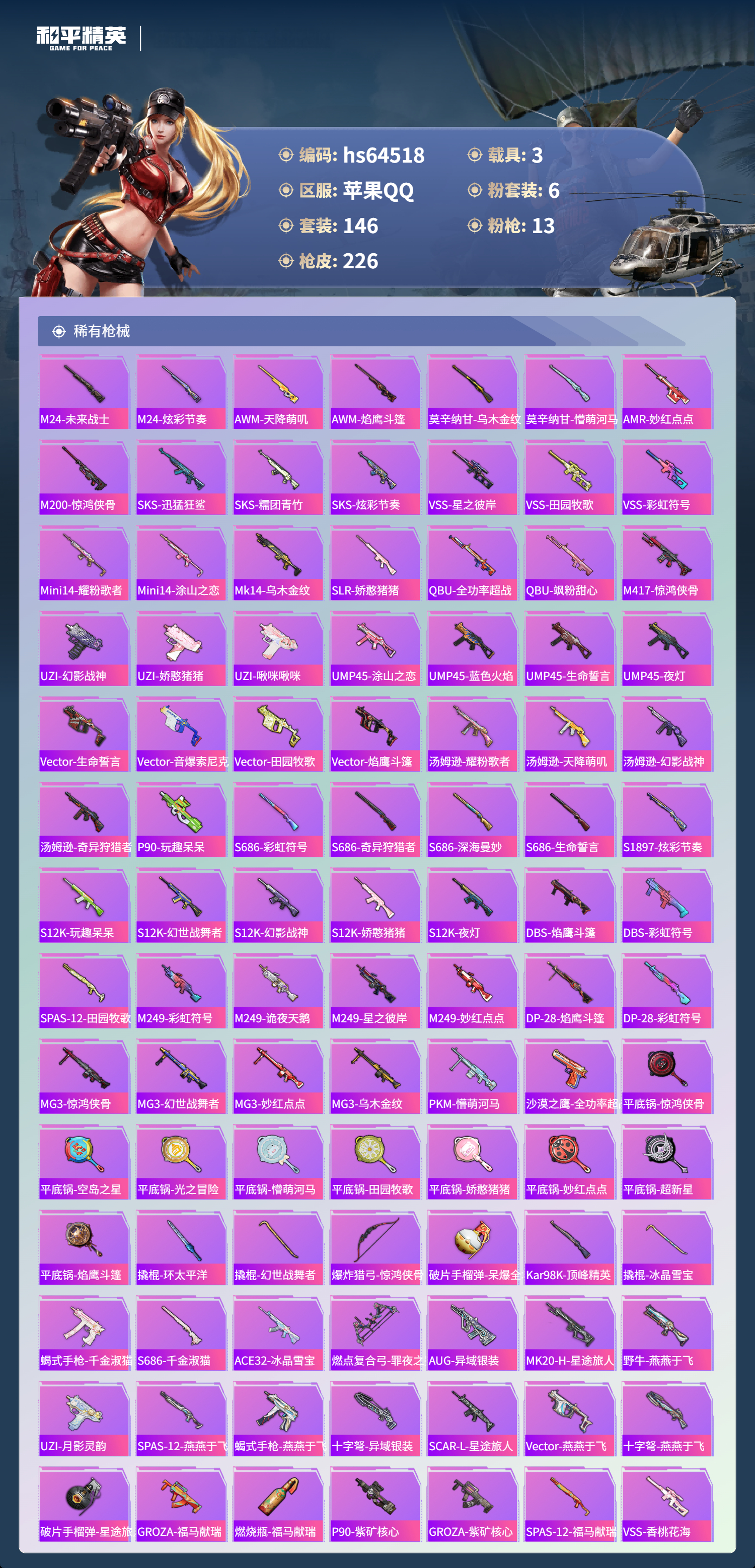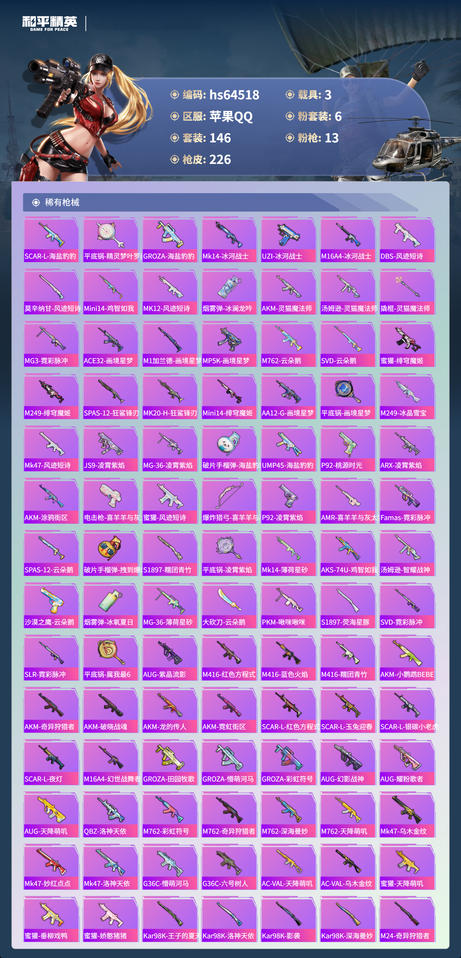 hs64518 苹果手Q-16王牌印记-6粉装-13特效枪-3载具-71841热力值-146套装-226枪皮-1卓越印记