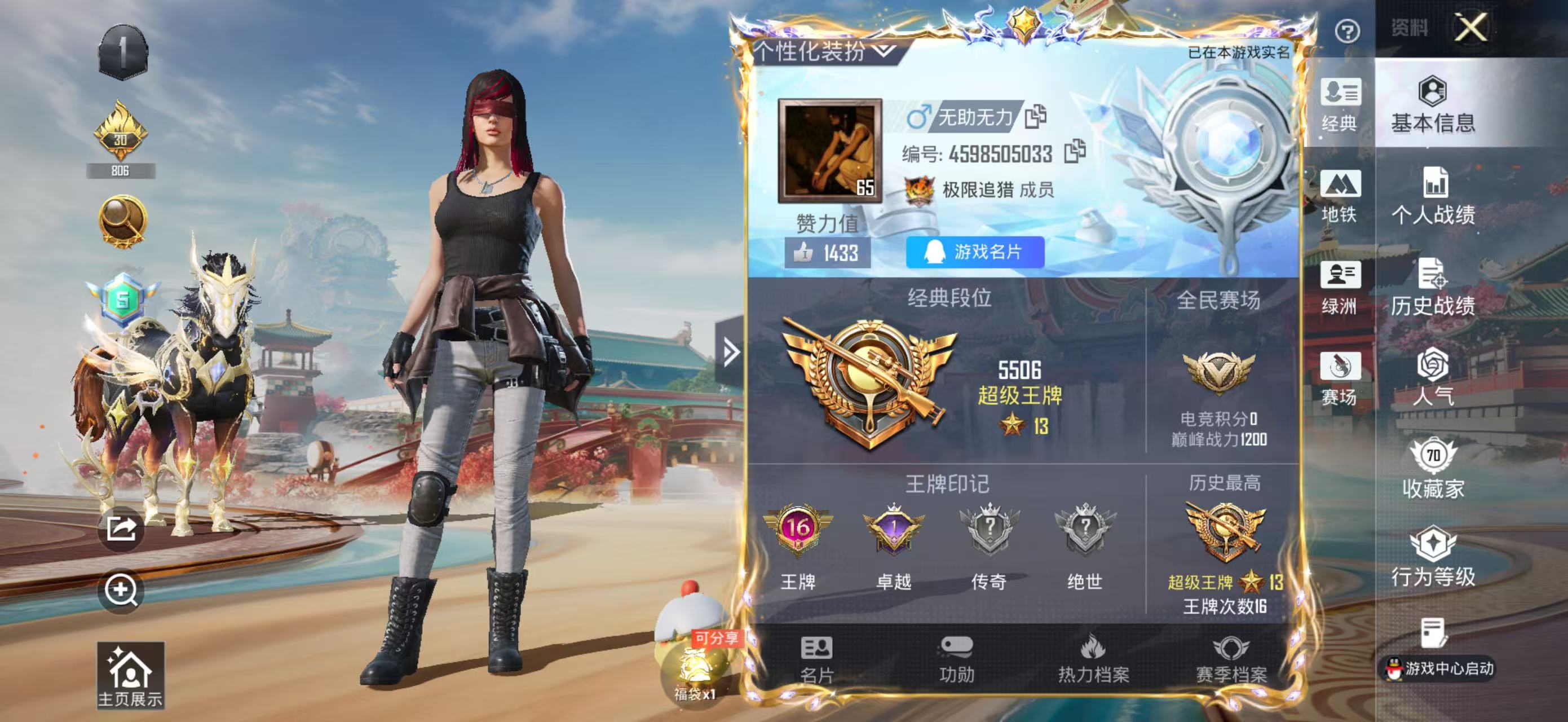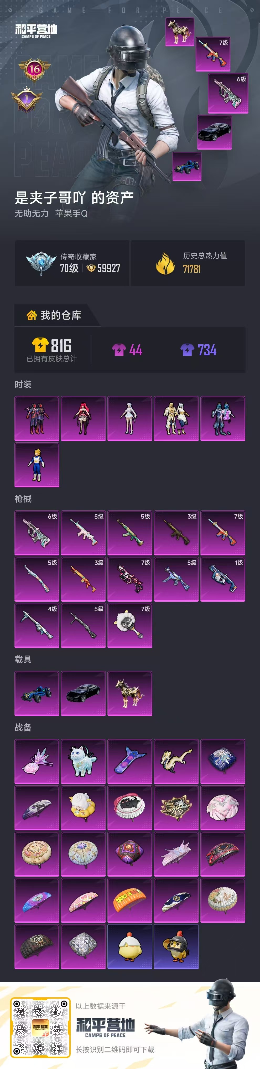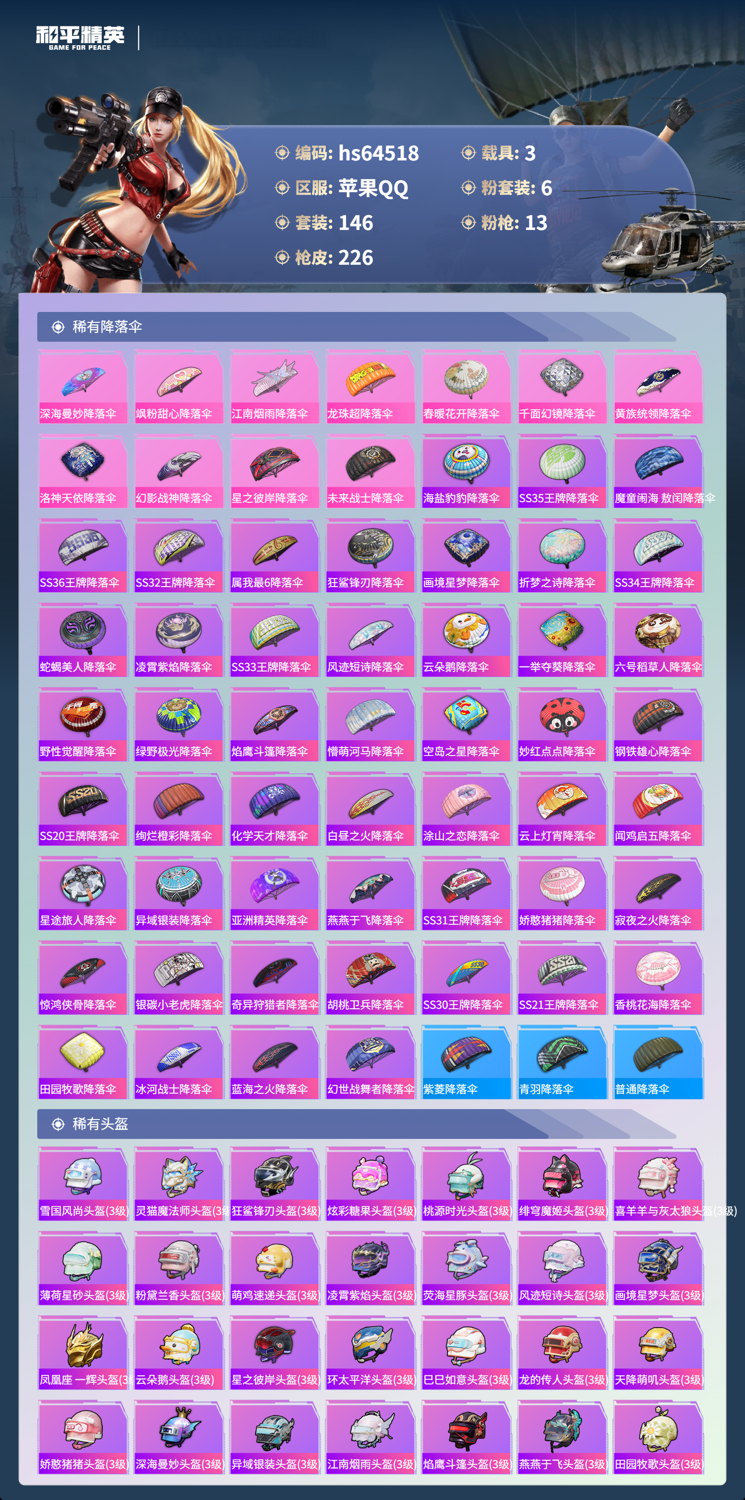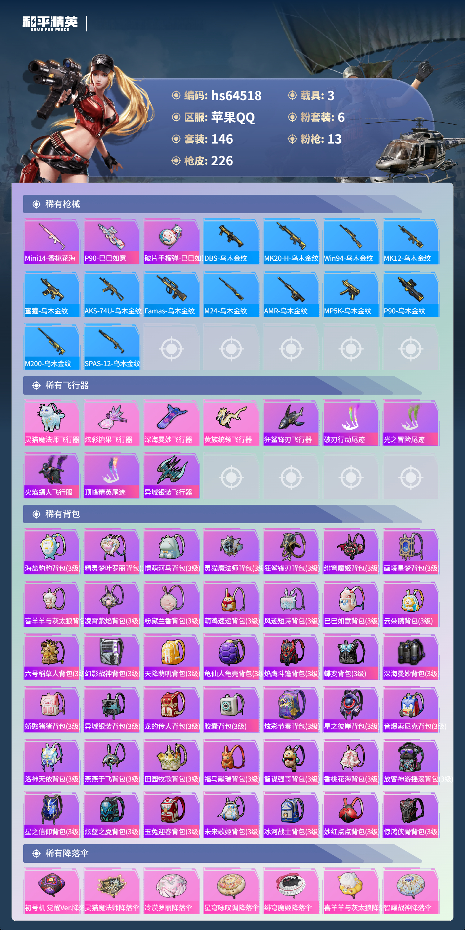 hs64518 苹果手Q-16王牌印记-6粉装-13特效枪-3载具-71841热力值-146套装-226枪皮-1卓越印记