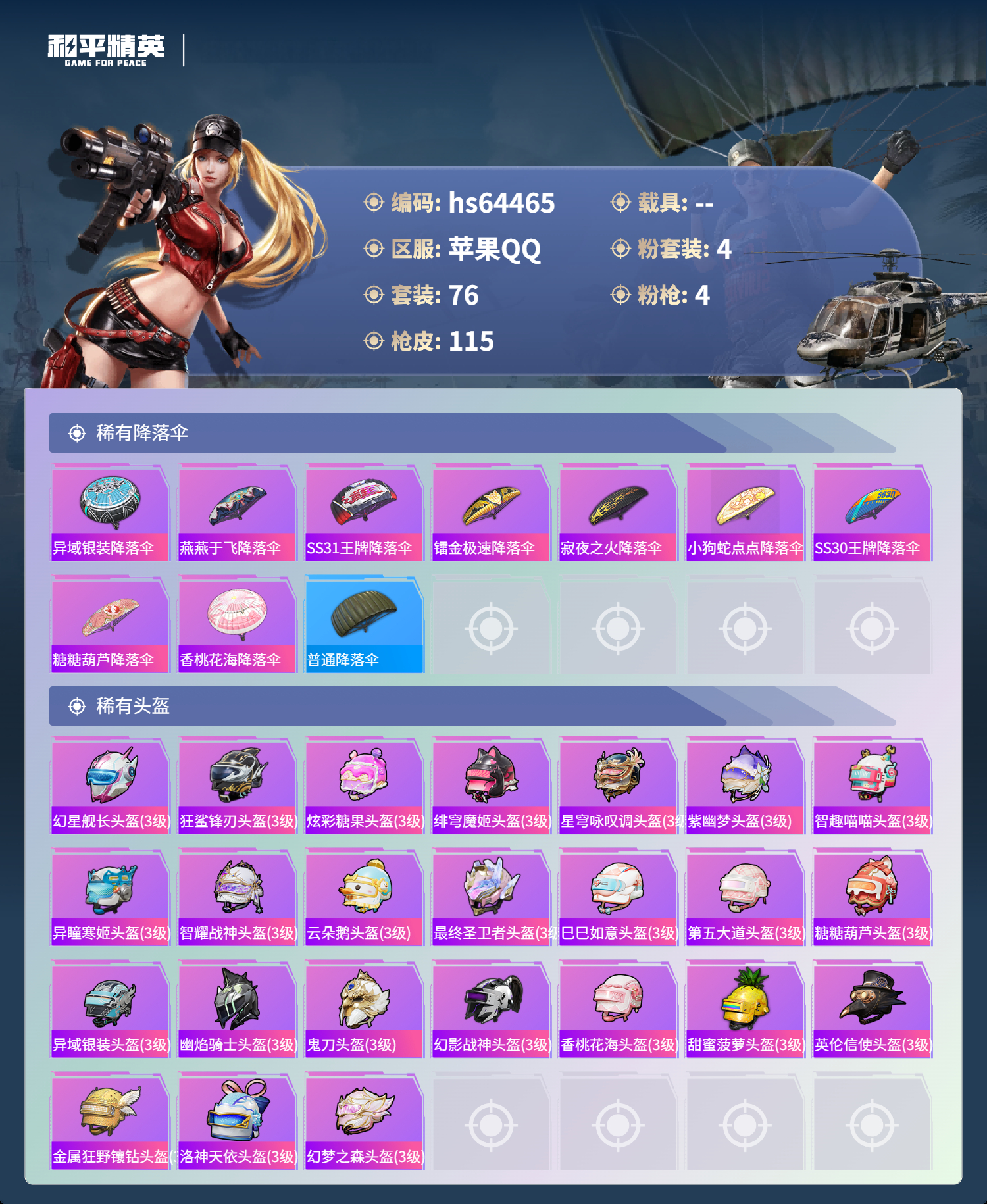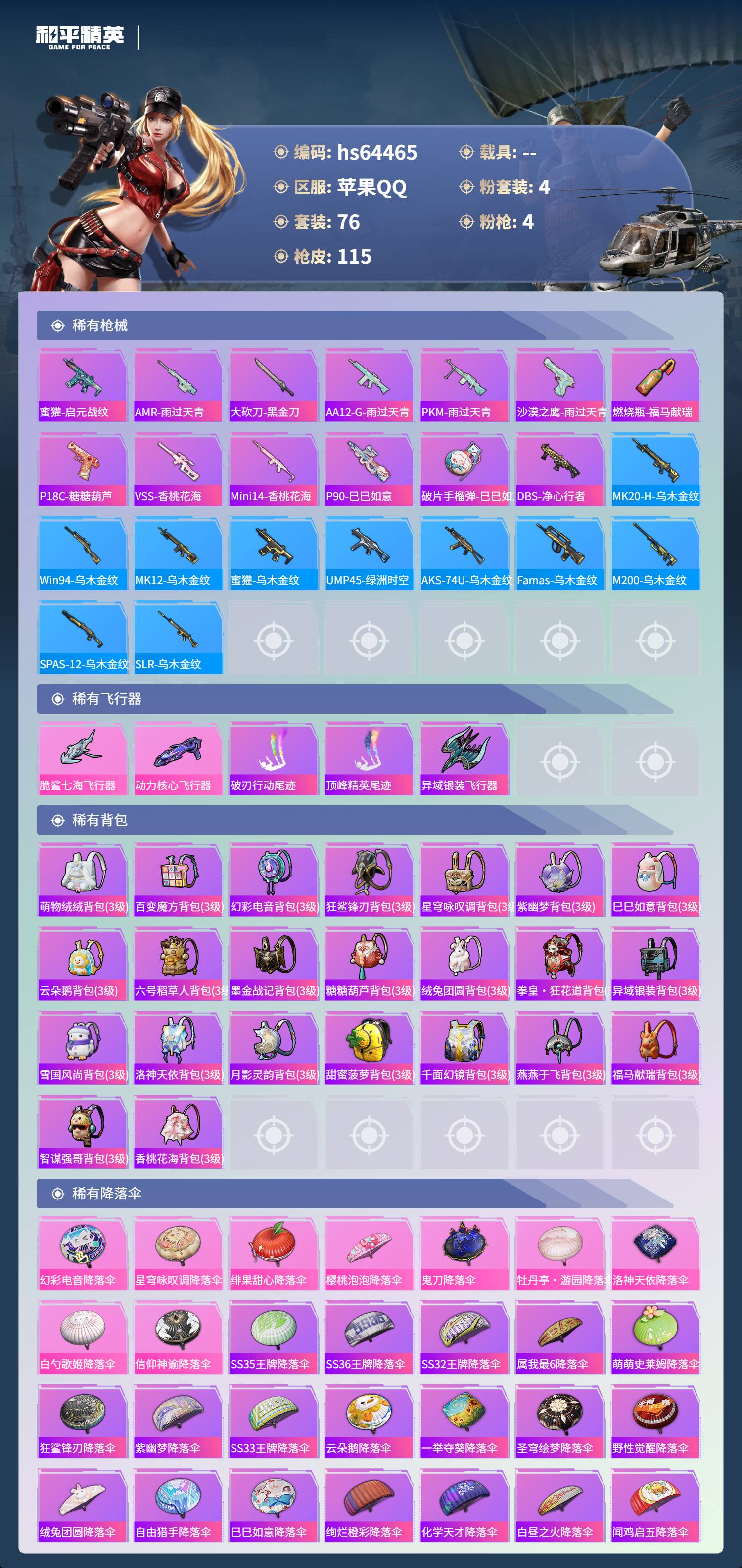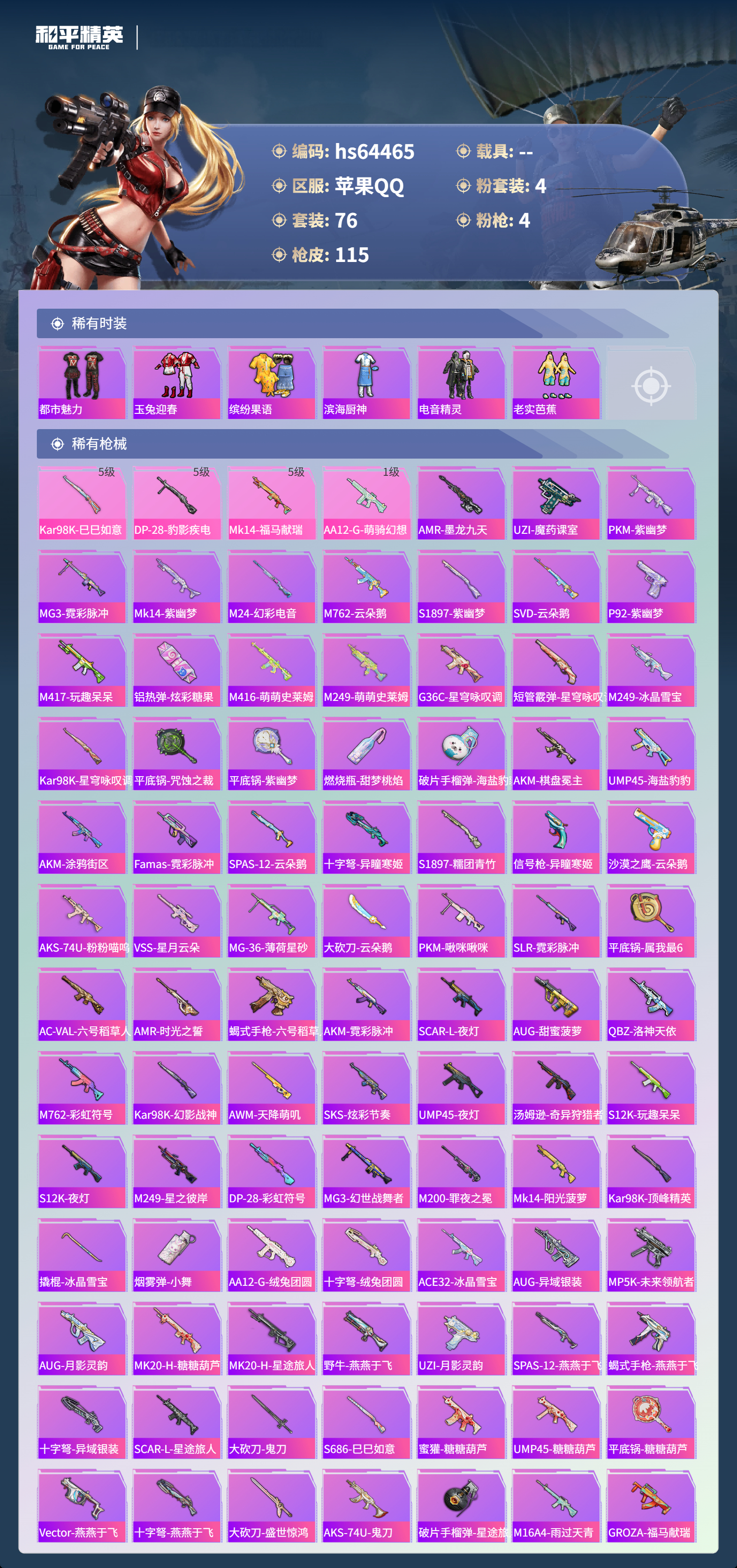 hs64465 苹果手Q-7王牌印记-1红装-4粉装-4特效枪-37983热力值-76套装-115枪皮-4卓越印记-2传奇印记