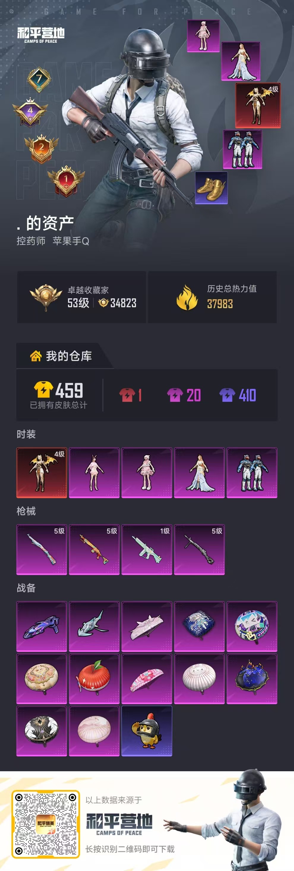 7王牌印记-1红装-4粉装-4特效枪-37983热力值-76套装-115枪皮-4卓越印记-2传奇印记
