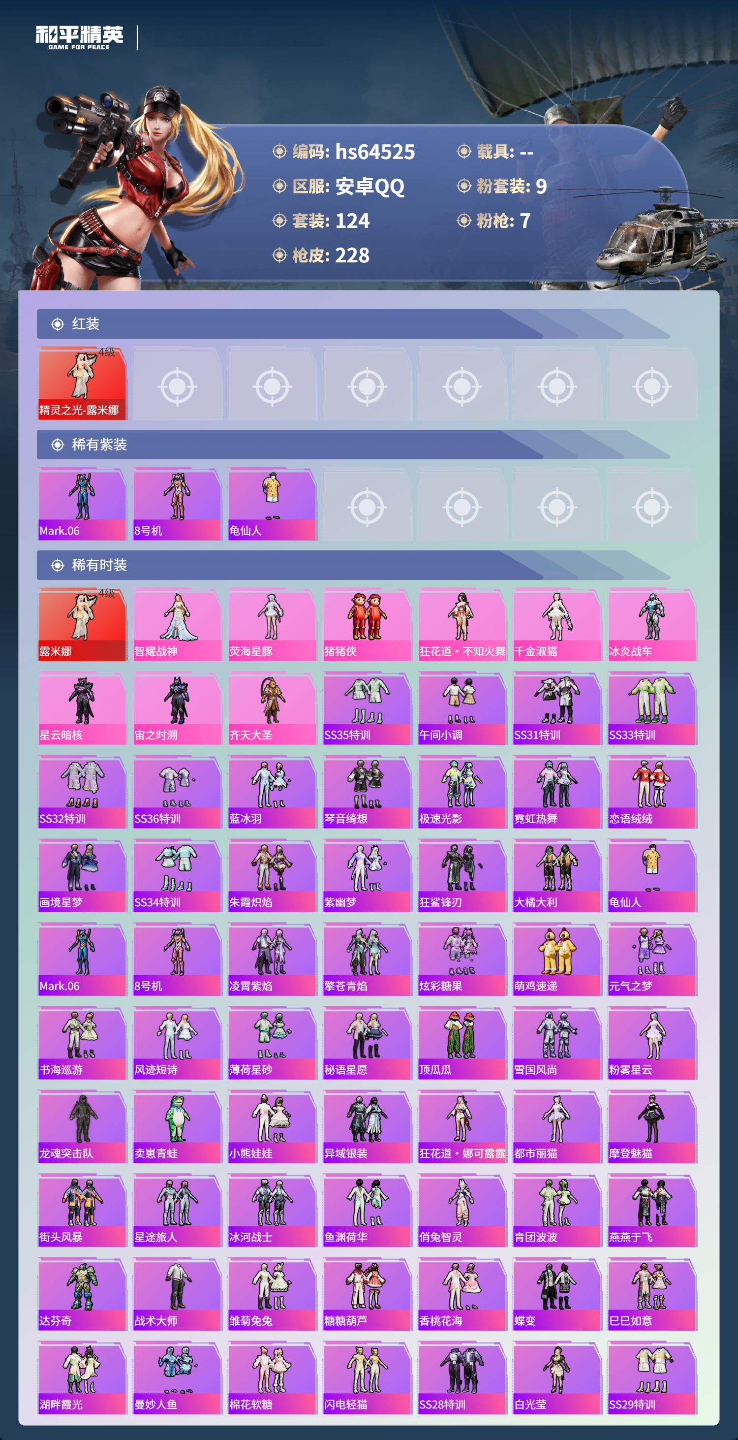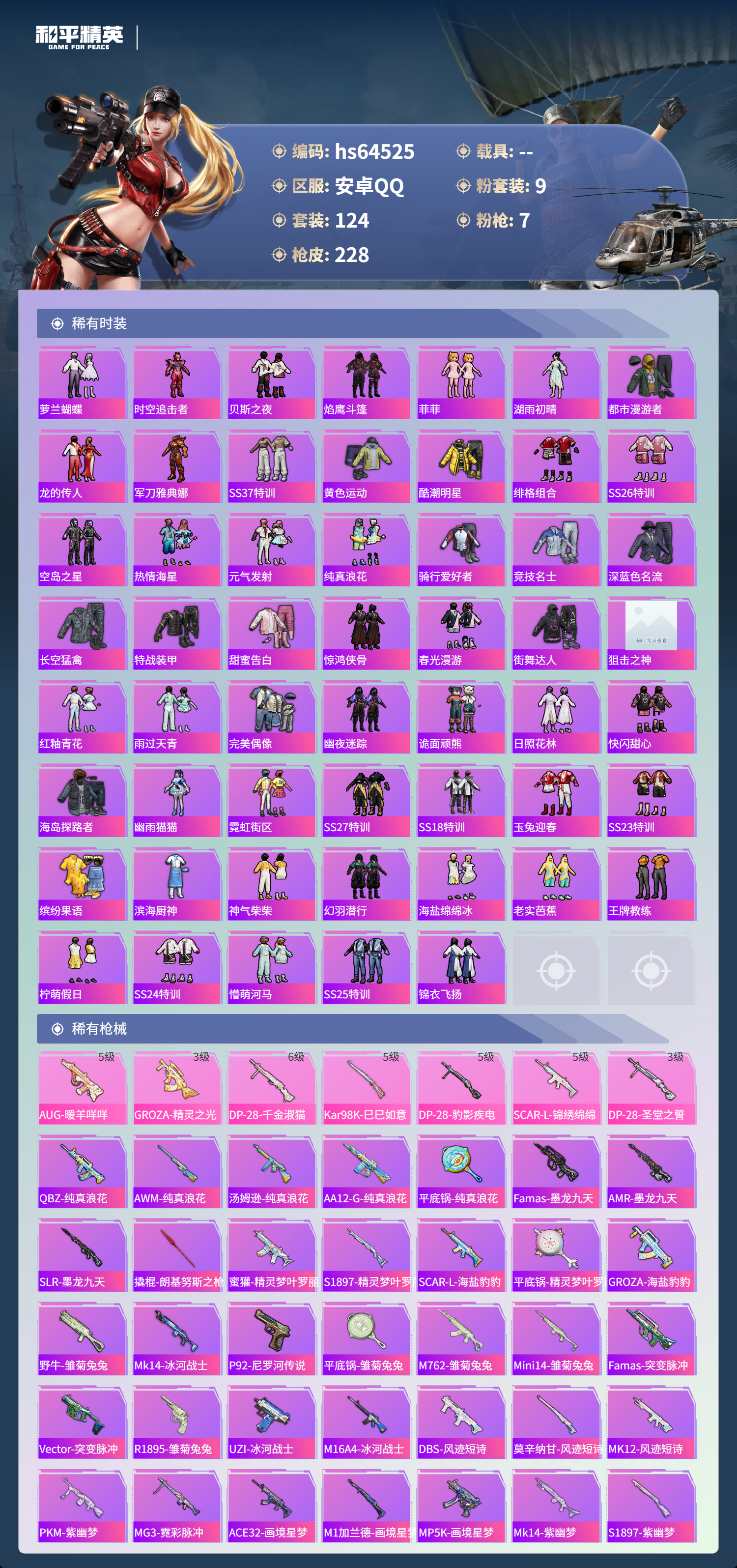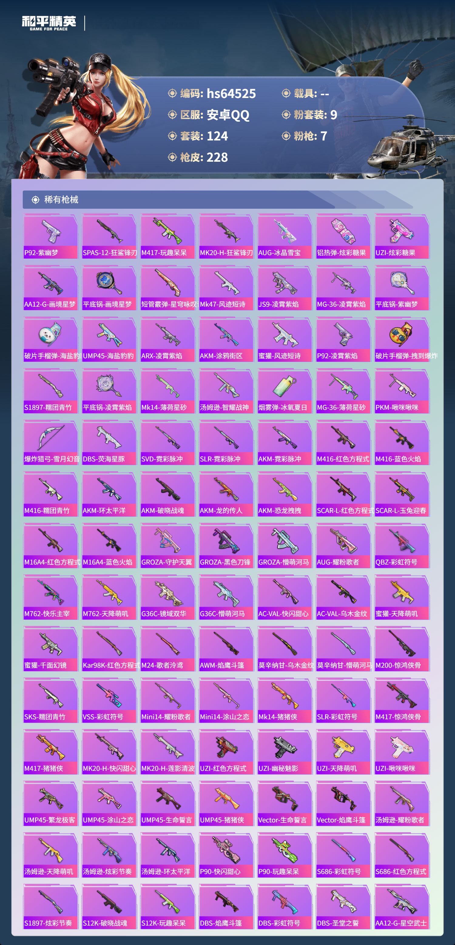 hs64525 安卓手Q-5王牌印记-1红装-9粉装-7特效枪-70020热力值-124套装-228枪皮
