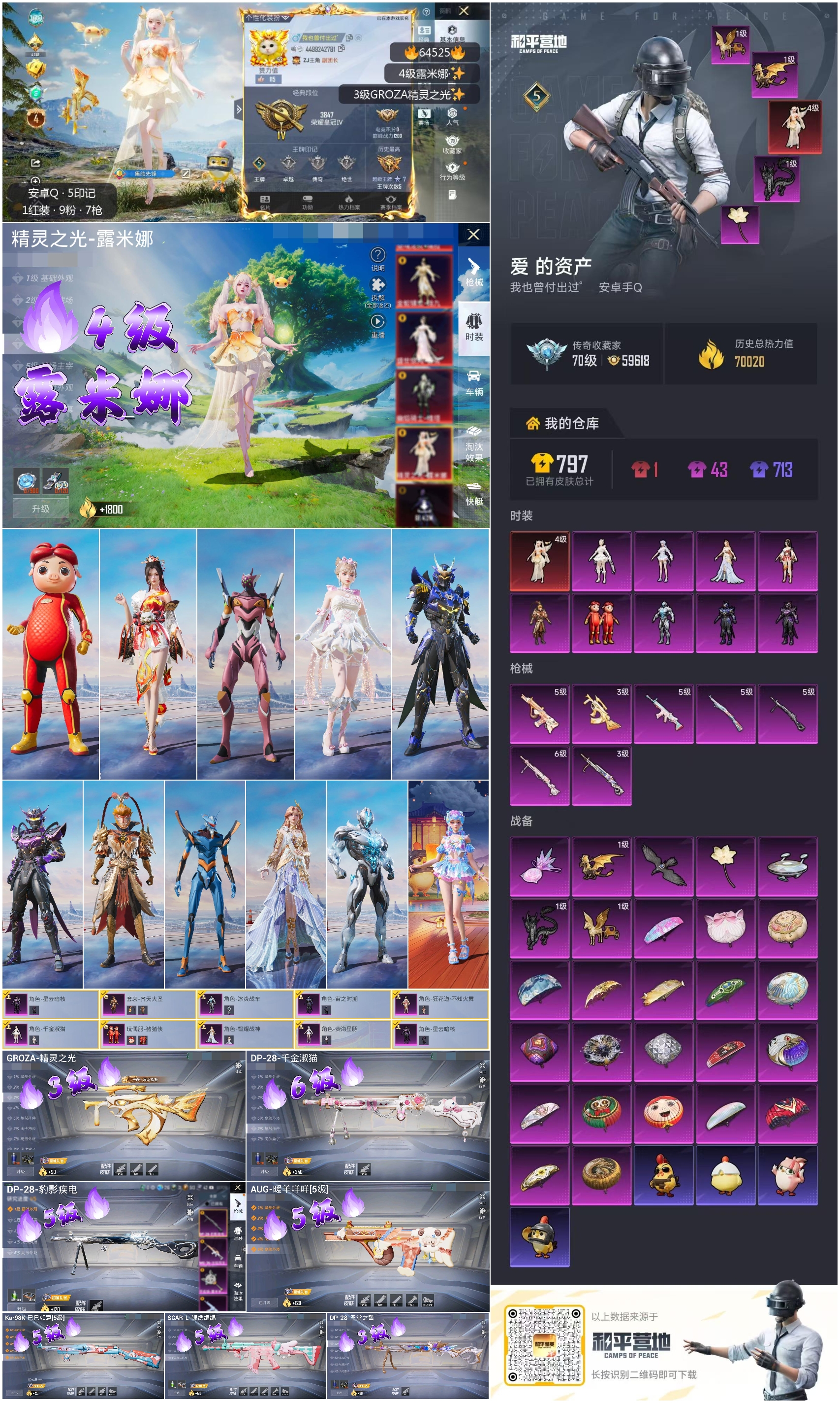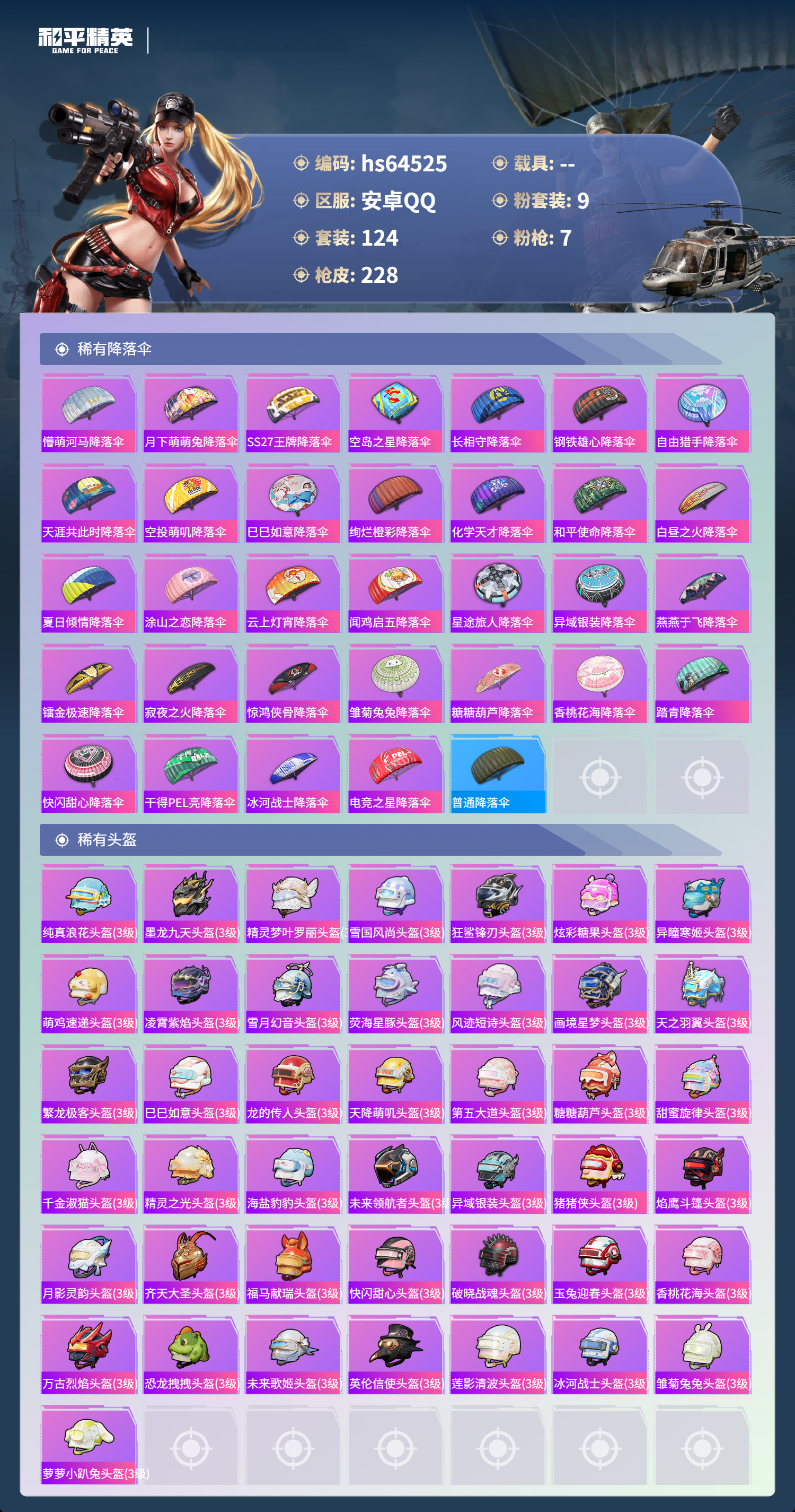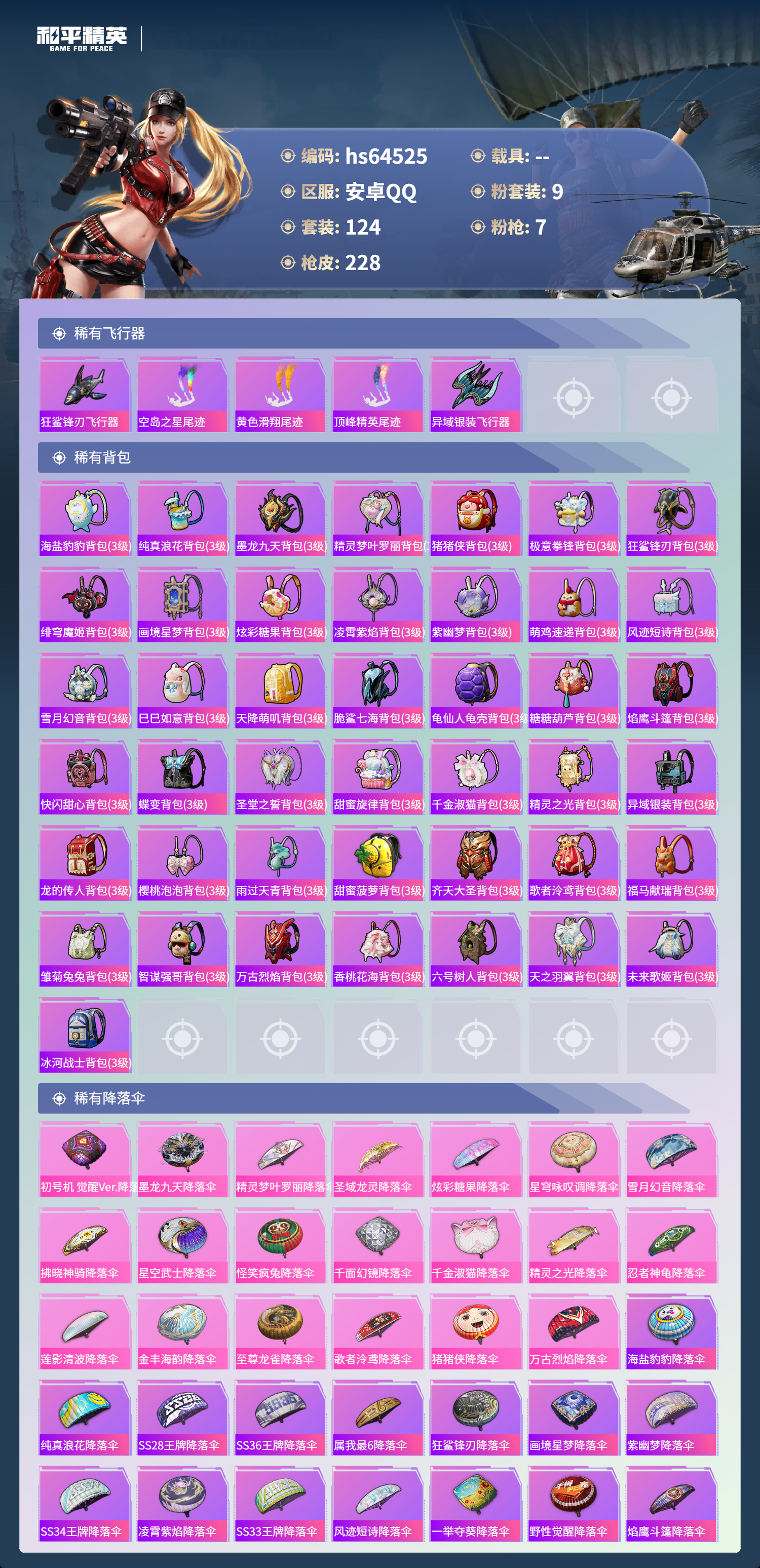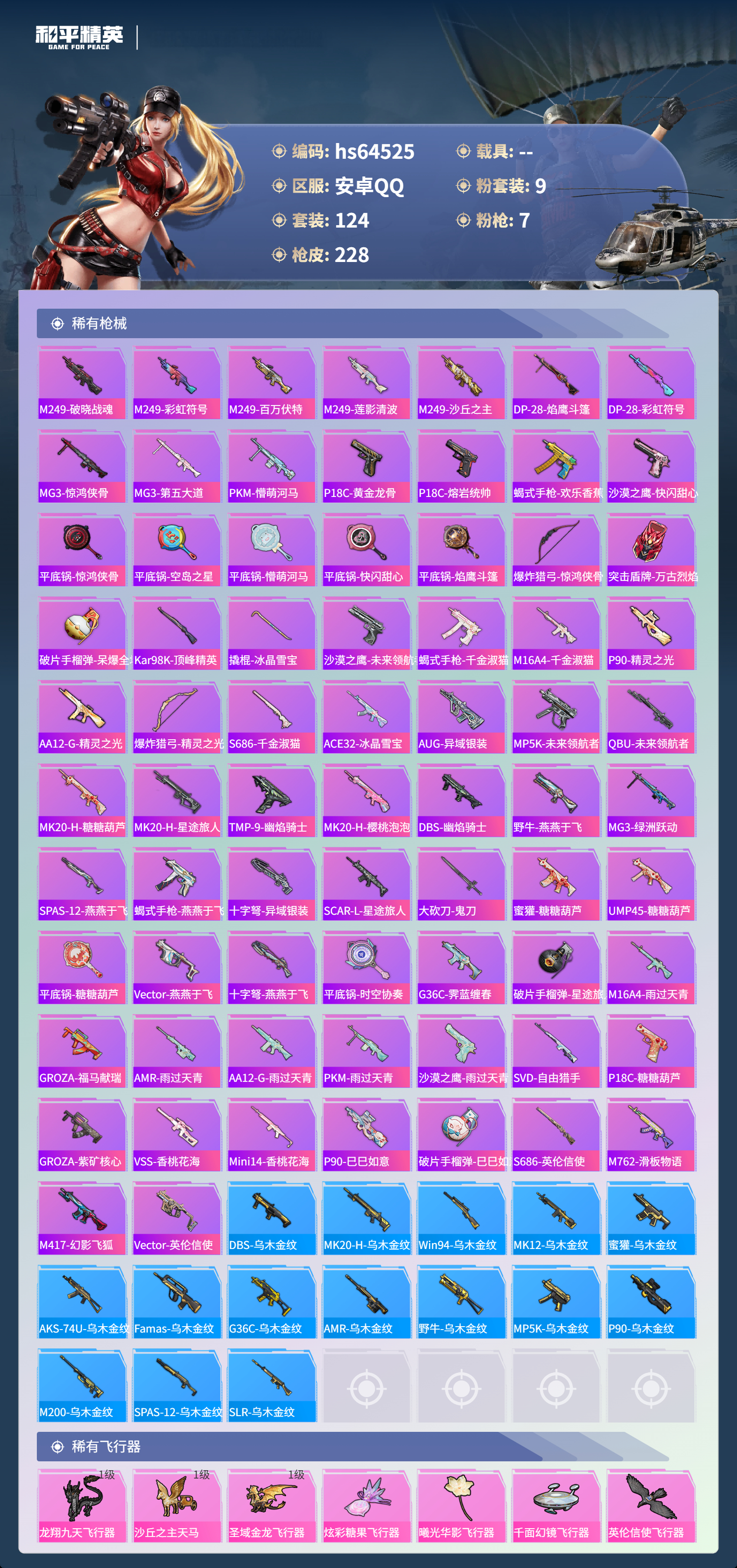 hs64525 安卓手Q-5王牌印记-1红装-9粉装-7特效枪-70020热力值-124套装-228枪皮
