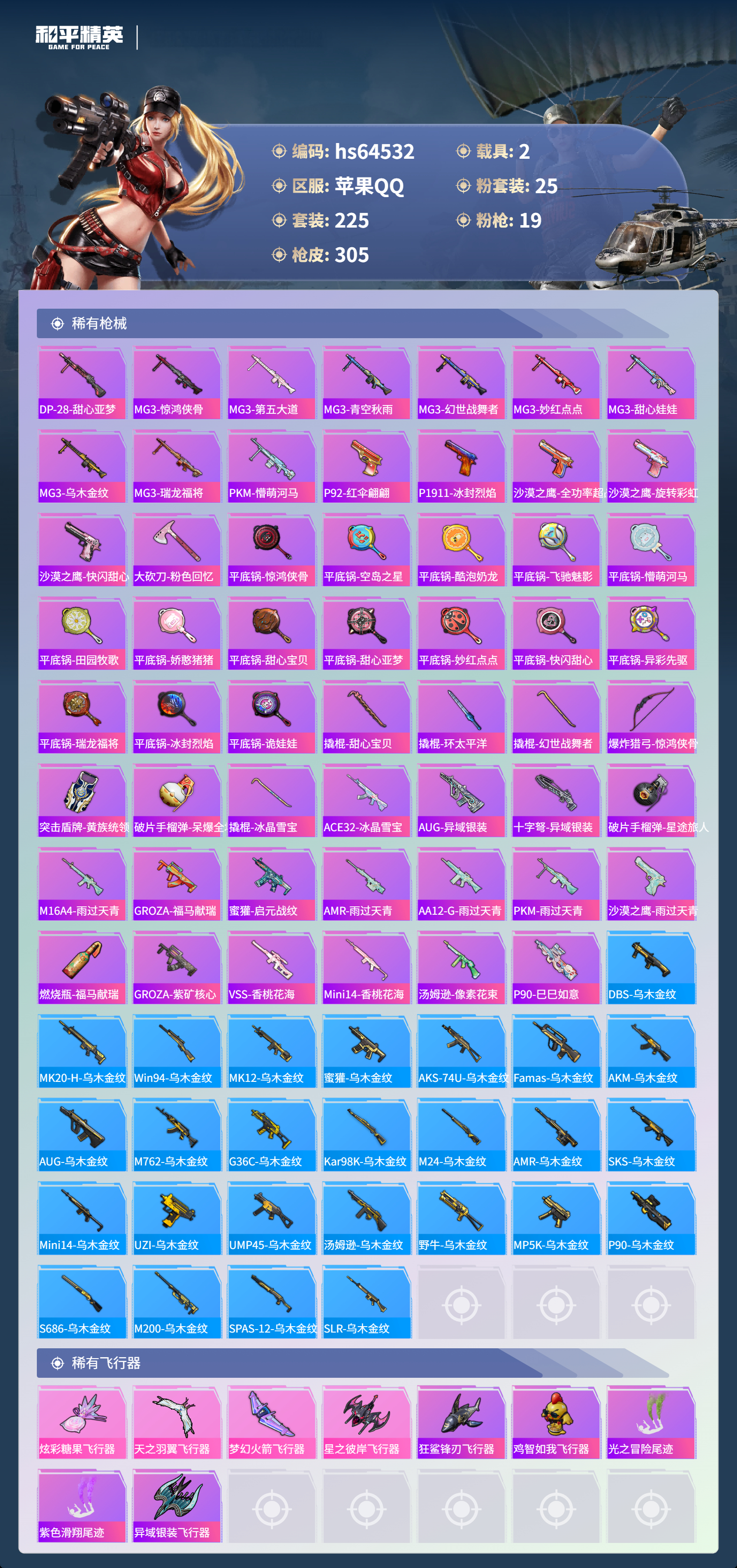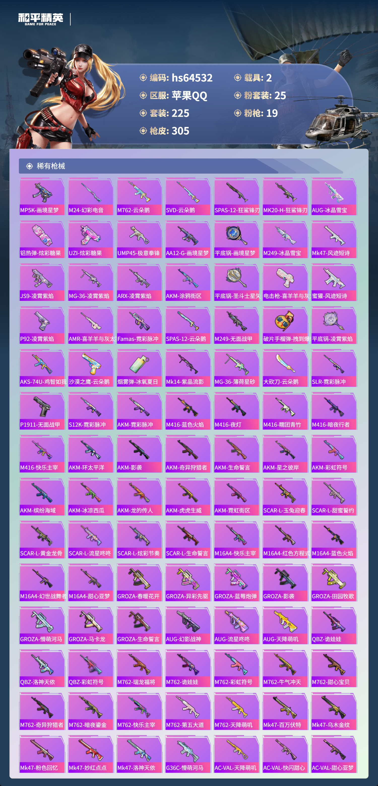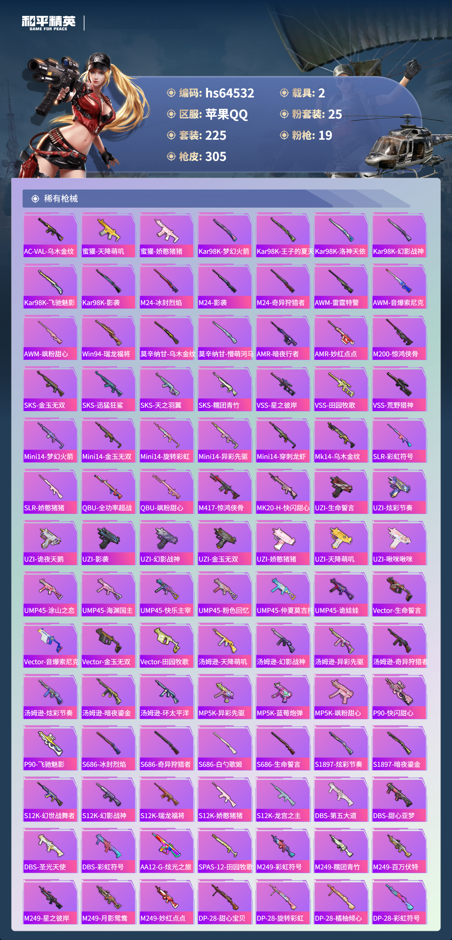 hs64532 苹果手Q-14王牌印记-25粉装-19特效枪-2载具-热力值-225套装-305枪皮-2卓越印记