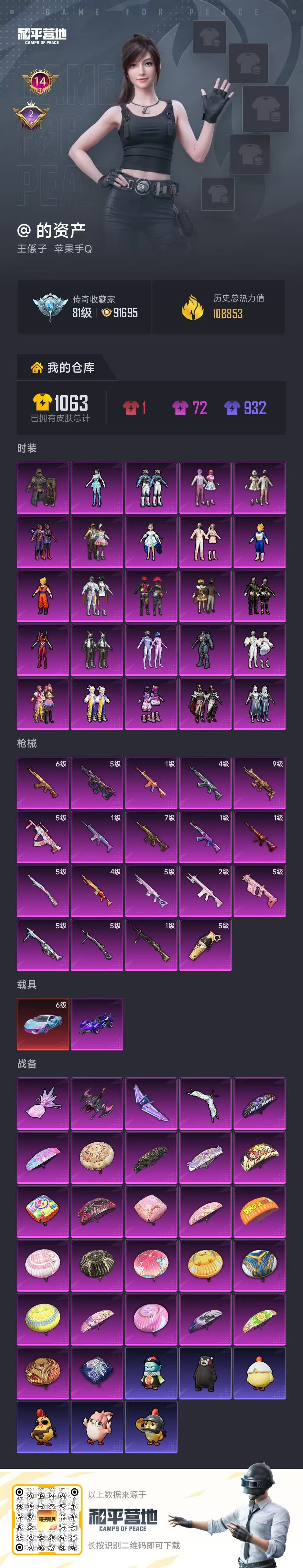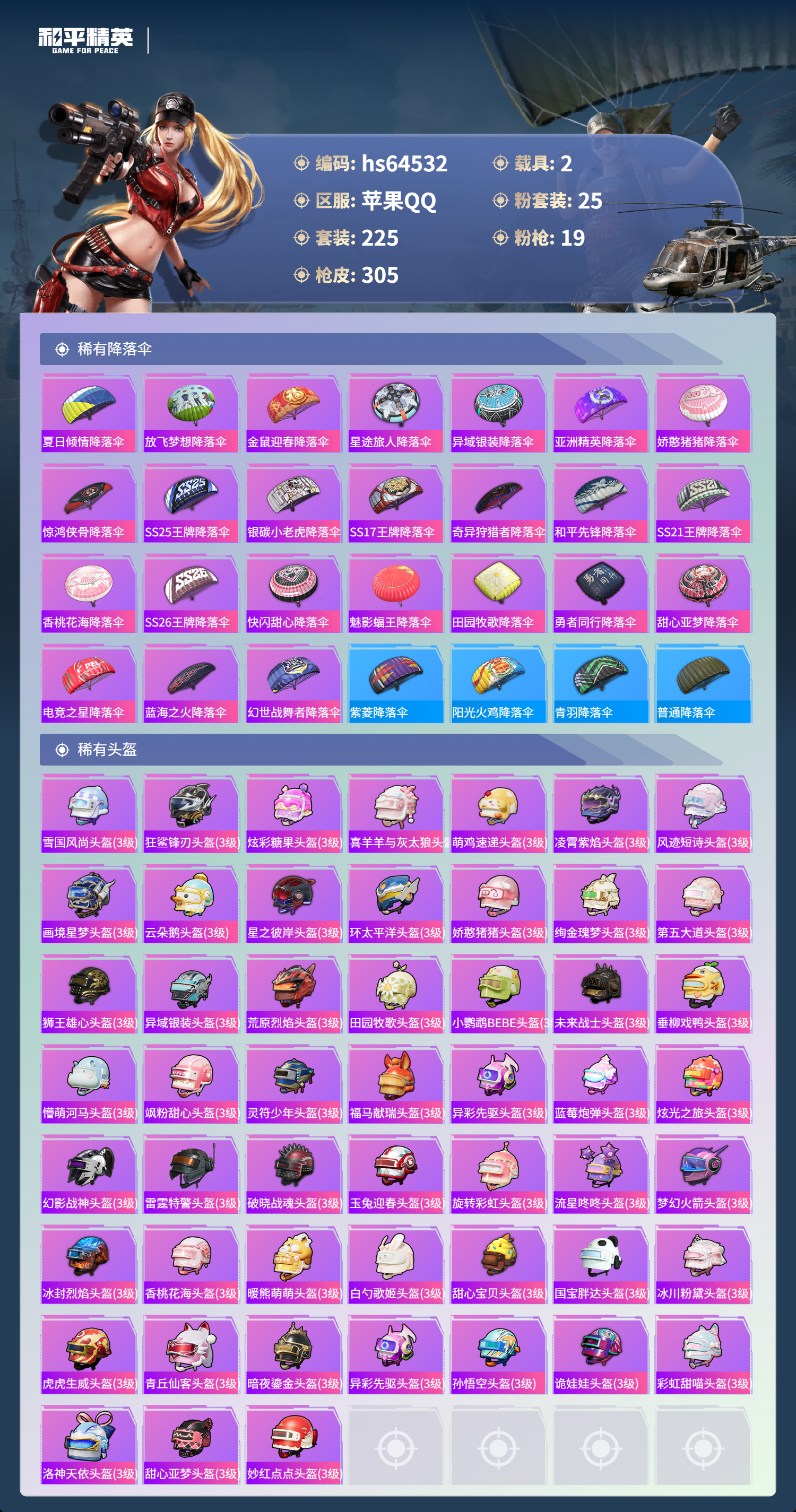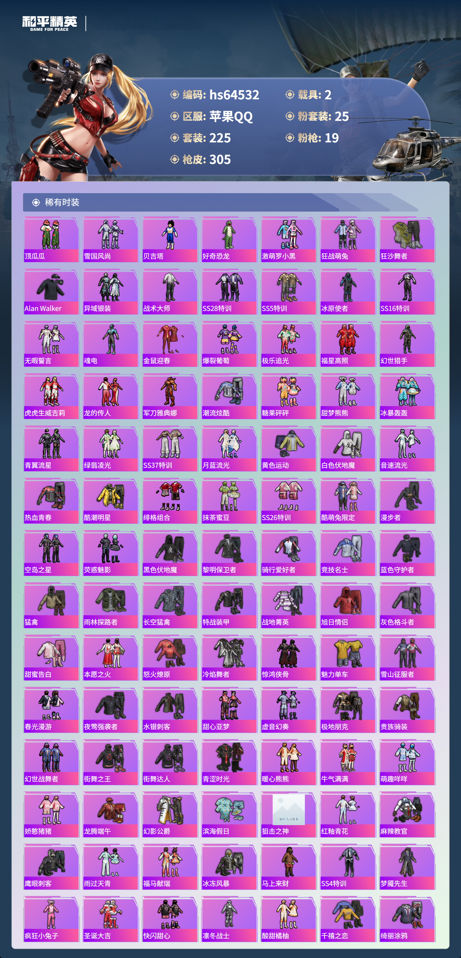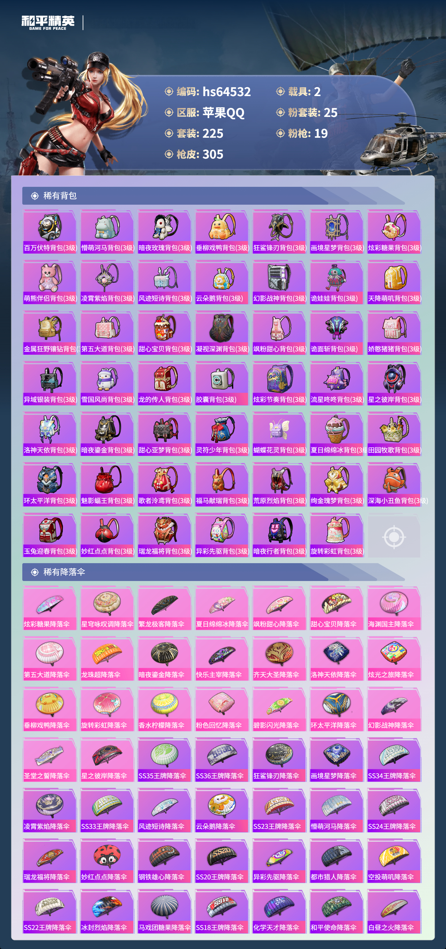 hs64532 苹果手Q-14王牌印记-25粉装-19特效枪-2载具-热力值-225套装-305枪皮-2卓越印记