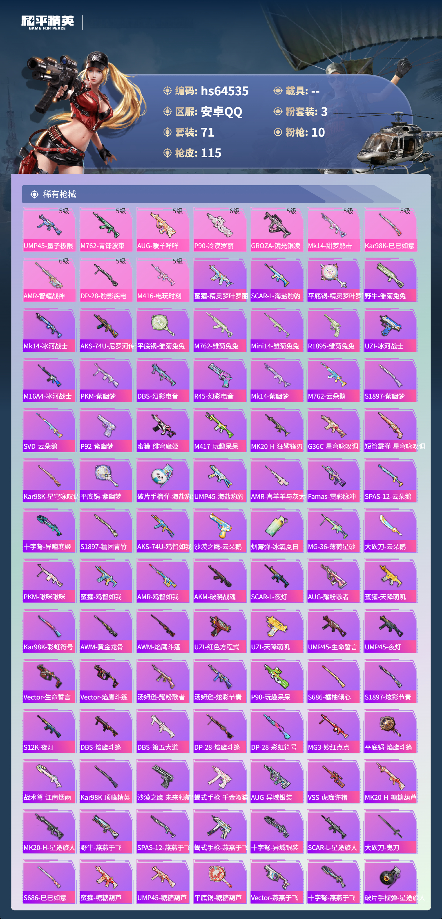 hs64535 安卓手Q-8王牌印记-3粉装-10特效枪-34340热力值-71套装-115枪皮-6卓越印记-2传奇印记