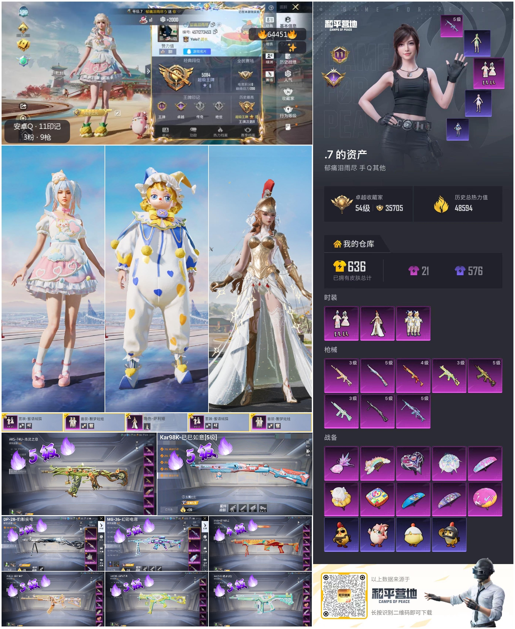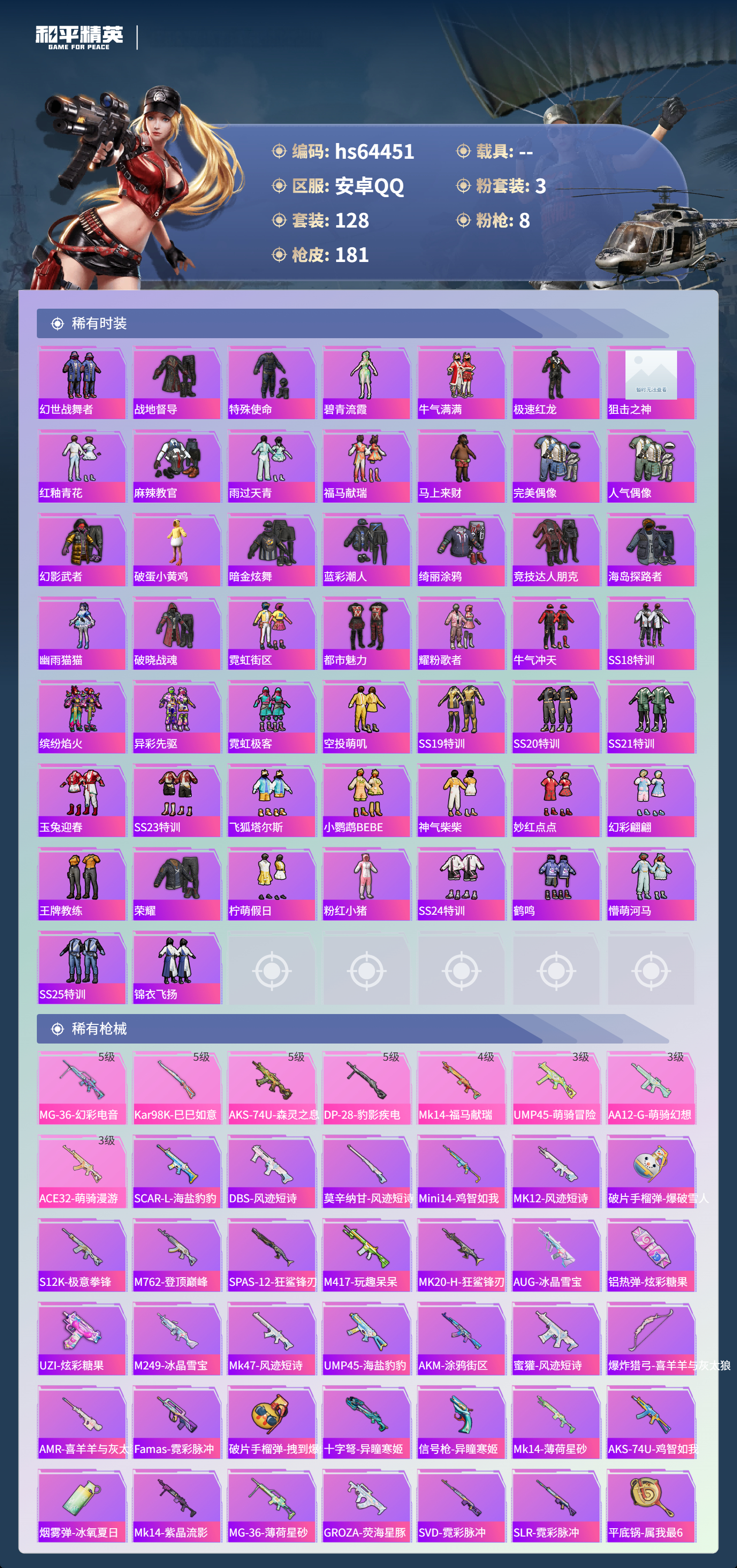 hs64451 安卓手Q-11王牌印记-3粉装-8特效枪-48594热力值-128套装-181枪皮-1卓越印记
