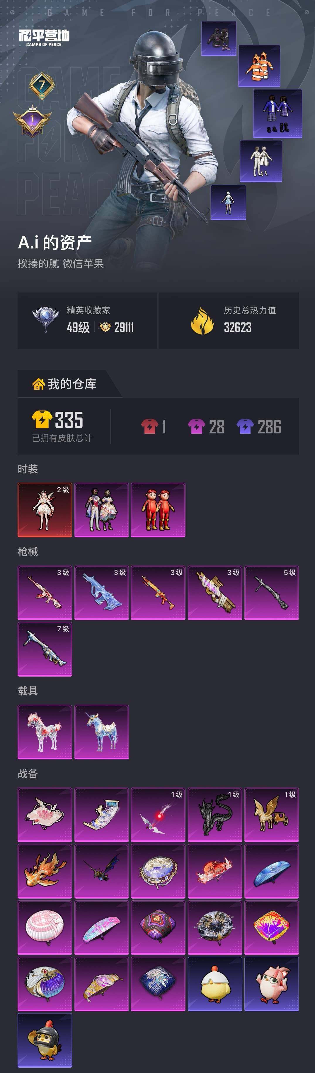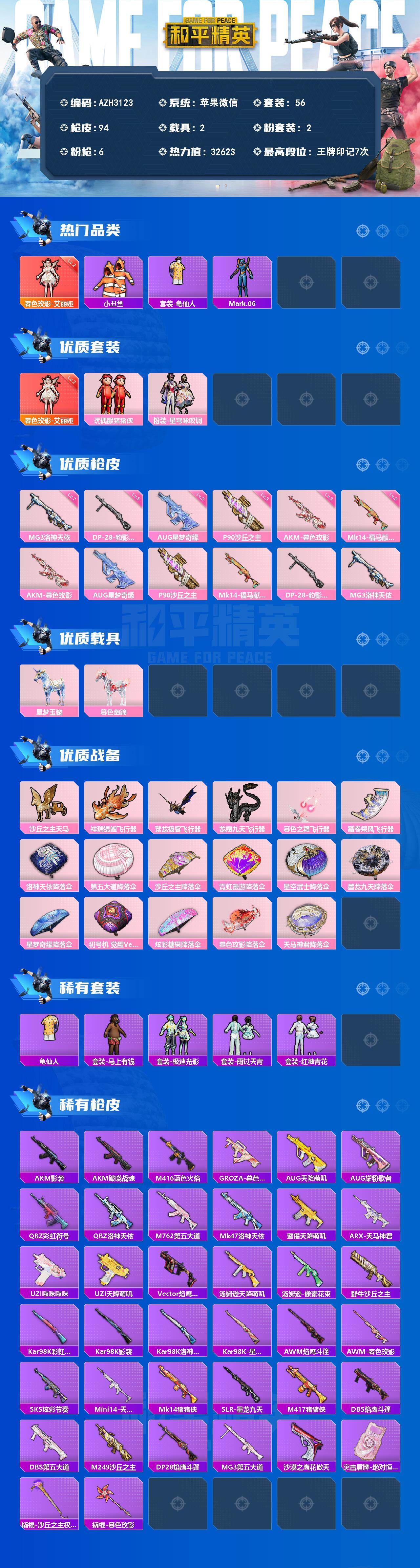 【AZH3123】苹果 微信【二级艾丽娅 猪猪侠小丑鱼 星梦奇缘AUG 满级洛神天依MG3 2载具】1神装-2粉装-6特效枪-2载具-7粉色飞行器-32623热力值-7王牌印记-56套装-94枪皮
