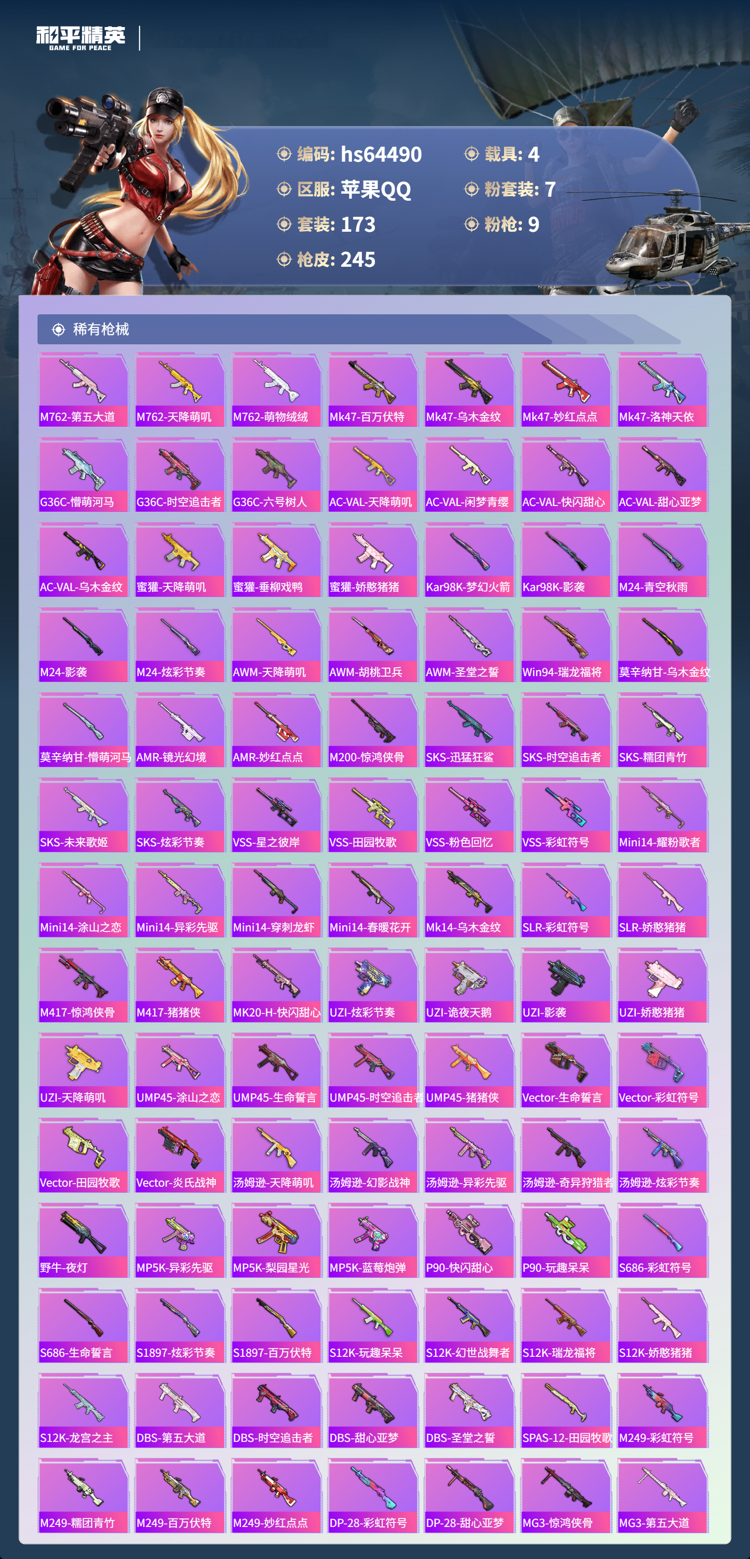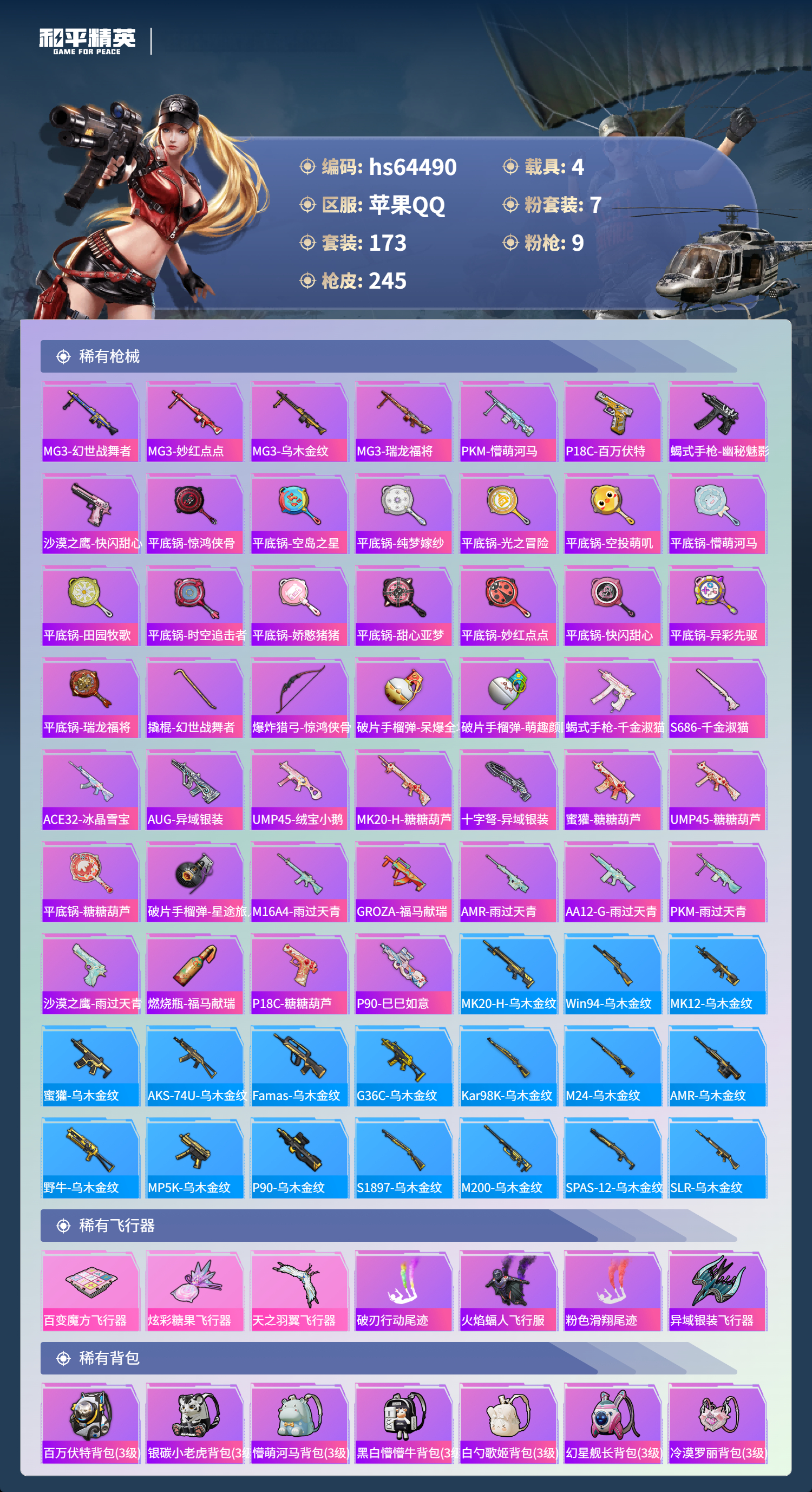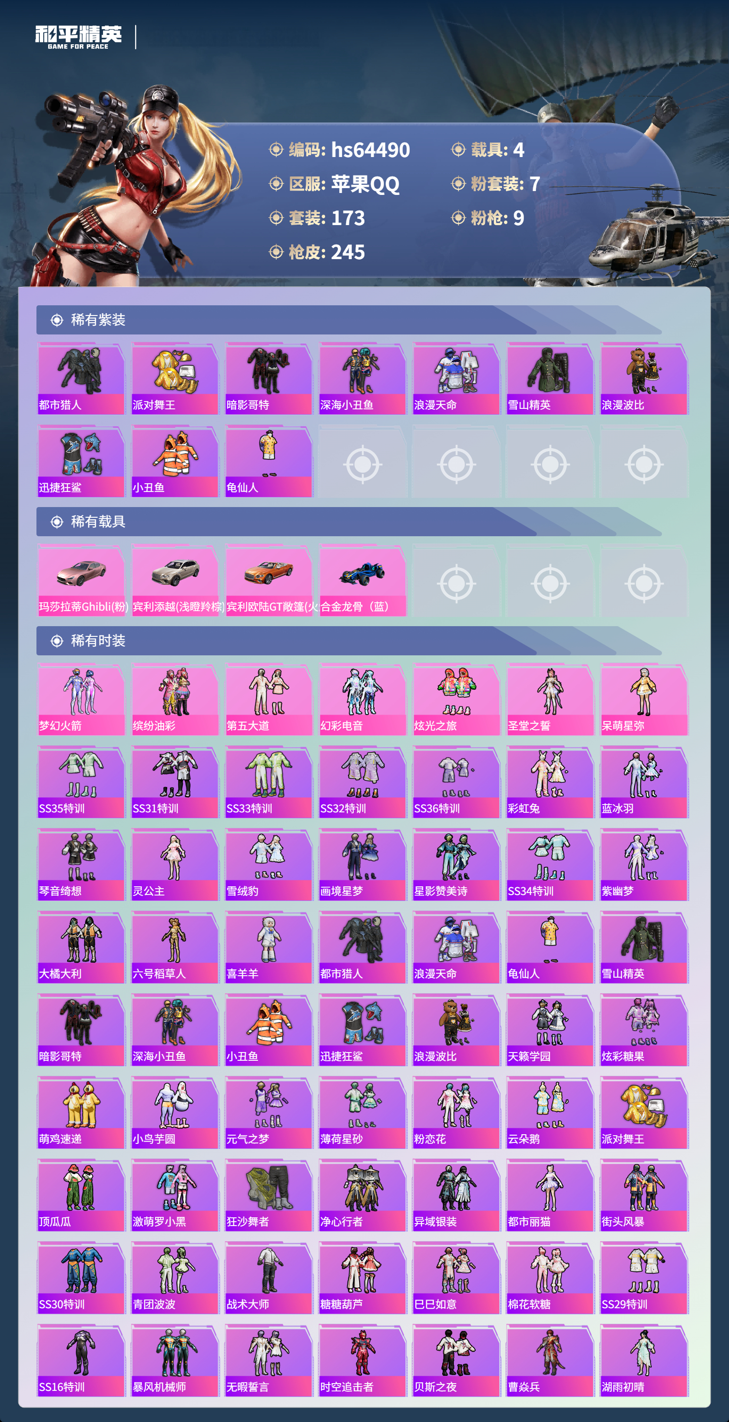 hs64490 苹果手Q-16王牌印记-7粉装-9特效枪-4载具-83258热力值-173套装-245枪皮-3卓越印记-1传奇印记