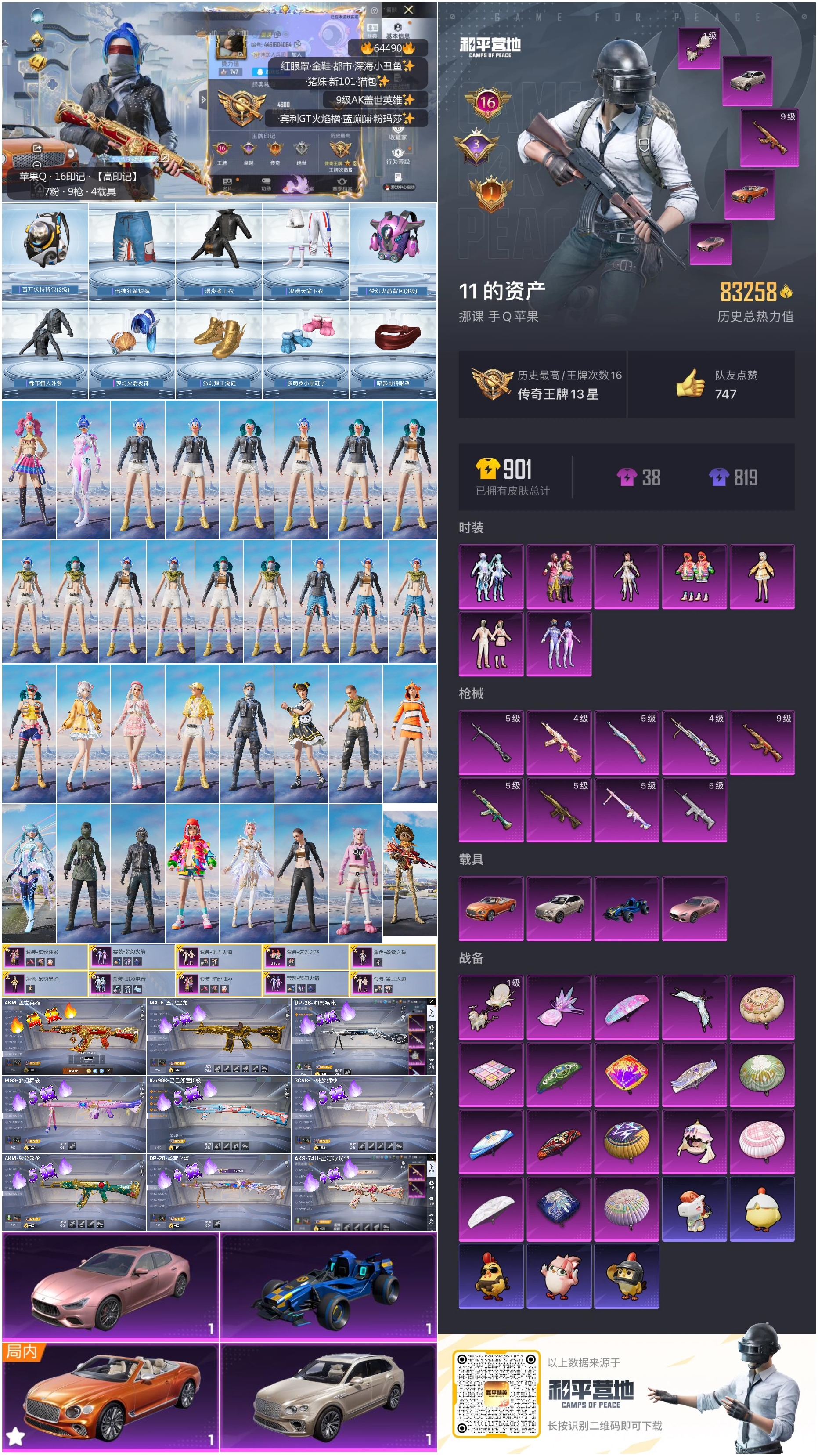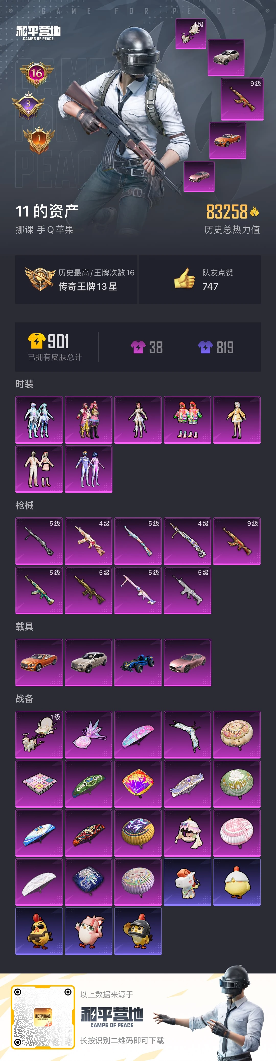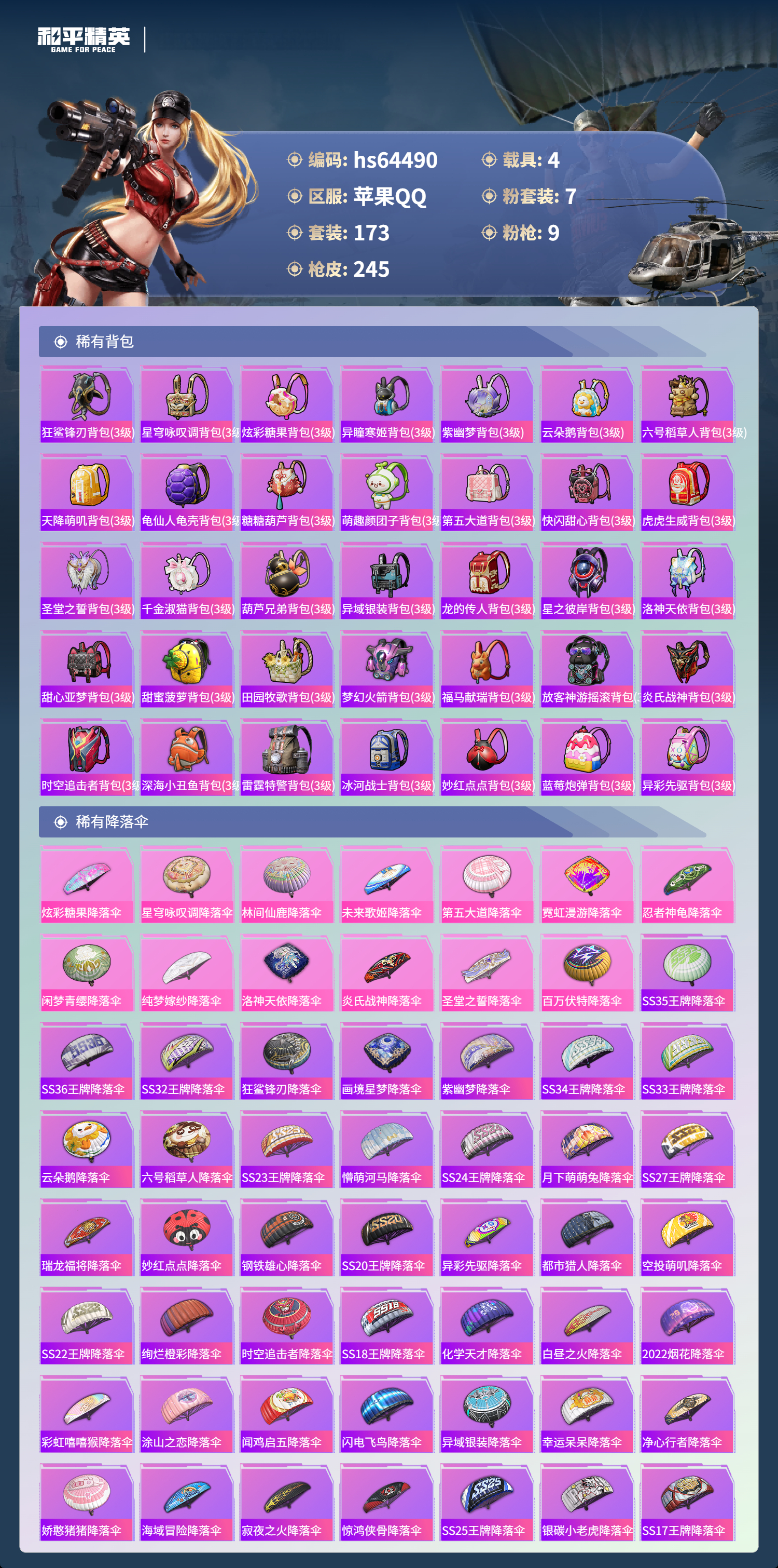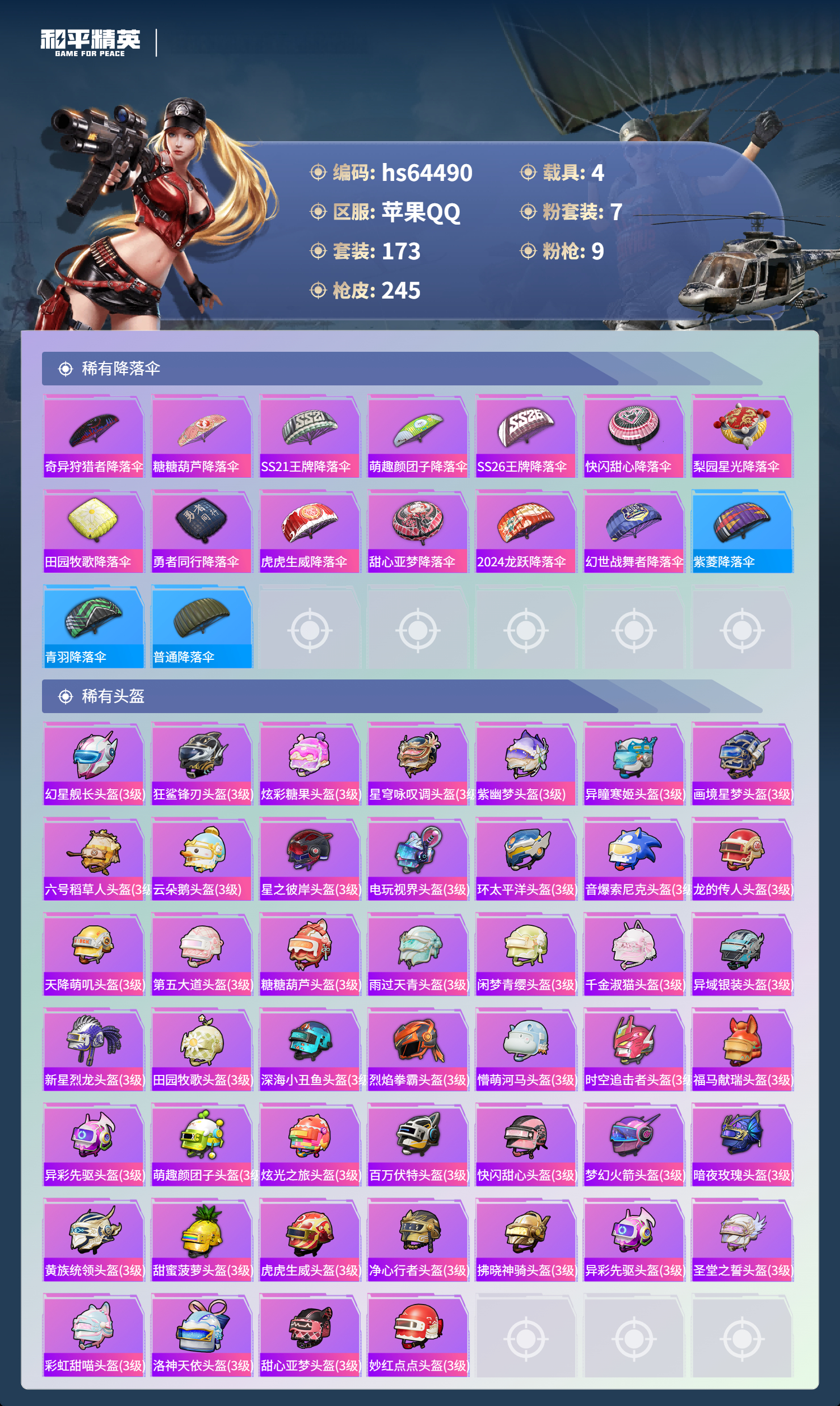 hs64490 苹果手Q-16王牌印记-7粉装-9特效枪-4载具-83258热力值-173套装-245枪皮-3卓越印记-1传奇印记