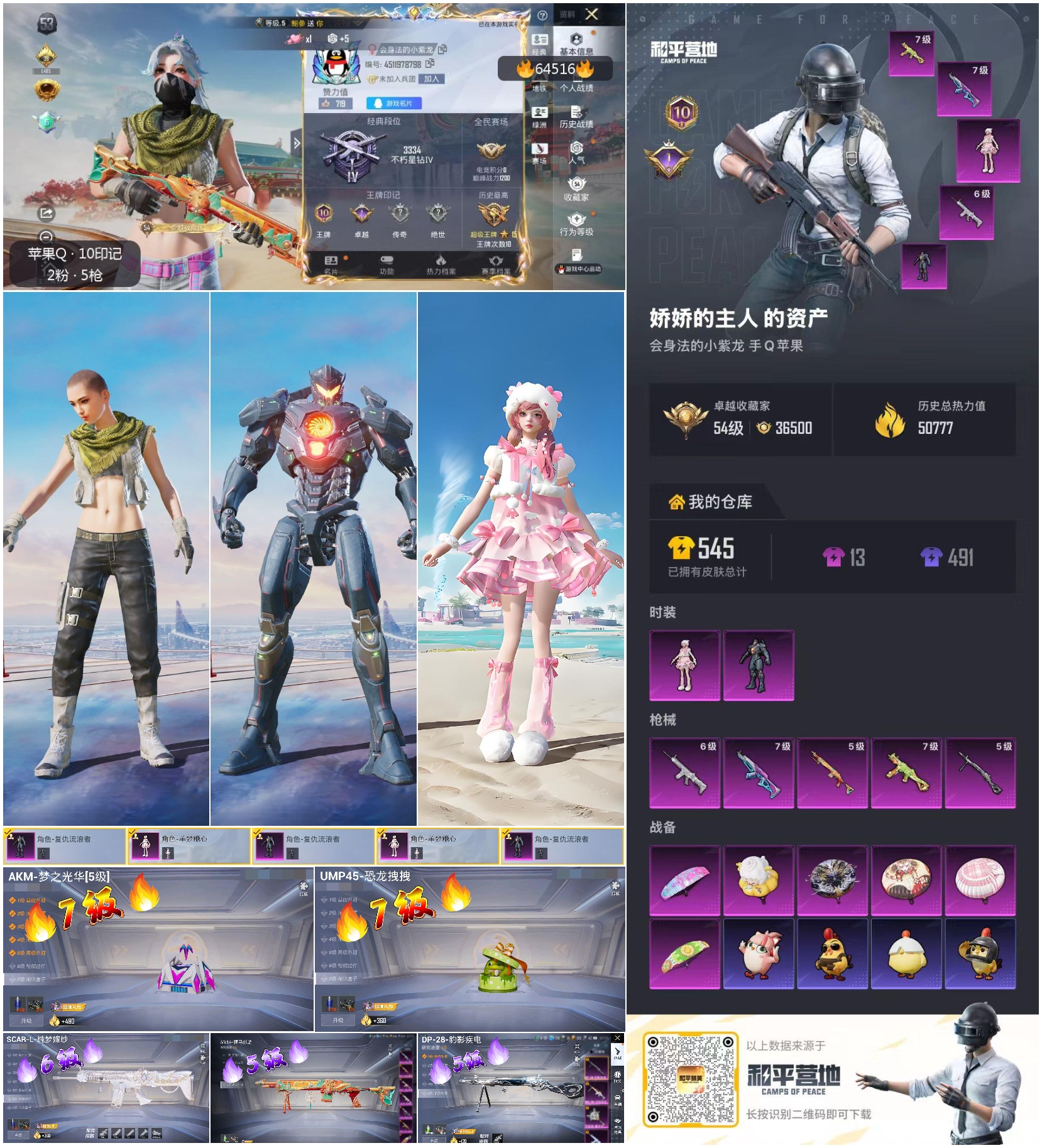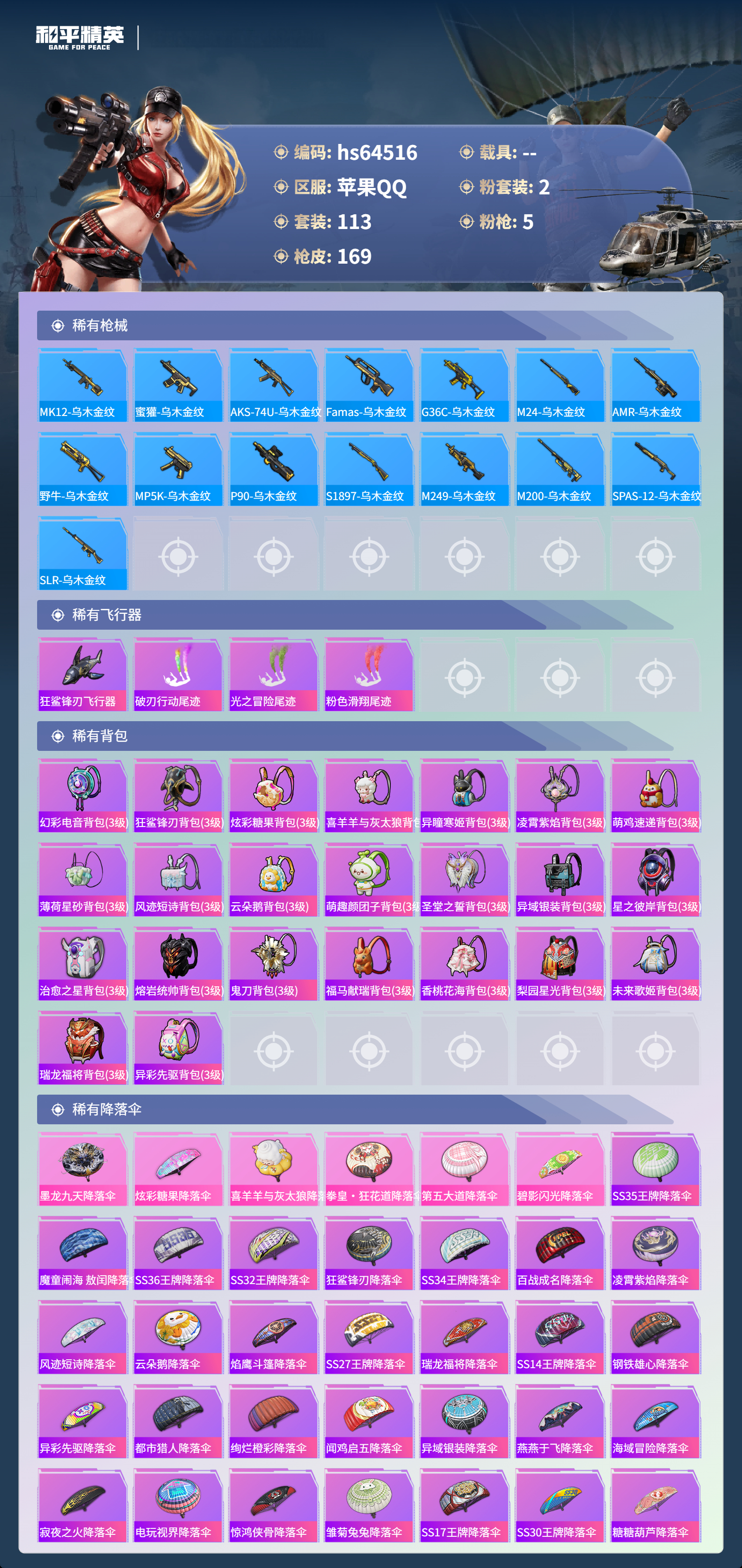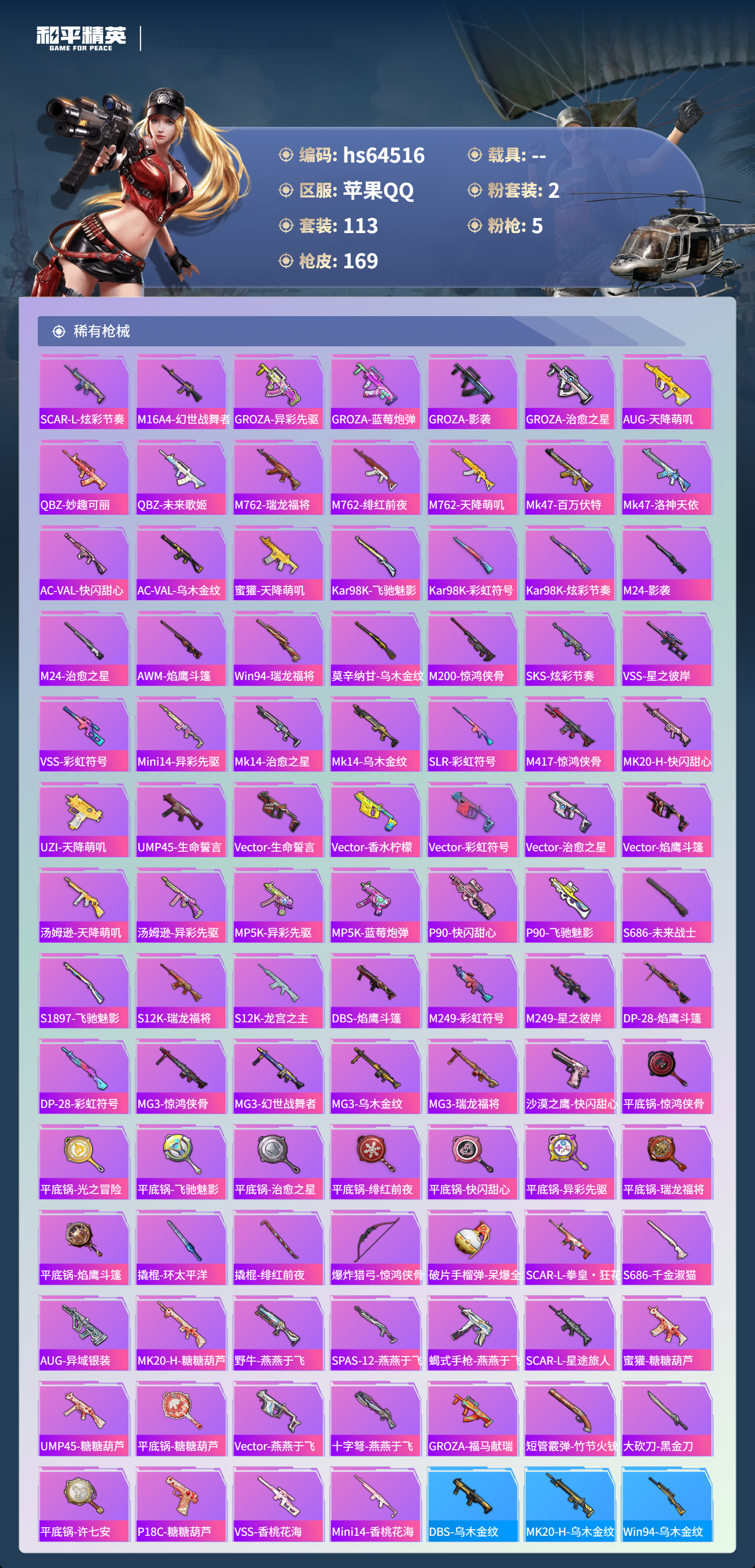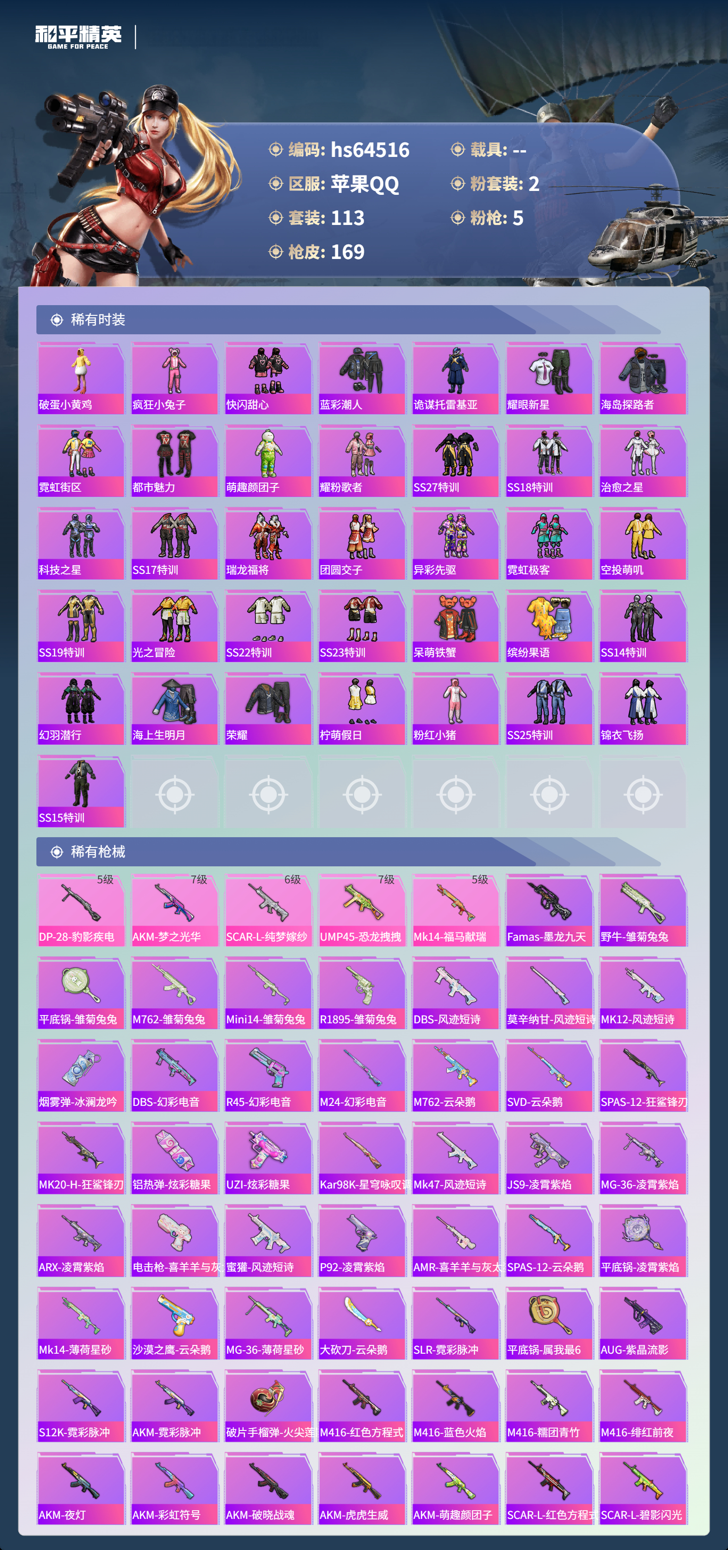 hs64516 苹果手Q-10王牌印记-2粉装-5特效枪-50777热力值-113套装-169枪皮-1卓越印记