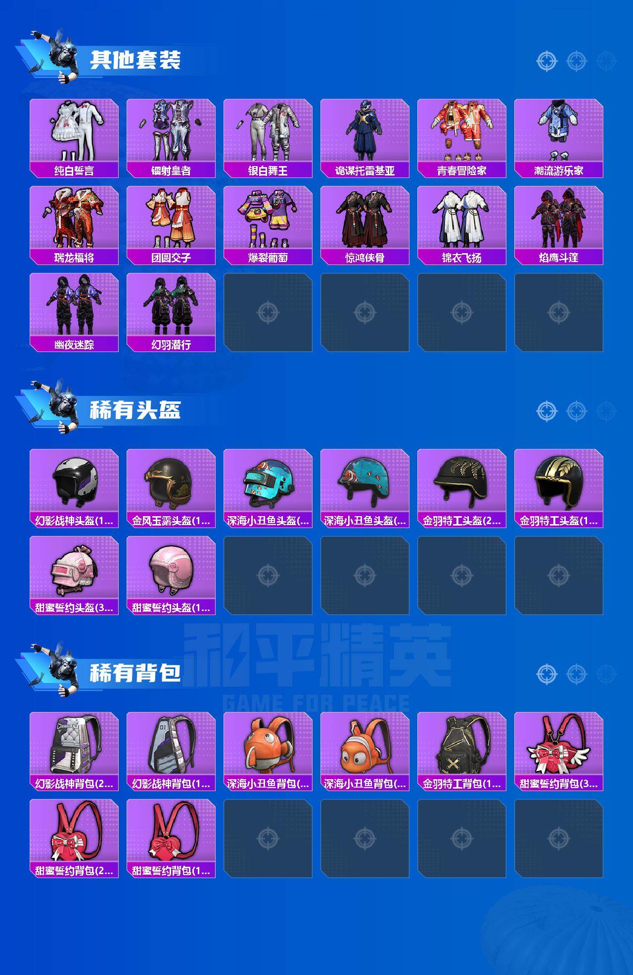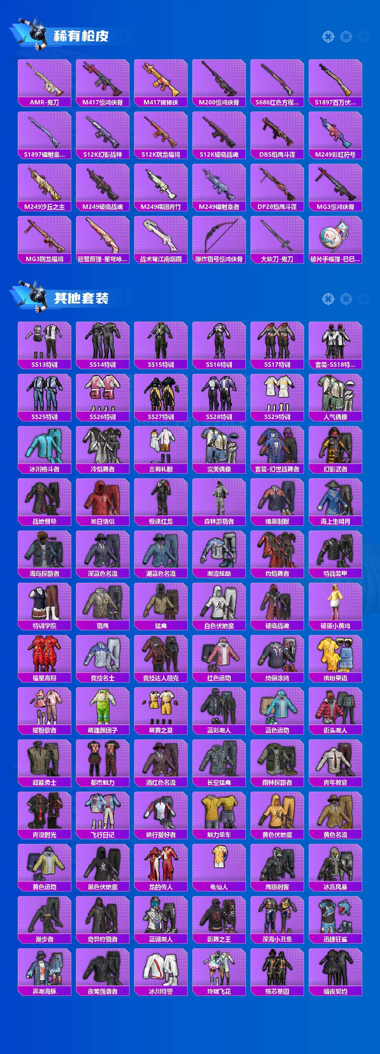 安卓【小号 套装-深海小丑鱼,套装-小丑鱼,套装-奇异狩猎者,套装-龟仙人,SCAR-L-锦绣绵绵(五级),Kar98K-巳巳如意(五级),Mk14-福马献瑞(一级)】 手Q-2粉装-3特效枪-0载具-2粉色飞行器-41325热力值-5王牌印记-125套装-142枪皮