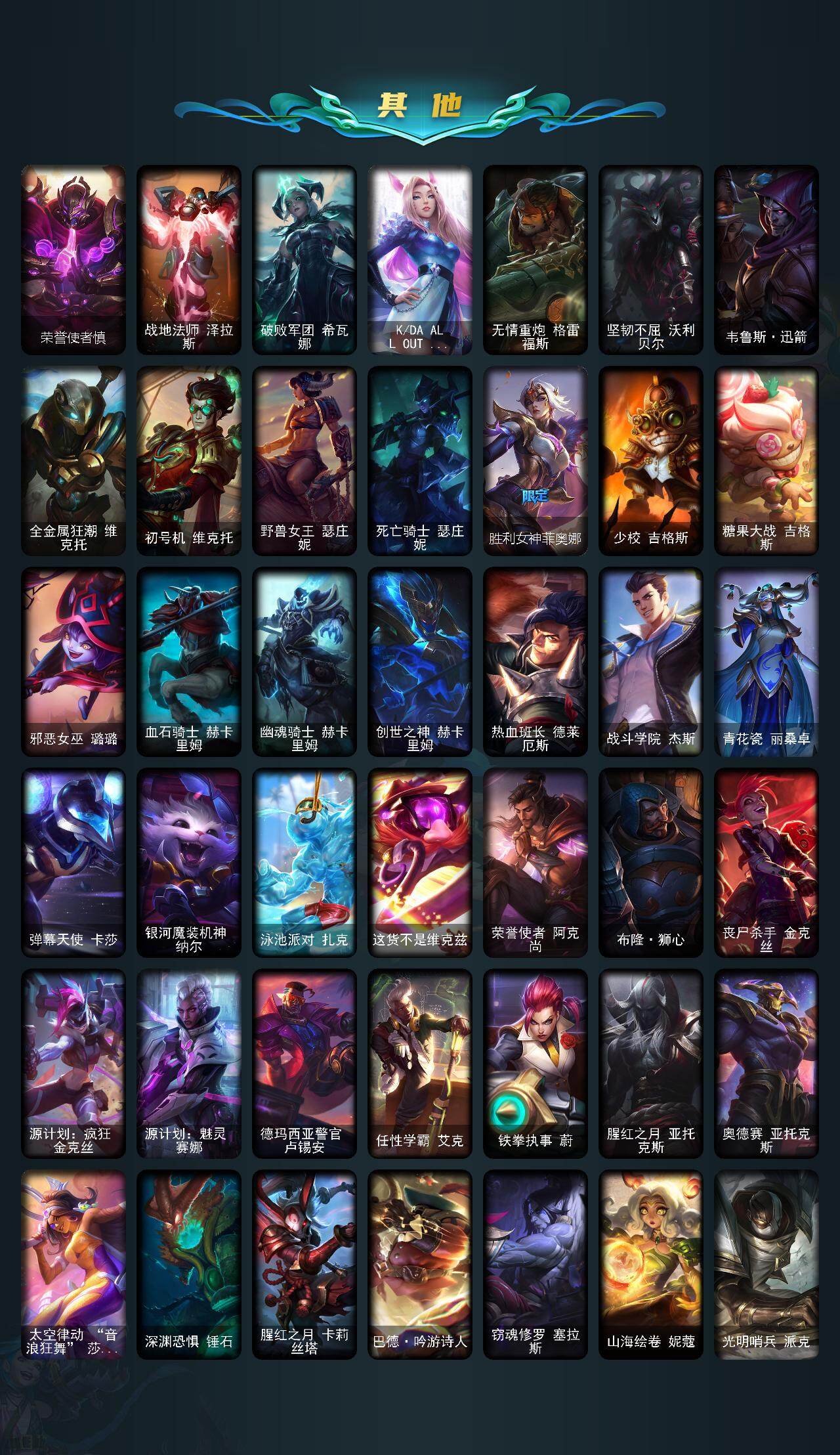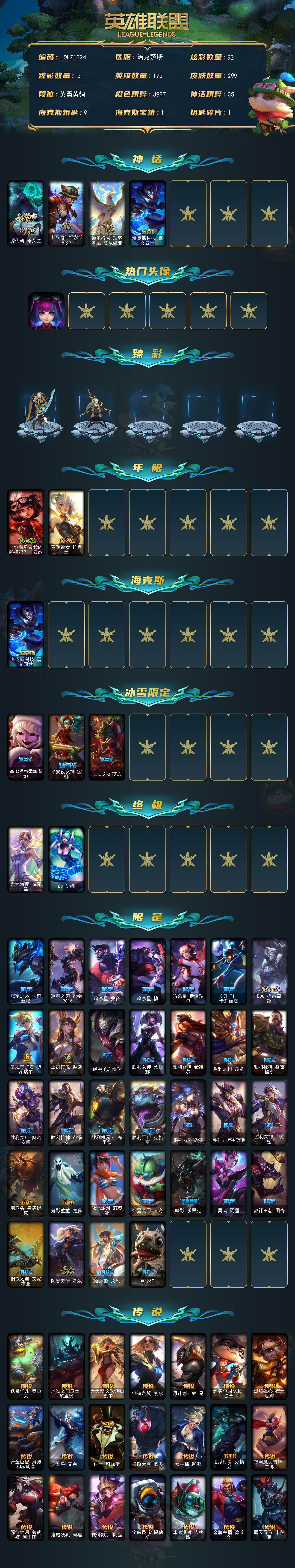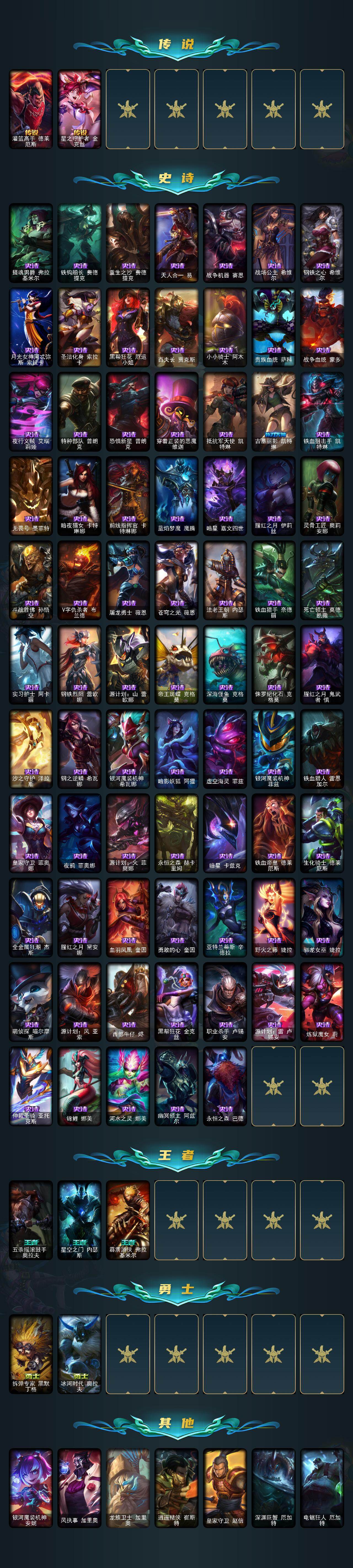 172英雄/299皮肤/2终极/4神话/37限定/3臻彩/92炫彩/23传说/75史诗/青铜/