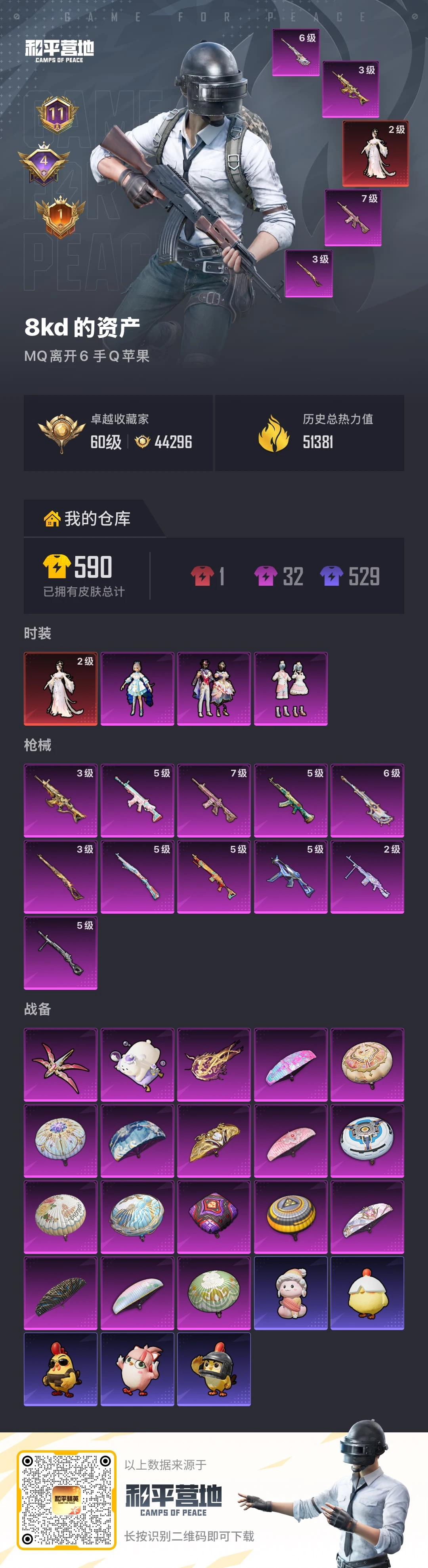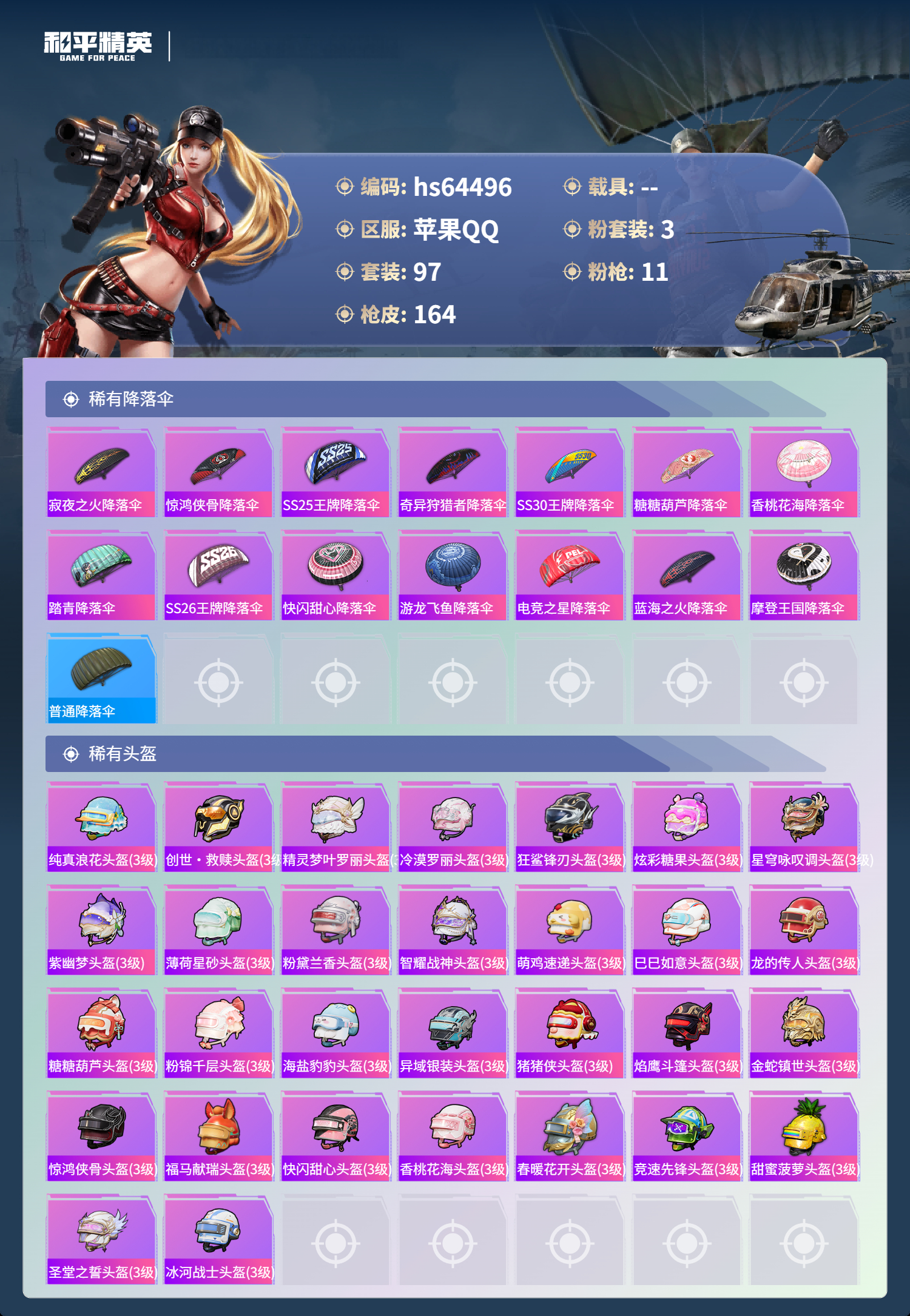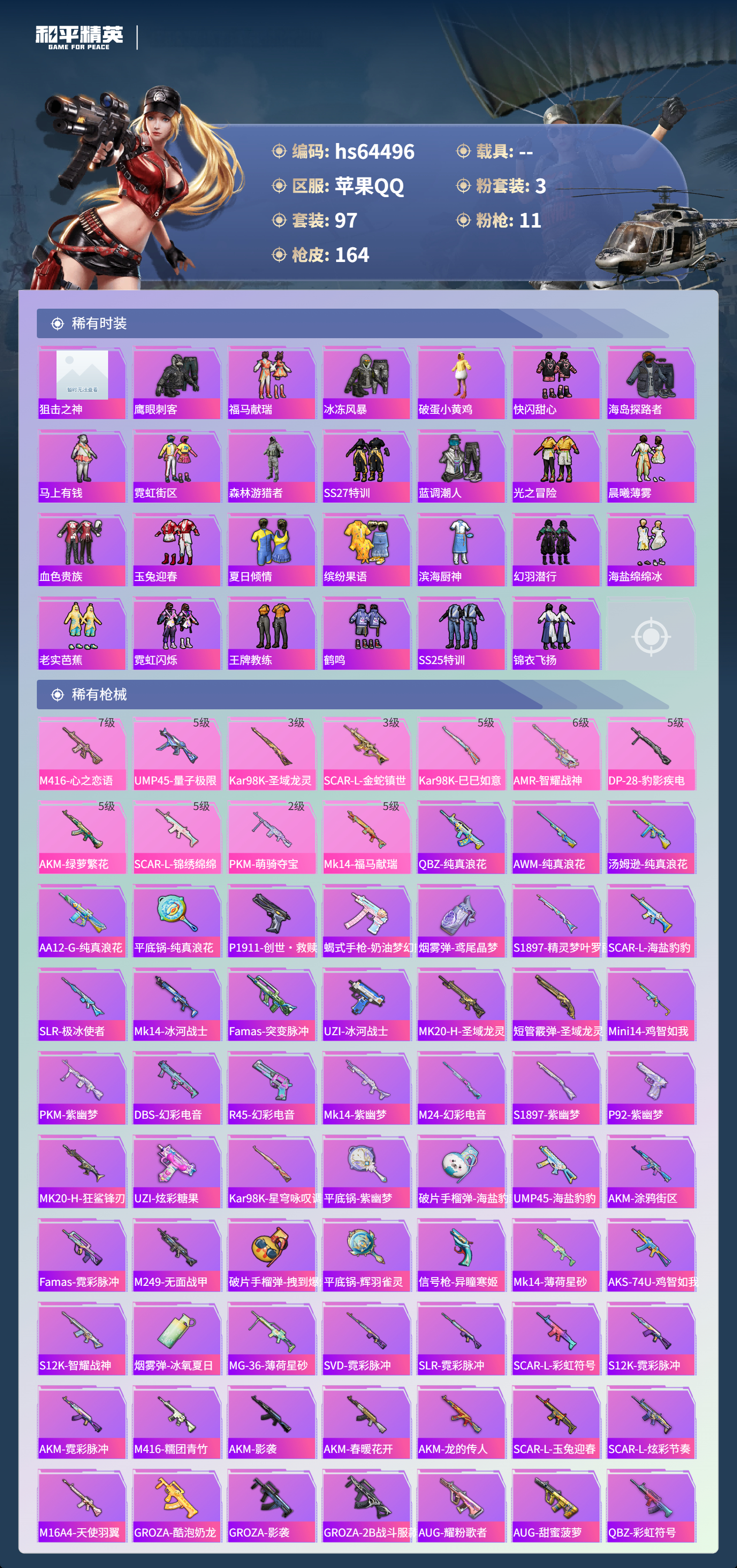 hs64496 苹果手Q-11王牌印记-1红装-3粉装-11特效枪-51411热力值-97套装-164枪皮-4卓越印记-1传奇印记