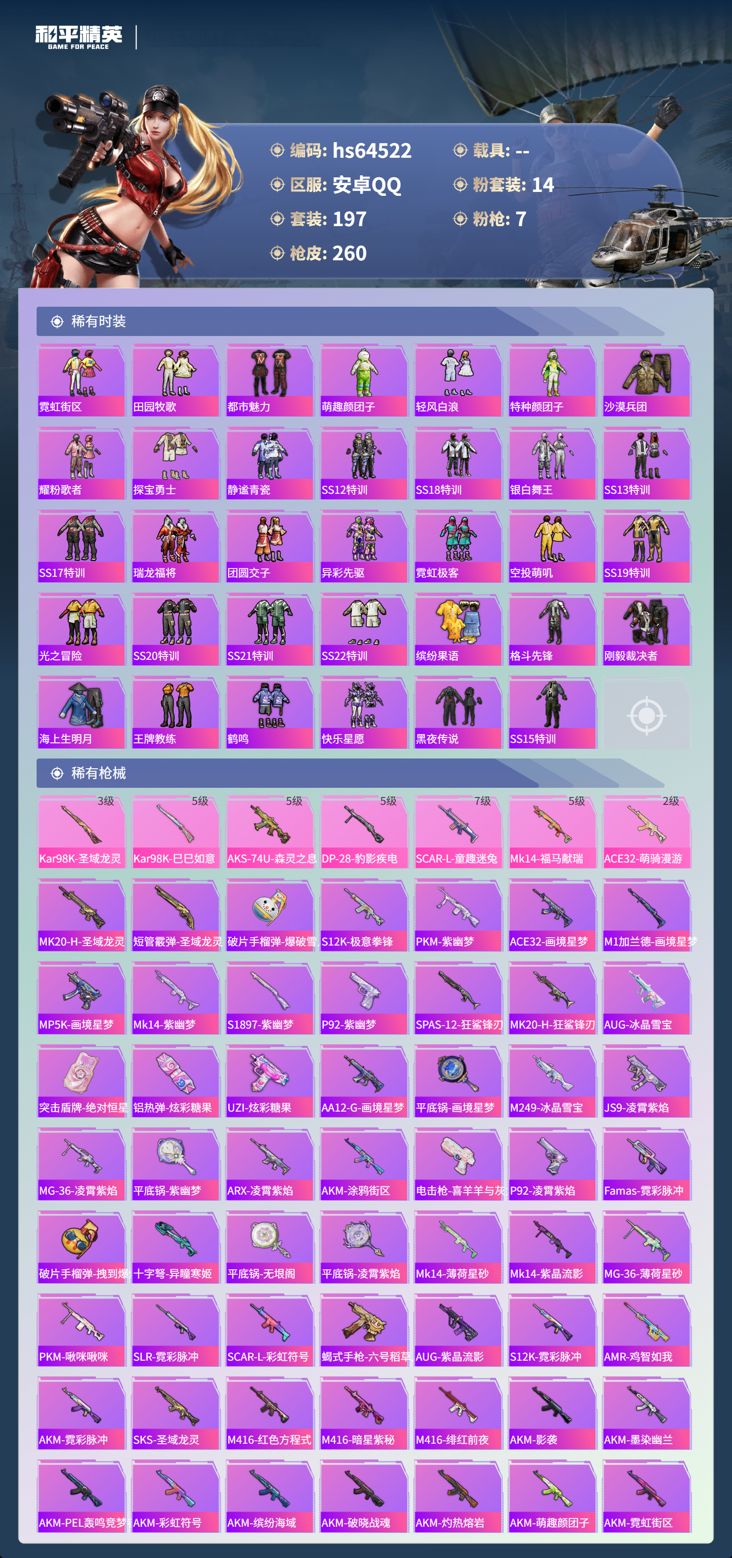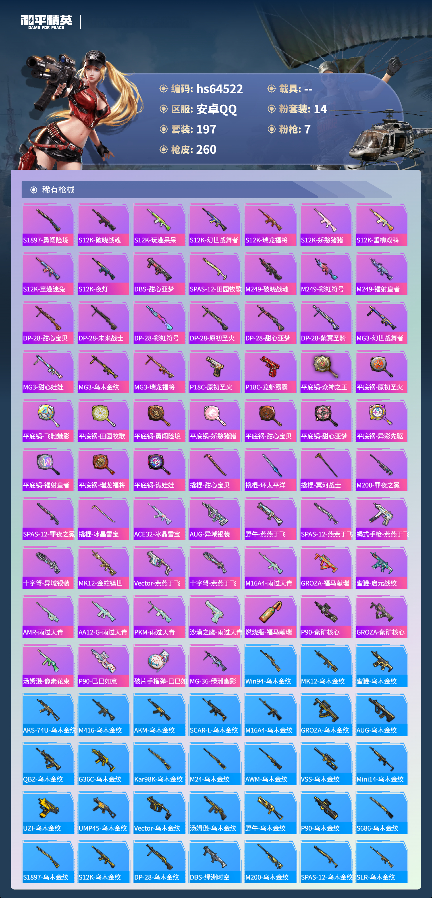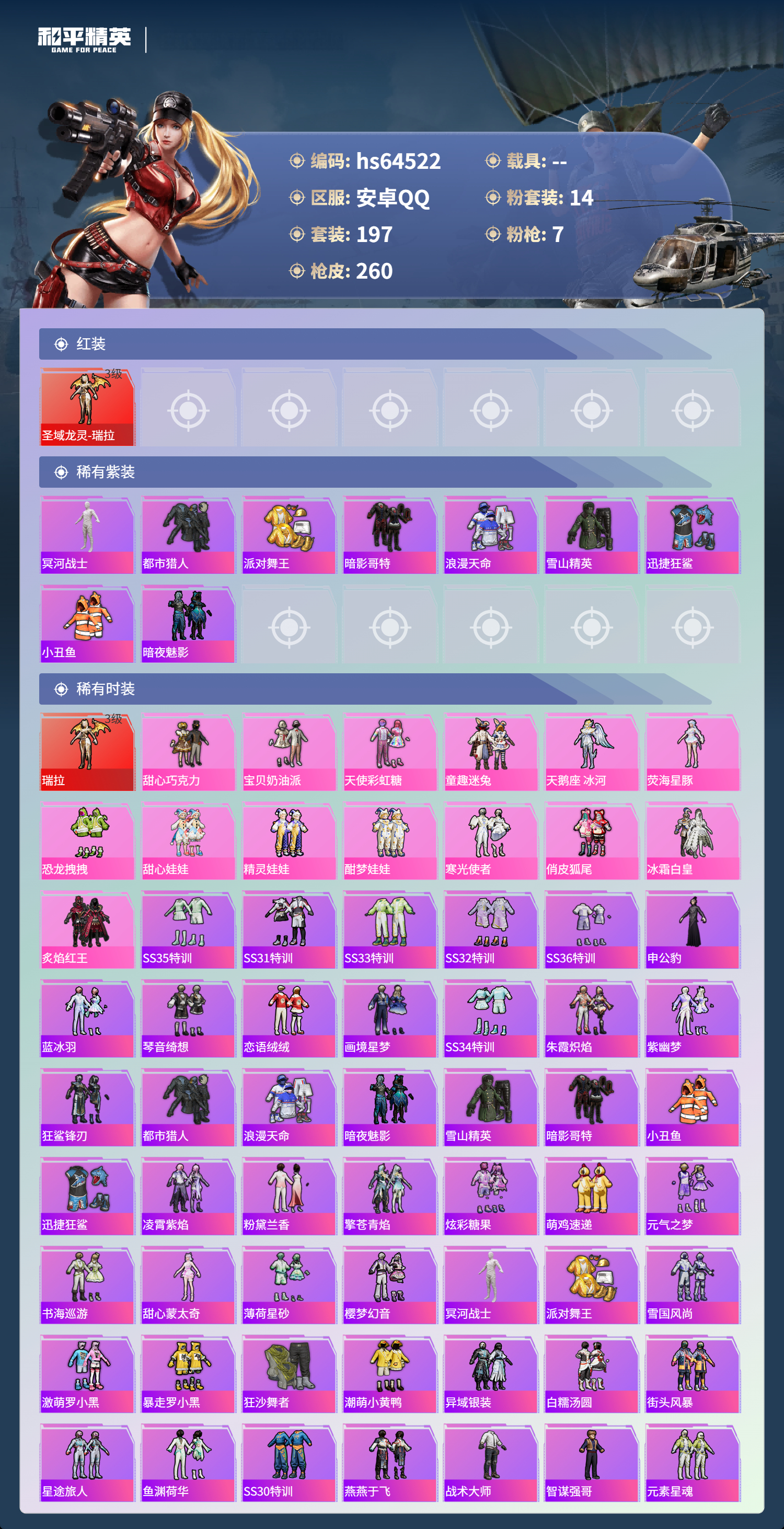 hs64522 安卓手Q-16王牌印记-1红装-14粉装-7特效枪-80959热力值-197套装-260枪皮-1卓越印记