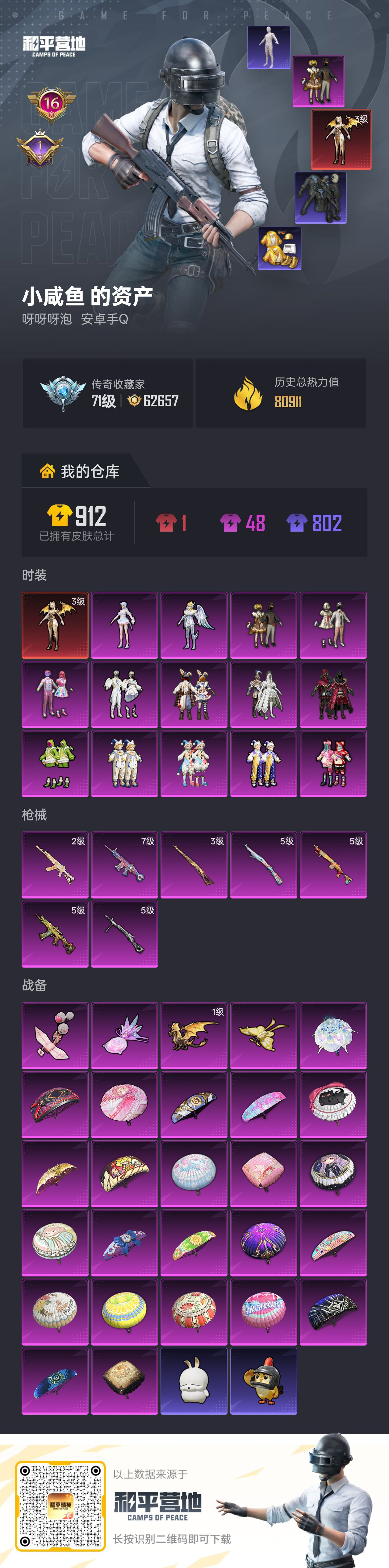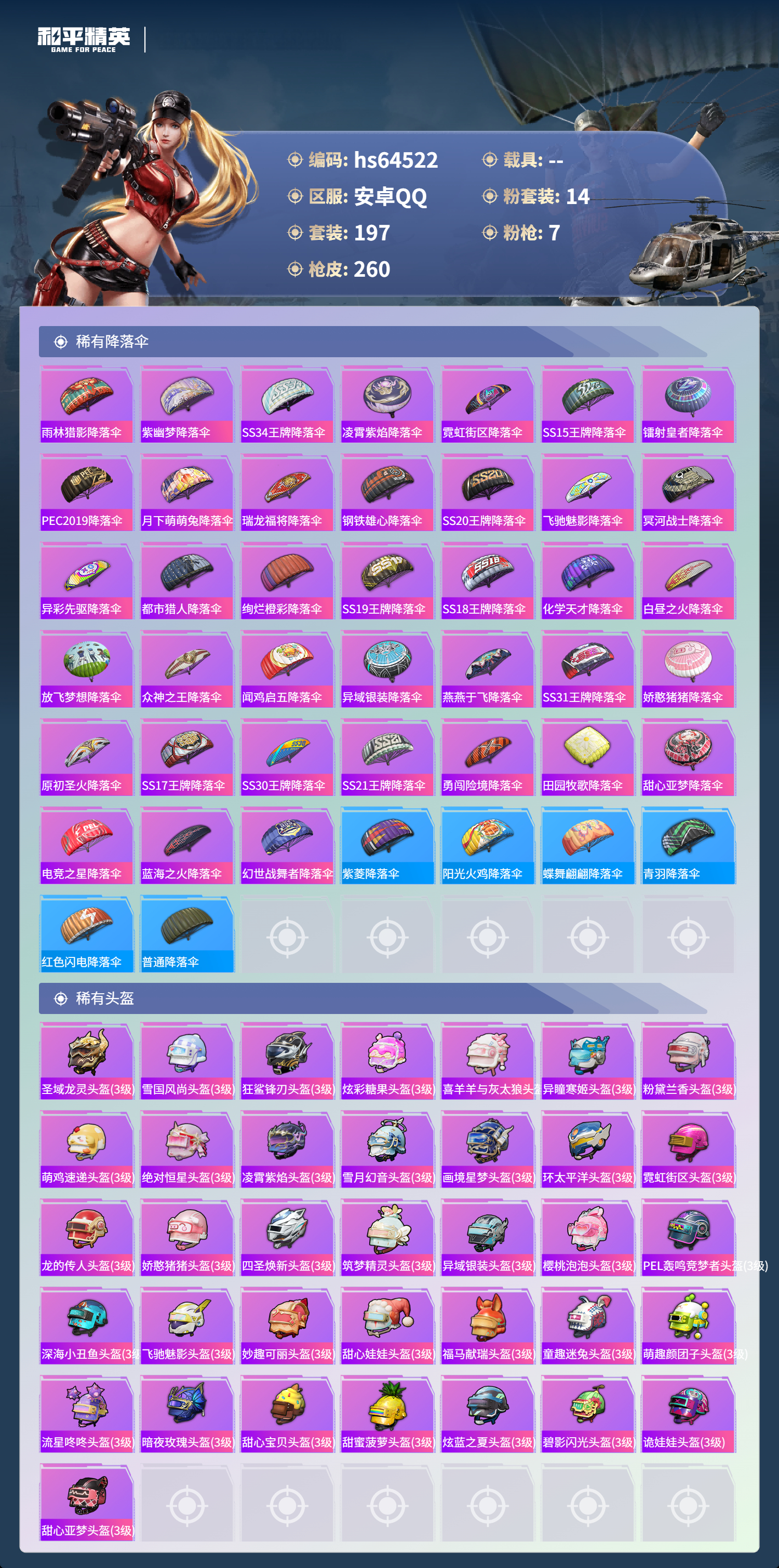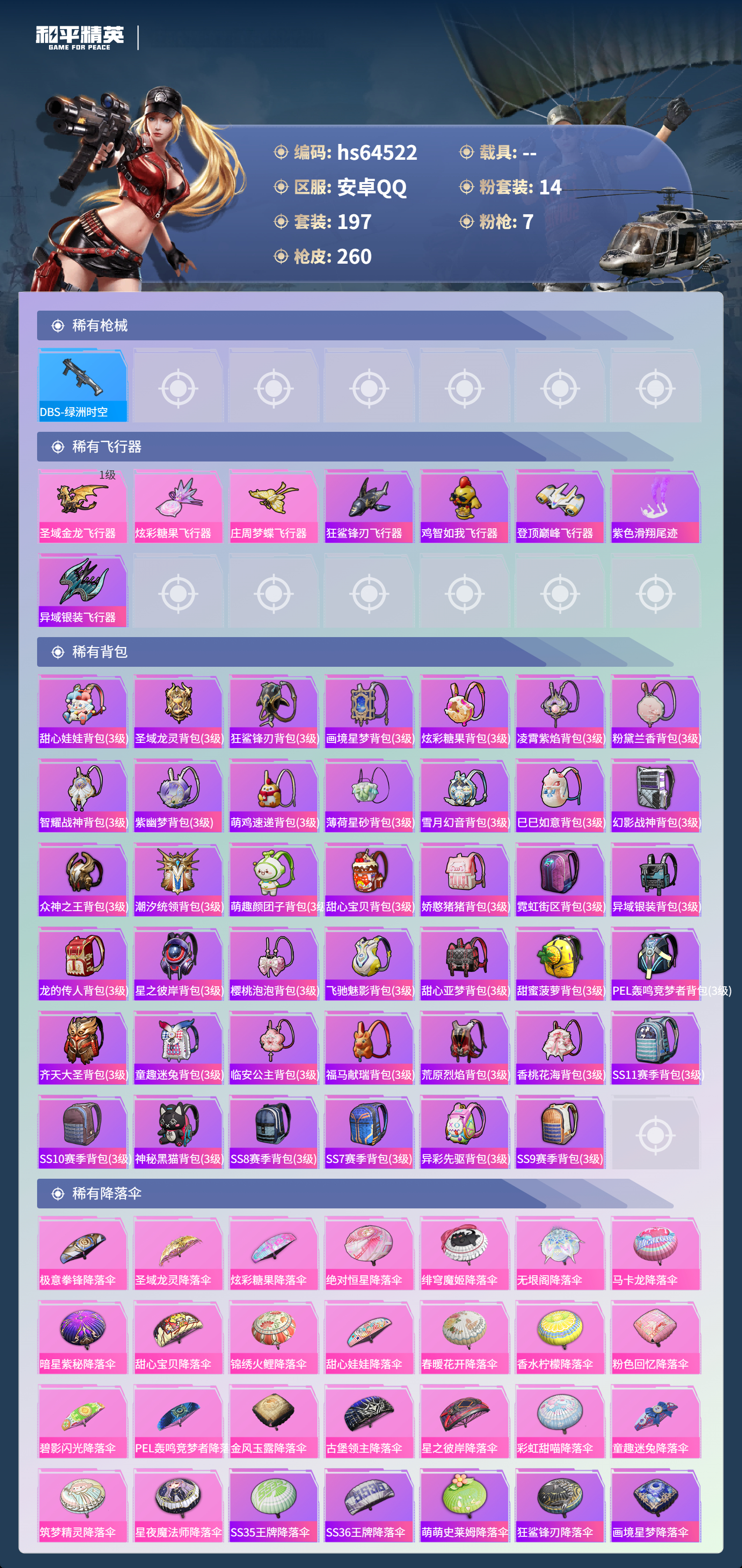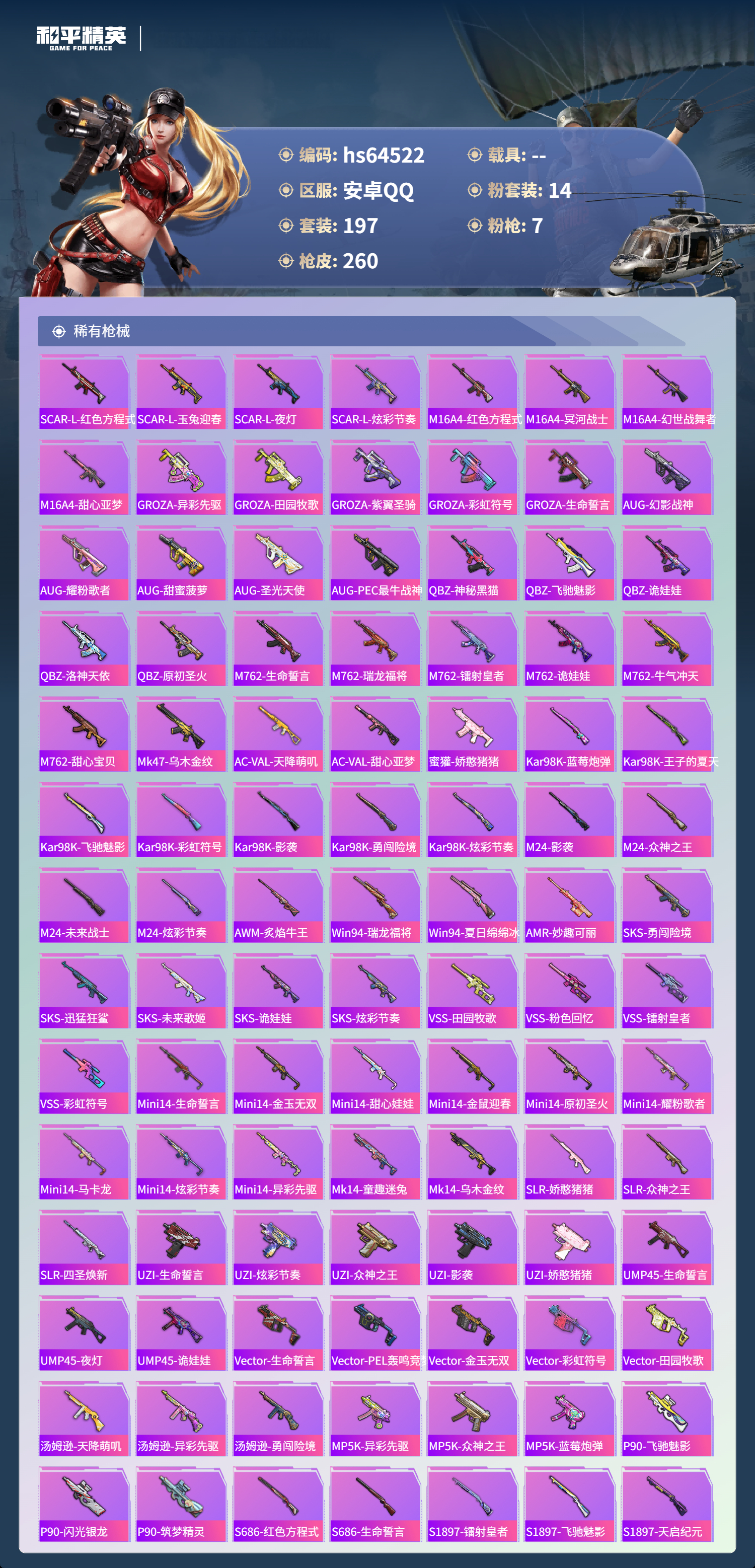 hs64522 安卓手Q-16王牌印记-1红装-14粉装-7特效枪-80959热力值-197套装-260枪皮-1卓越印记