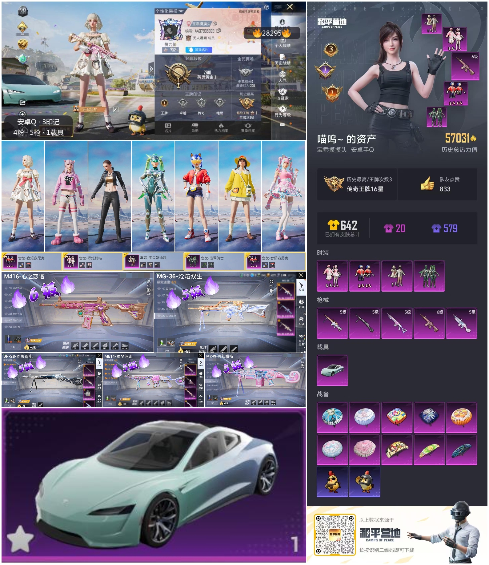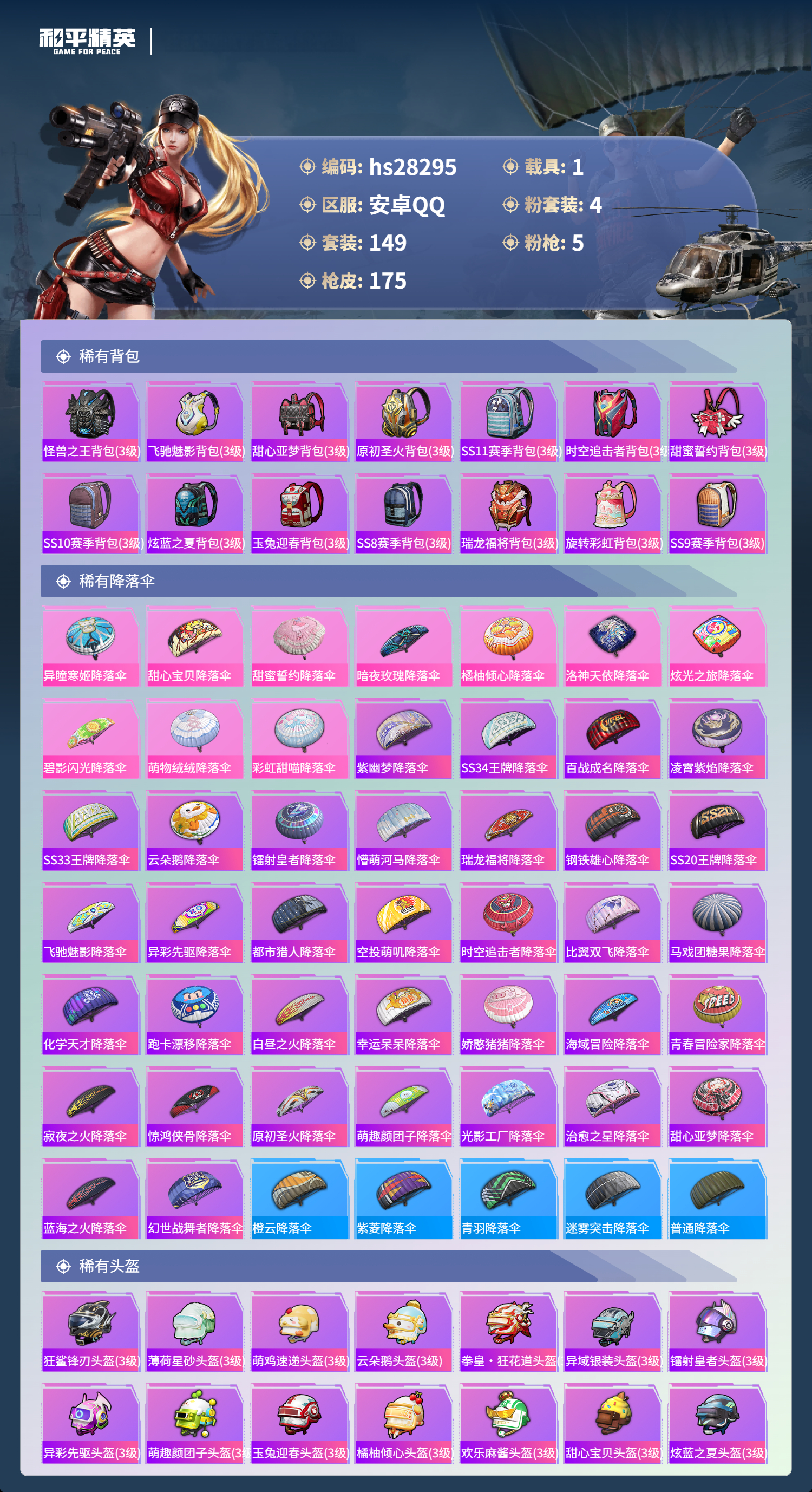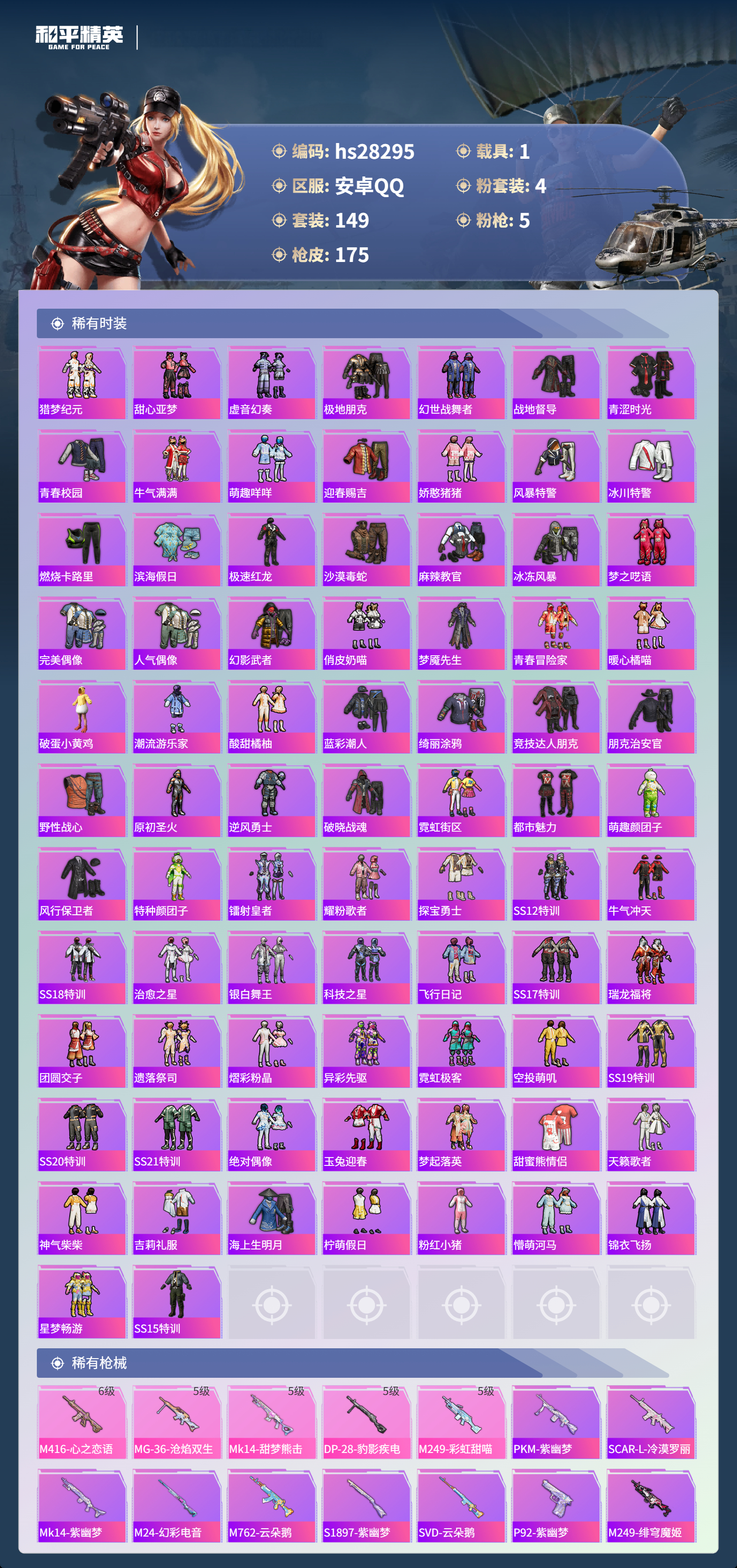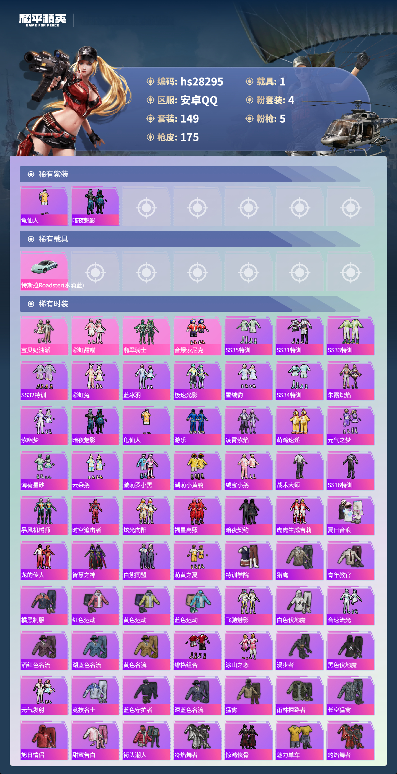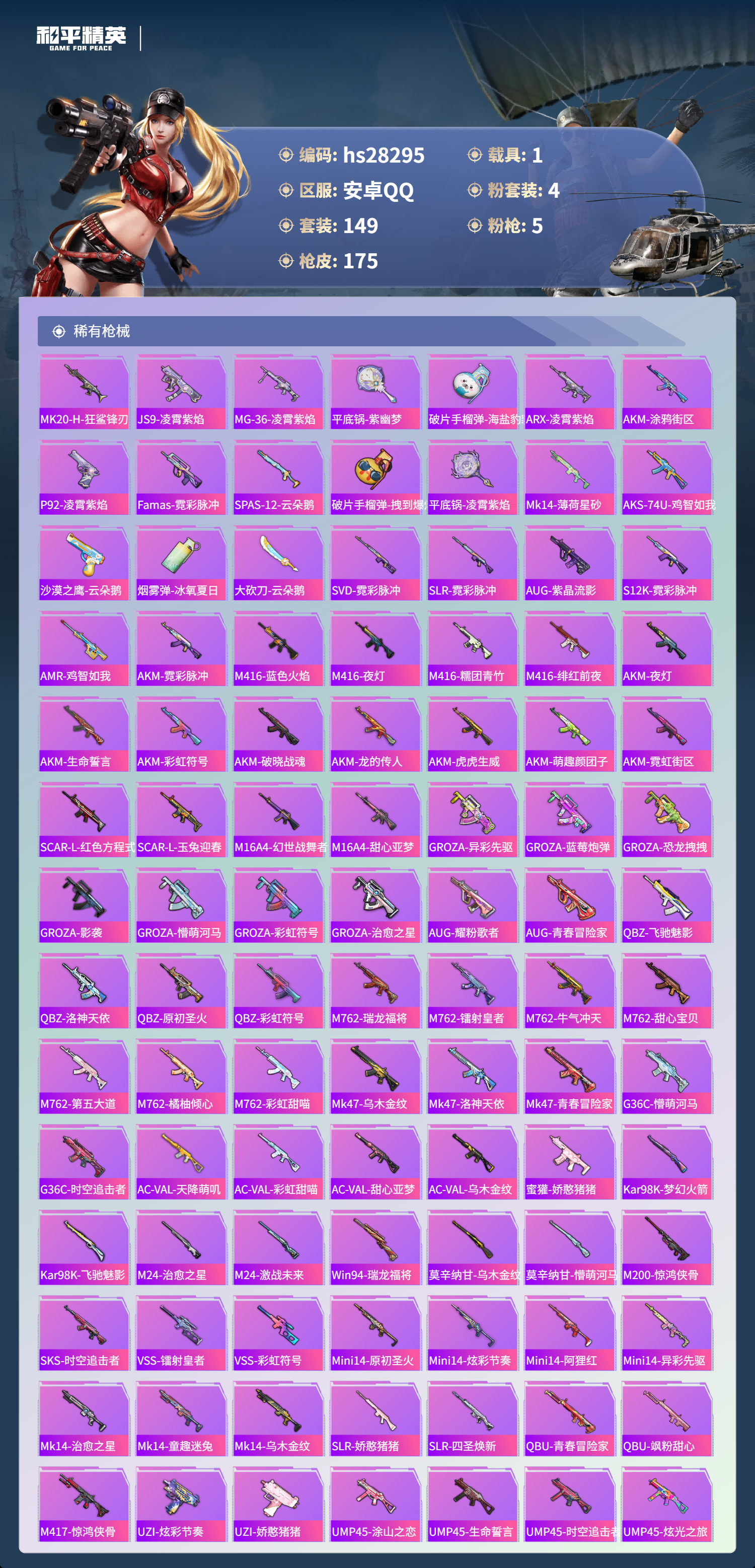 hs28295 安卓手Q-3王牌印记-4粉装-5特效枪-1载具-57031热力值-149套装-175枪皮-1卓越印记-1传奇印记