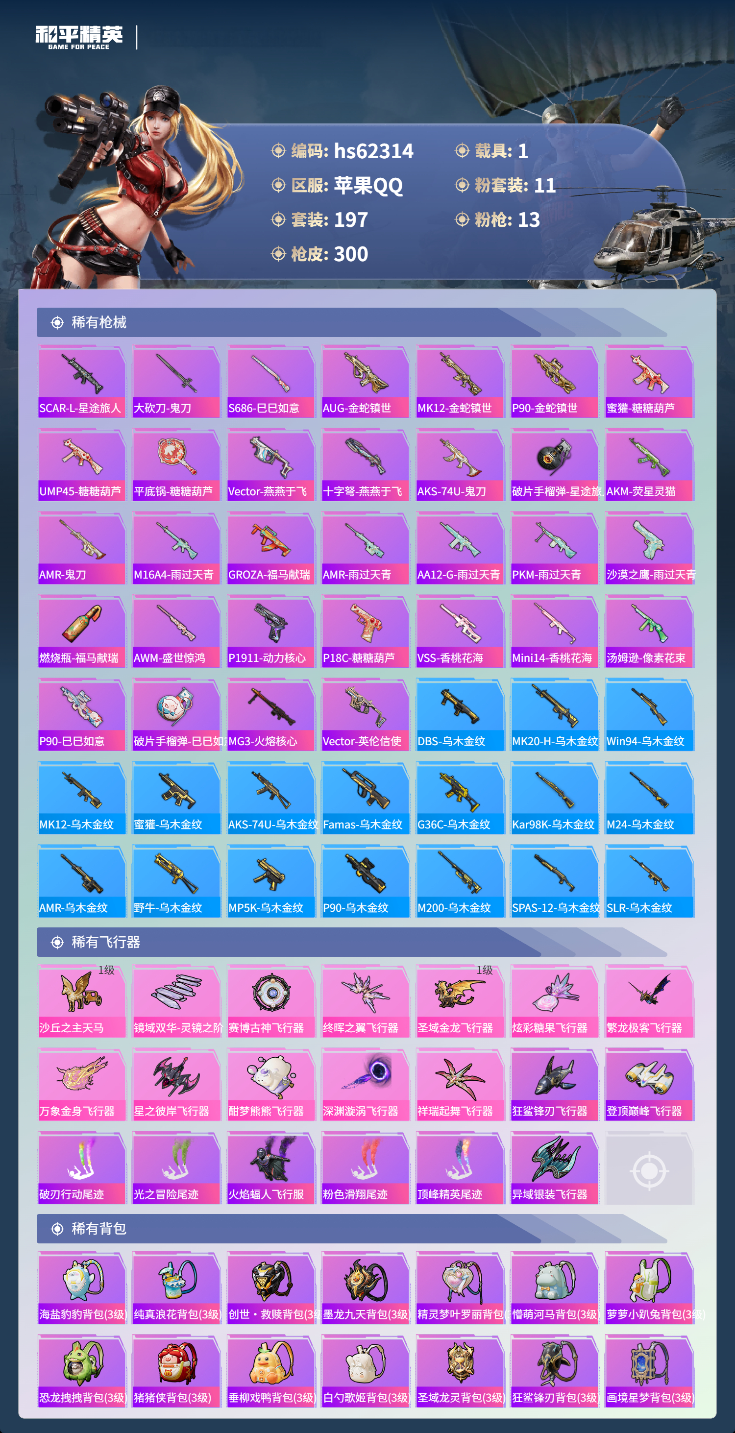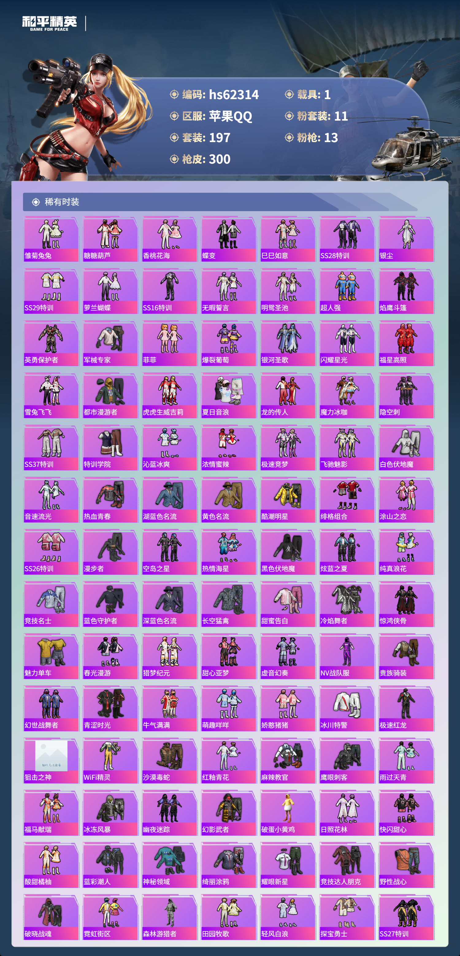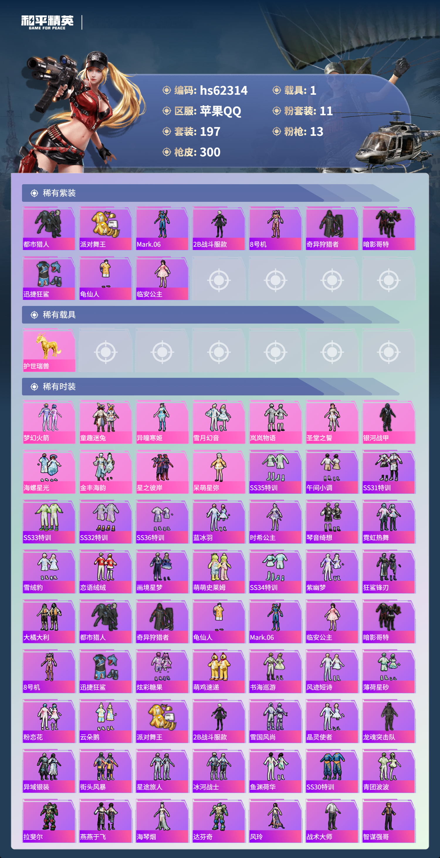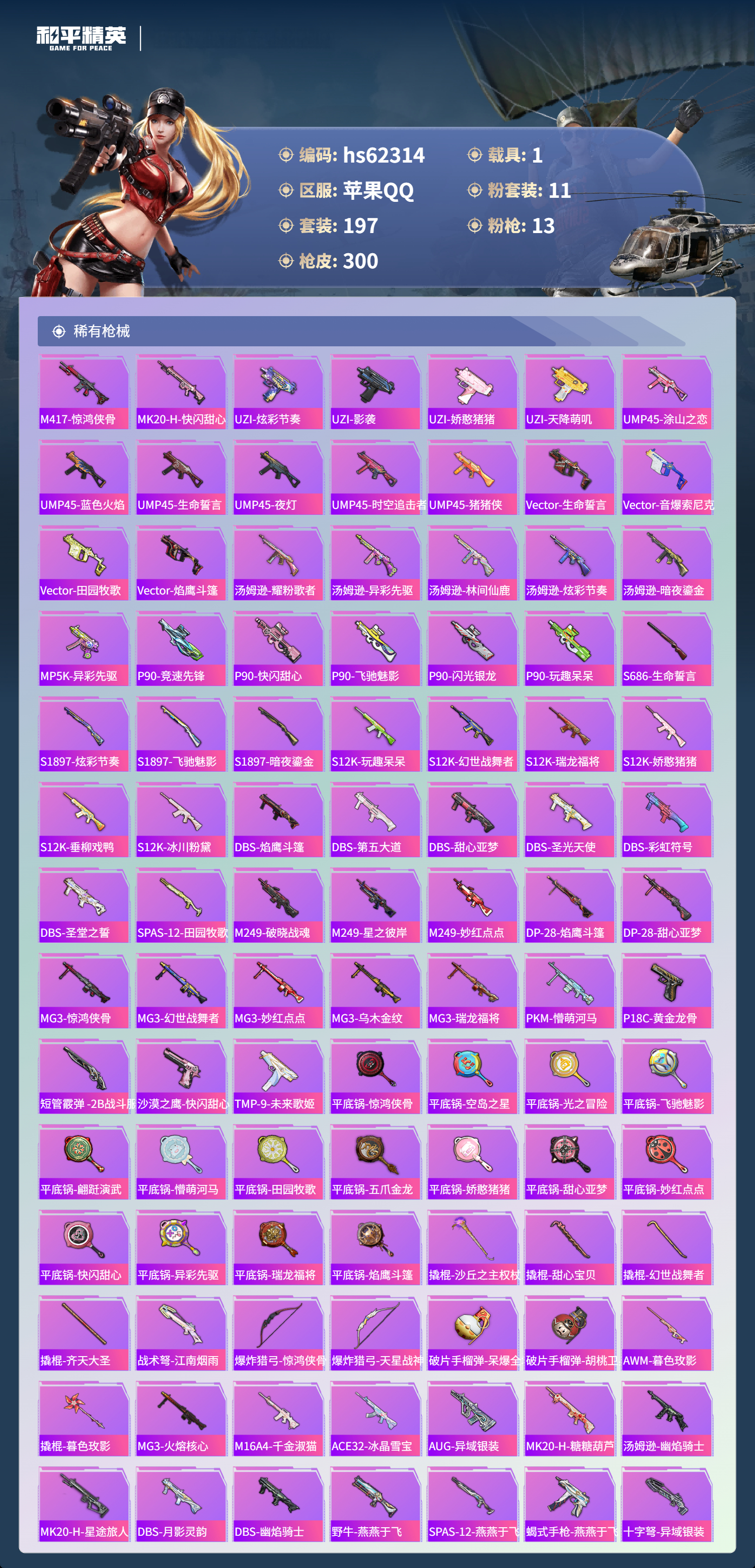 hs62314 苹果手Q-20王牌印记-11粉装-13特效枪-1载具-热力值-197套装-300枪皮-1卓越印记