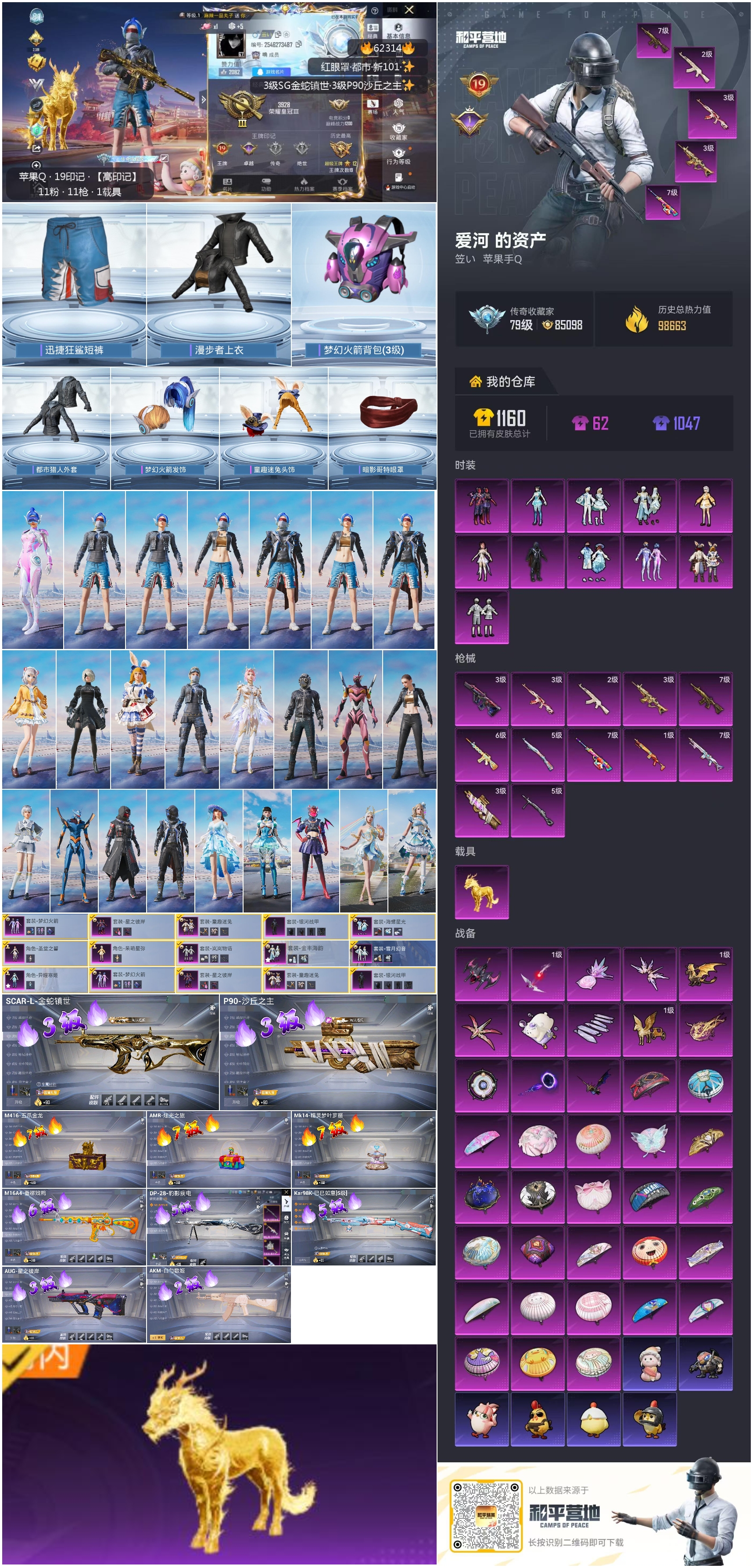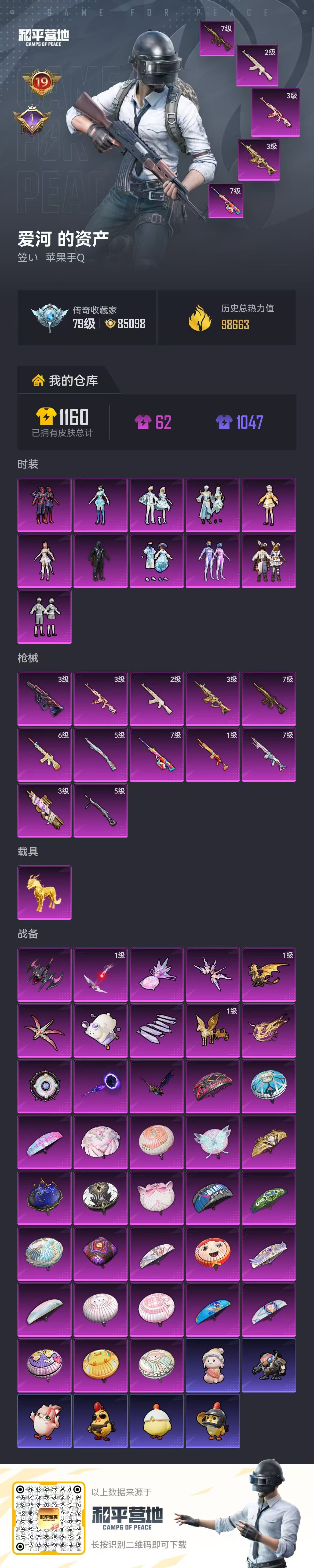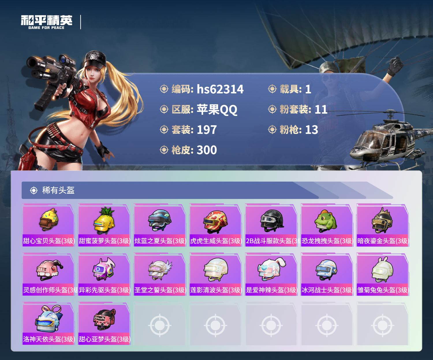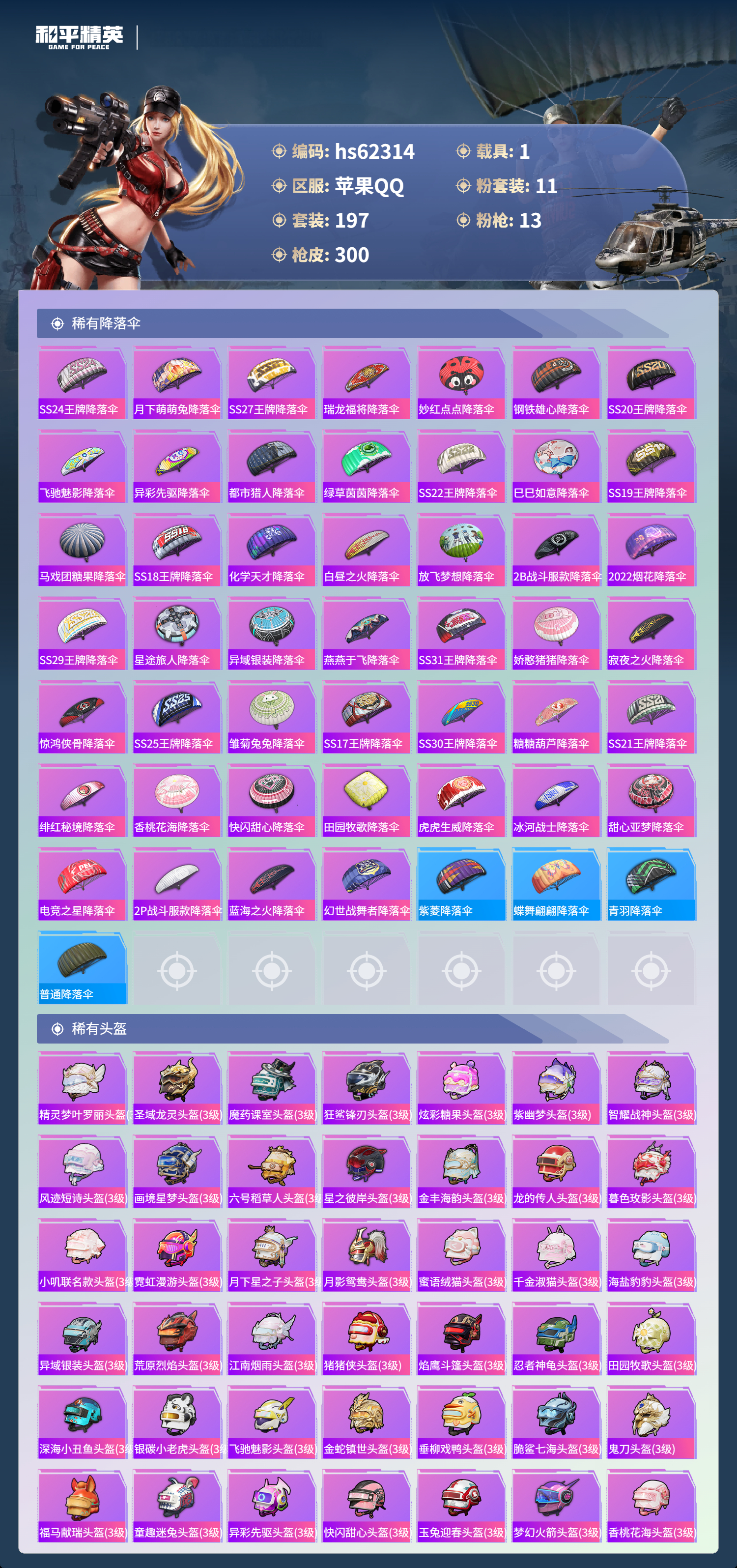 hs62314 苹果手Q-20王牌印记-11粉装-13特效枪-1载具-热力值-197套装-300枪皮-1卓越印记