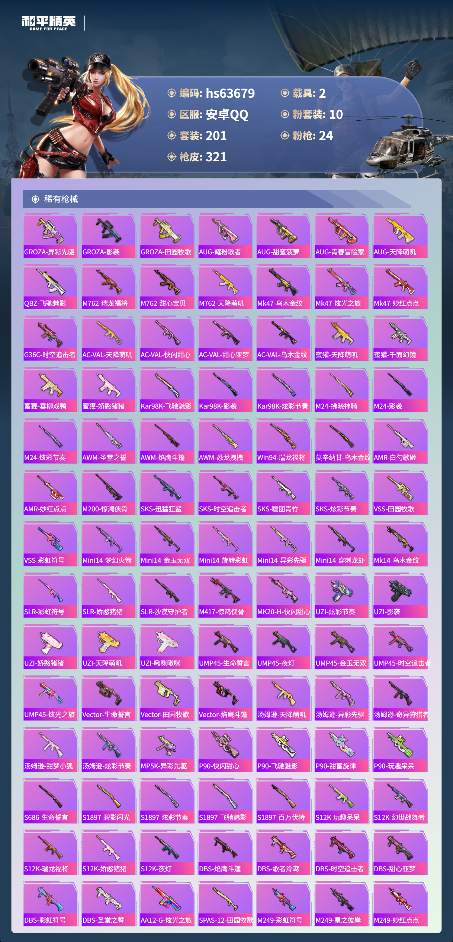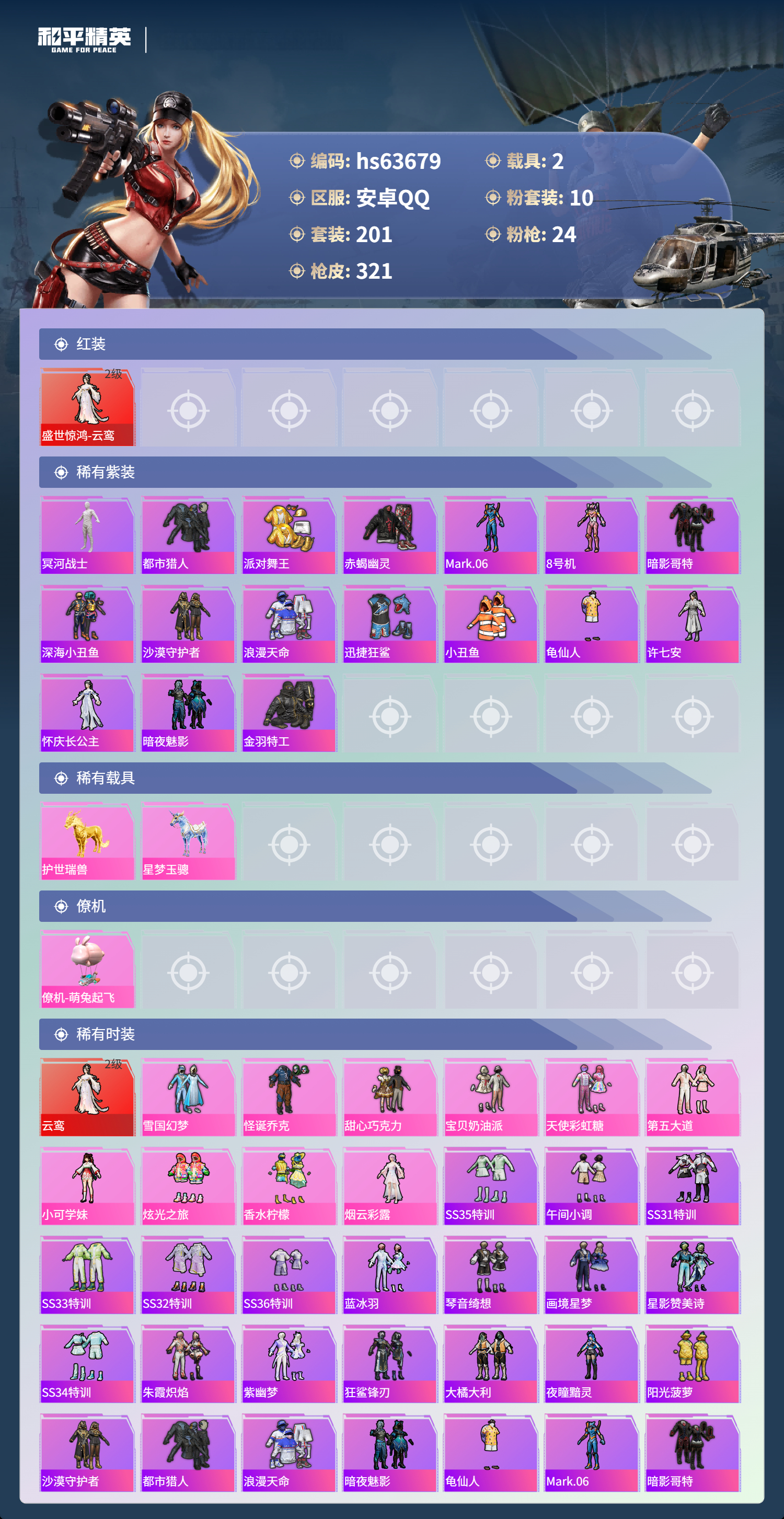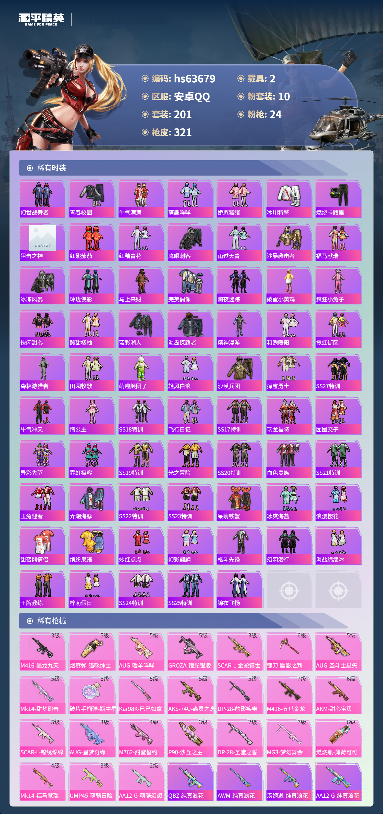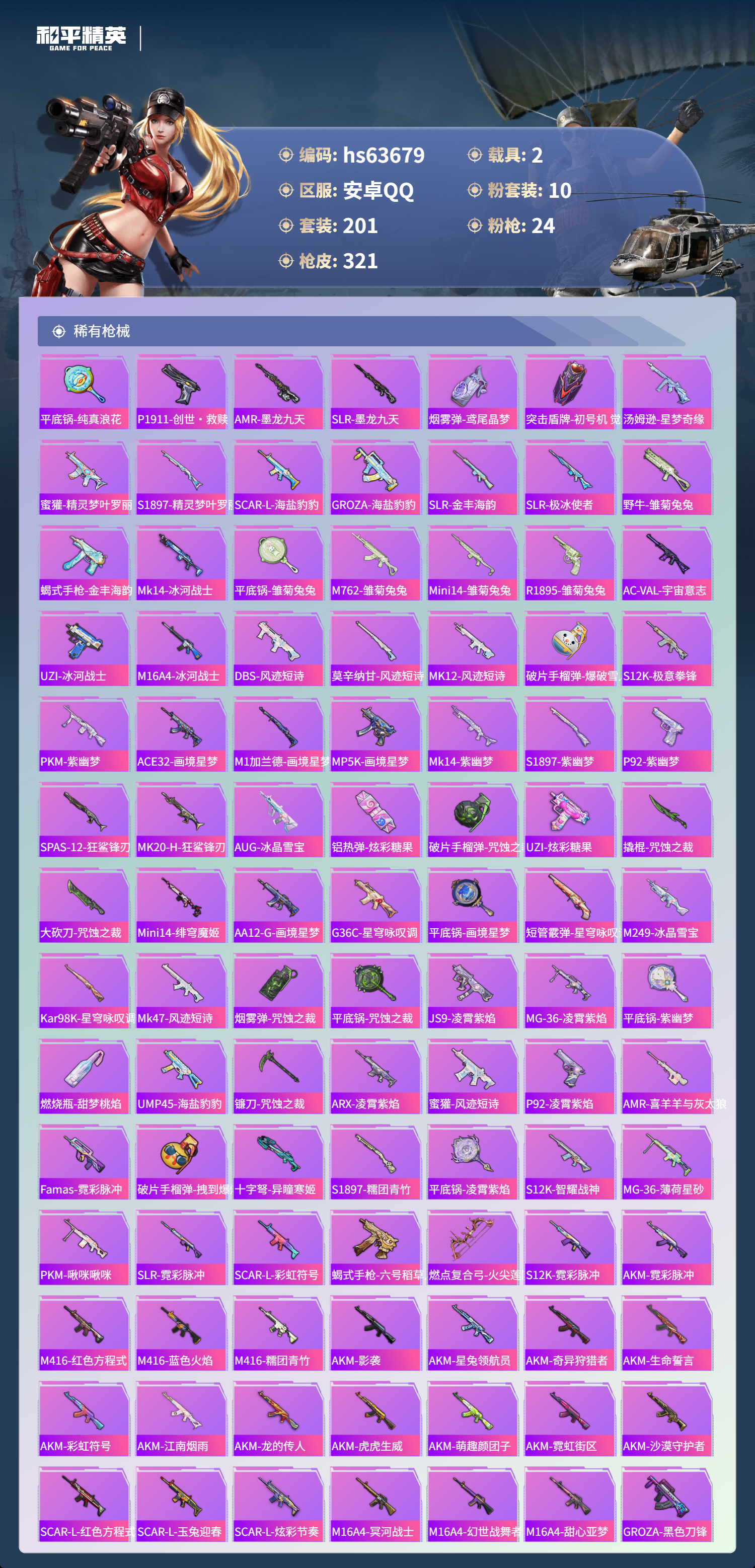 hs63679 安卓手Q-19王牌印记-有战神框-1红装-10粉装-24特效枪-2载具-热力值-201套装-321枪皮-6卓越印记-4传奇印记