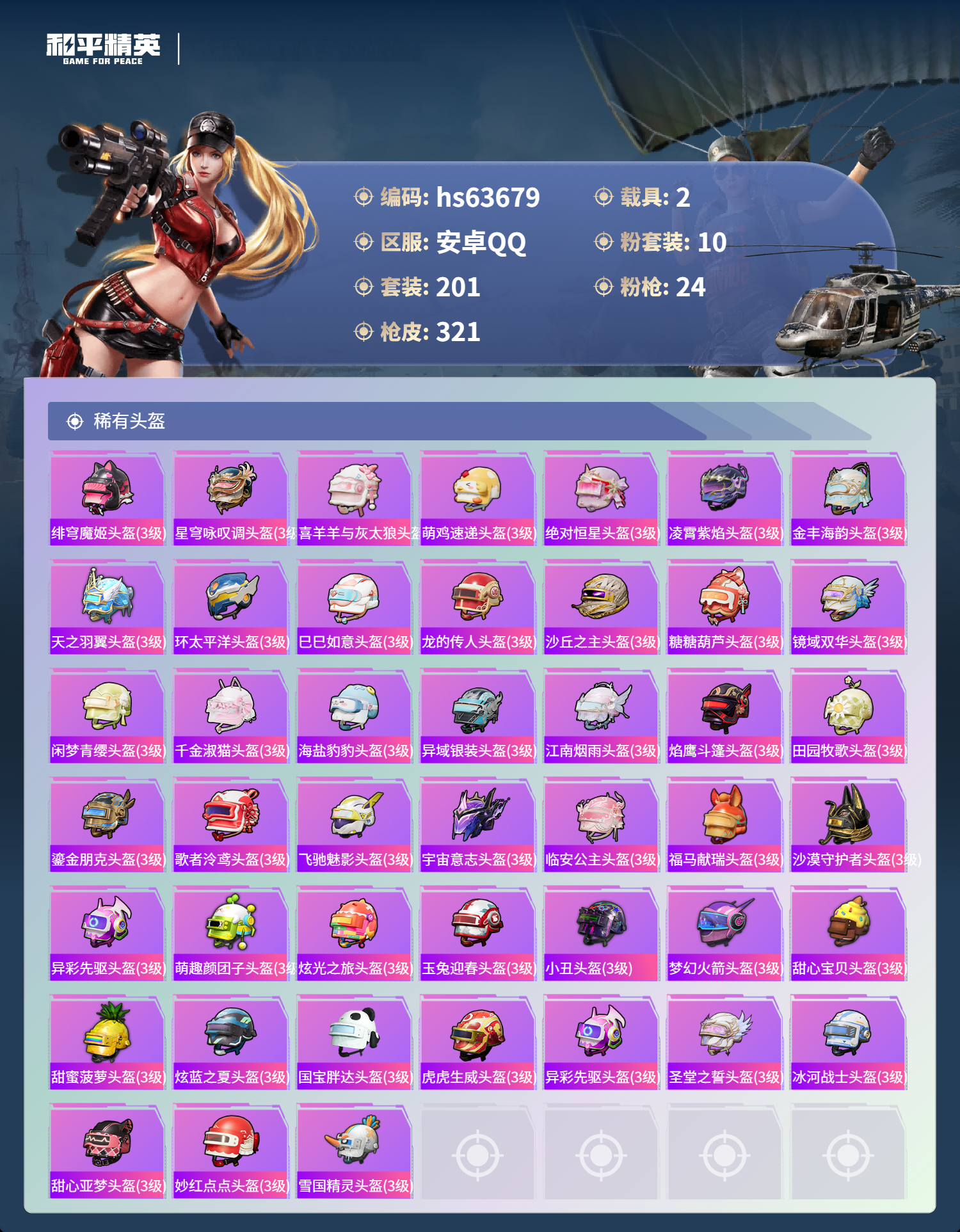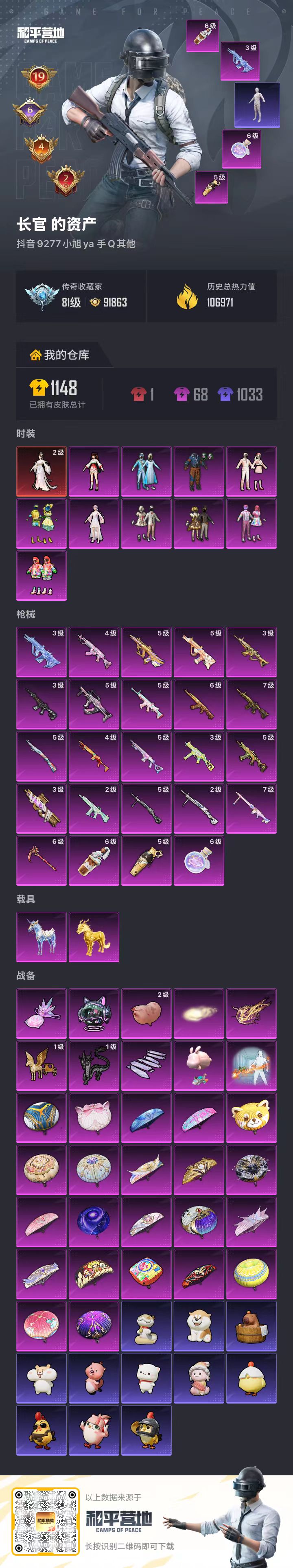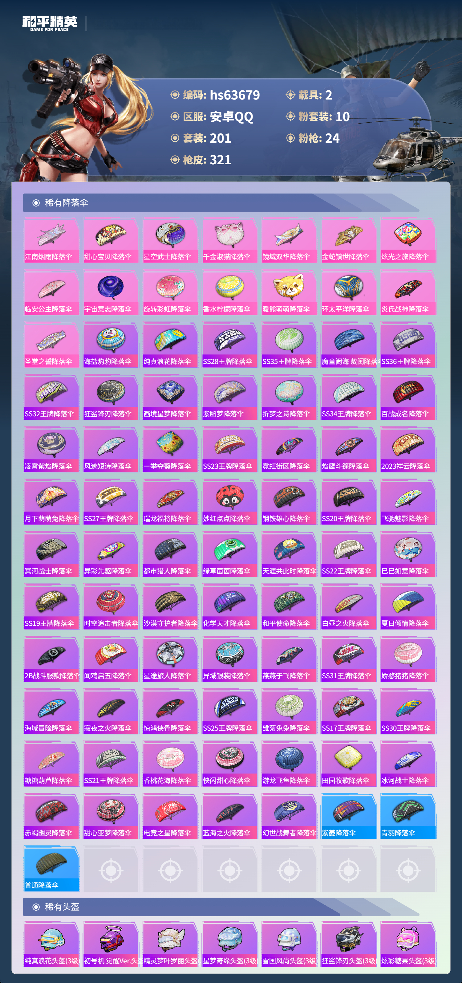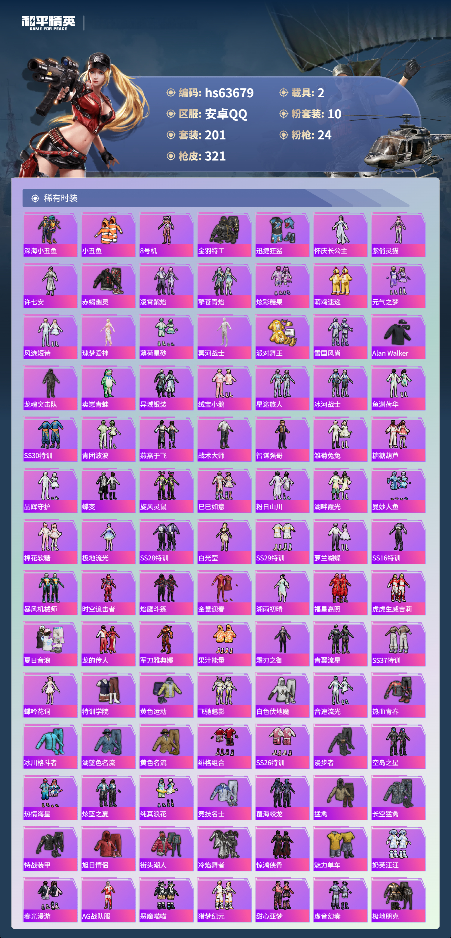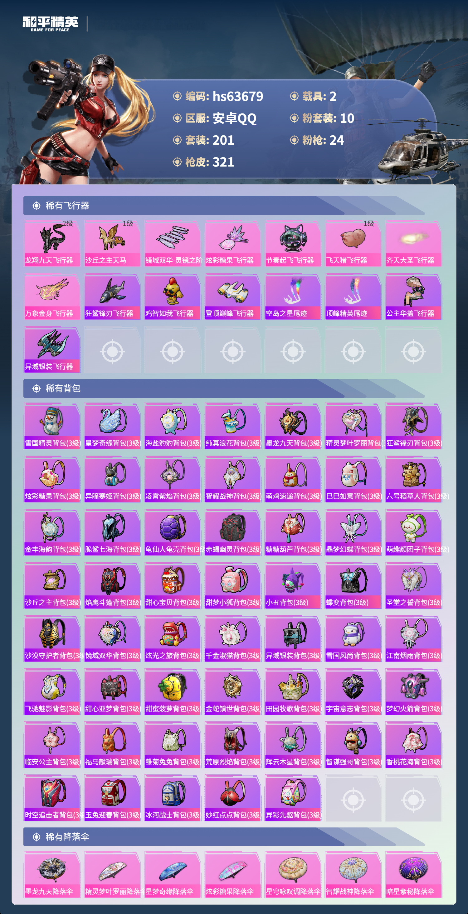 hs63679 安卓手Q-19王牌印记-有战神框-1红装-10粉装-24特效枪-2载具-热力值-201套装-321枪皮-6卓越印记-4传奇印记