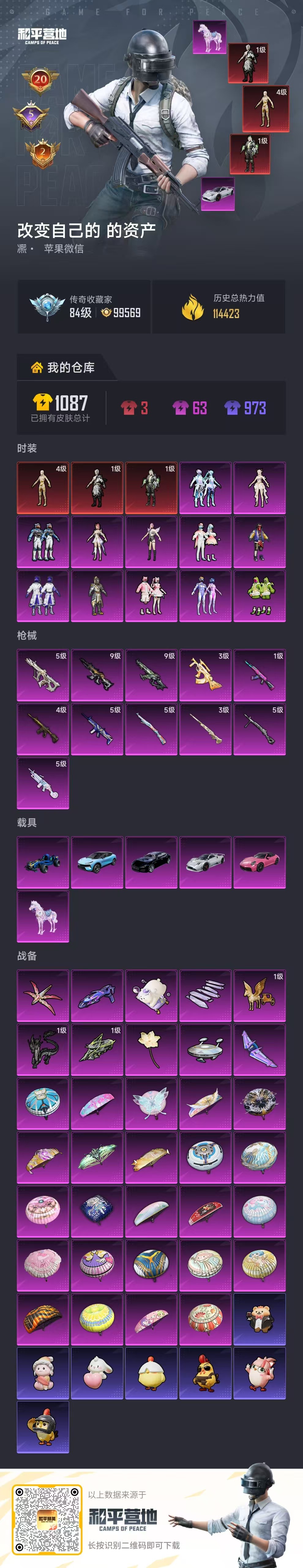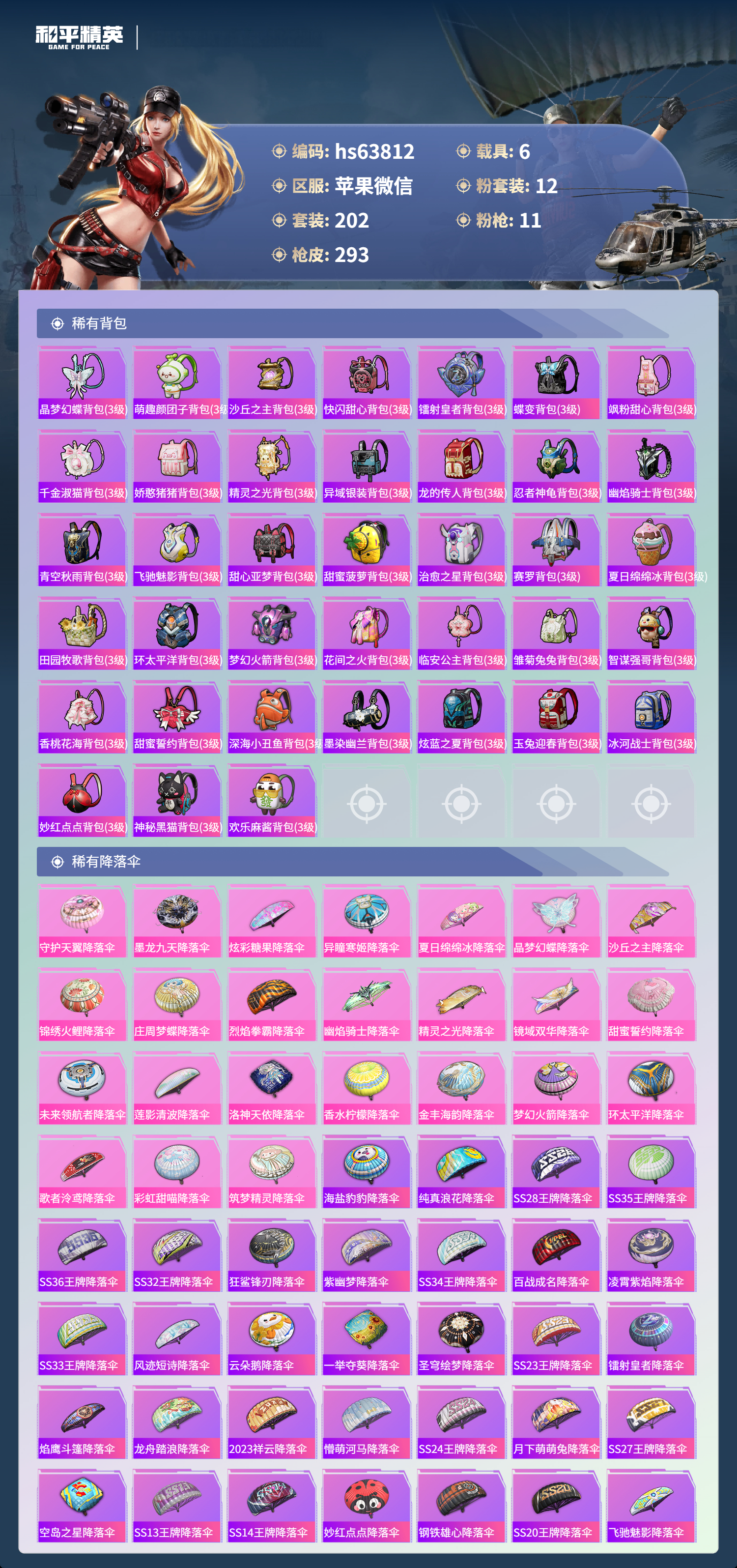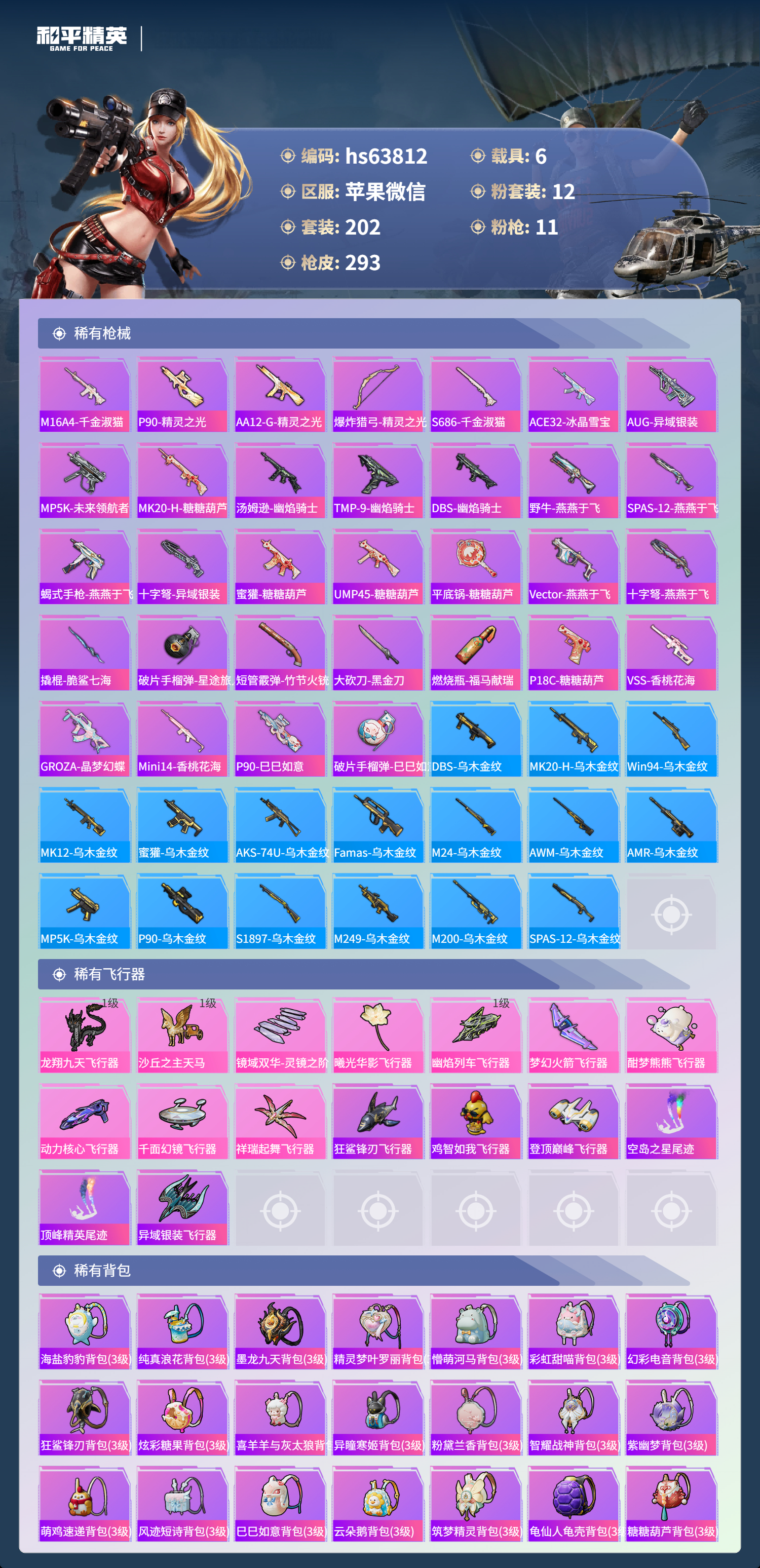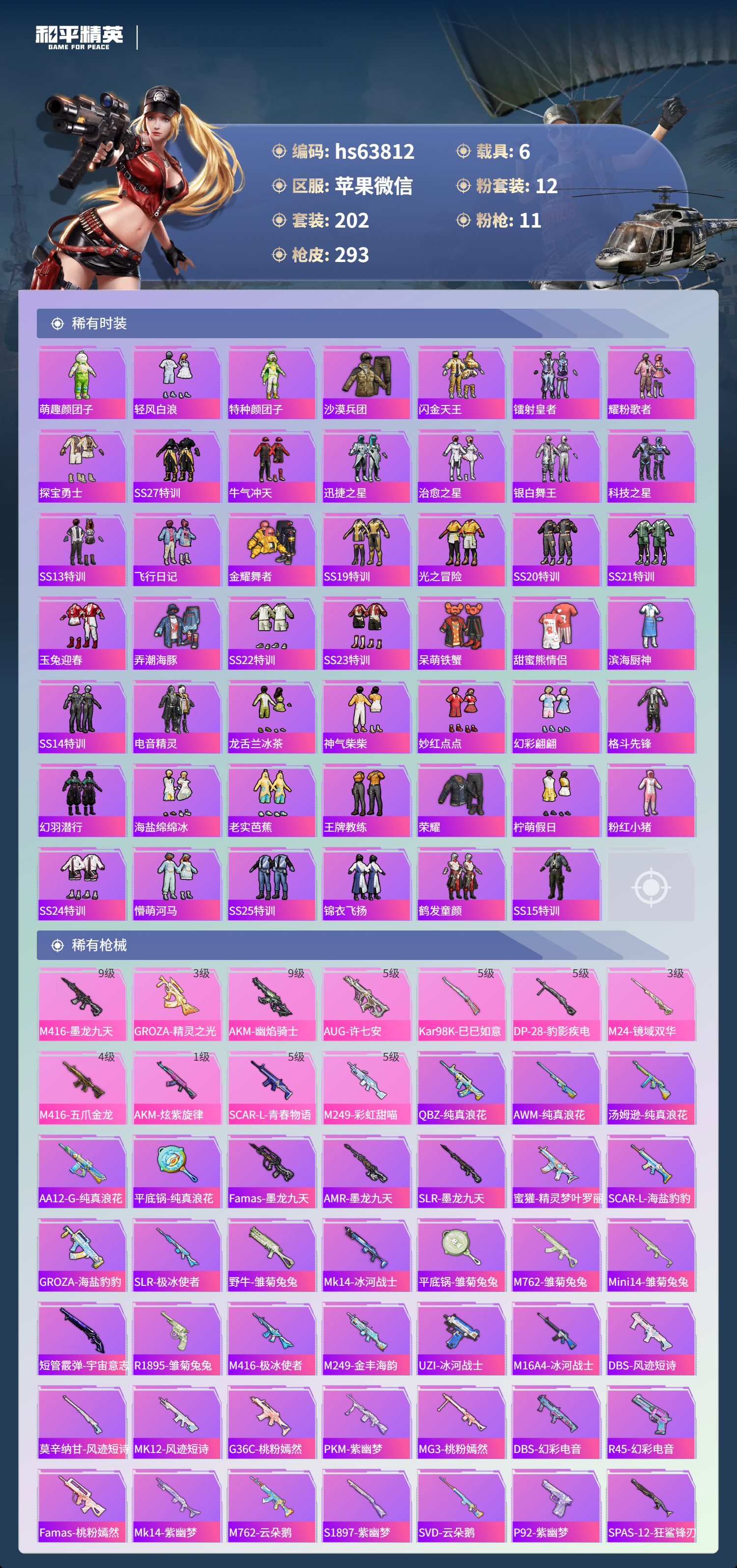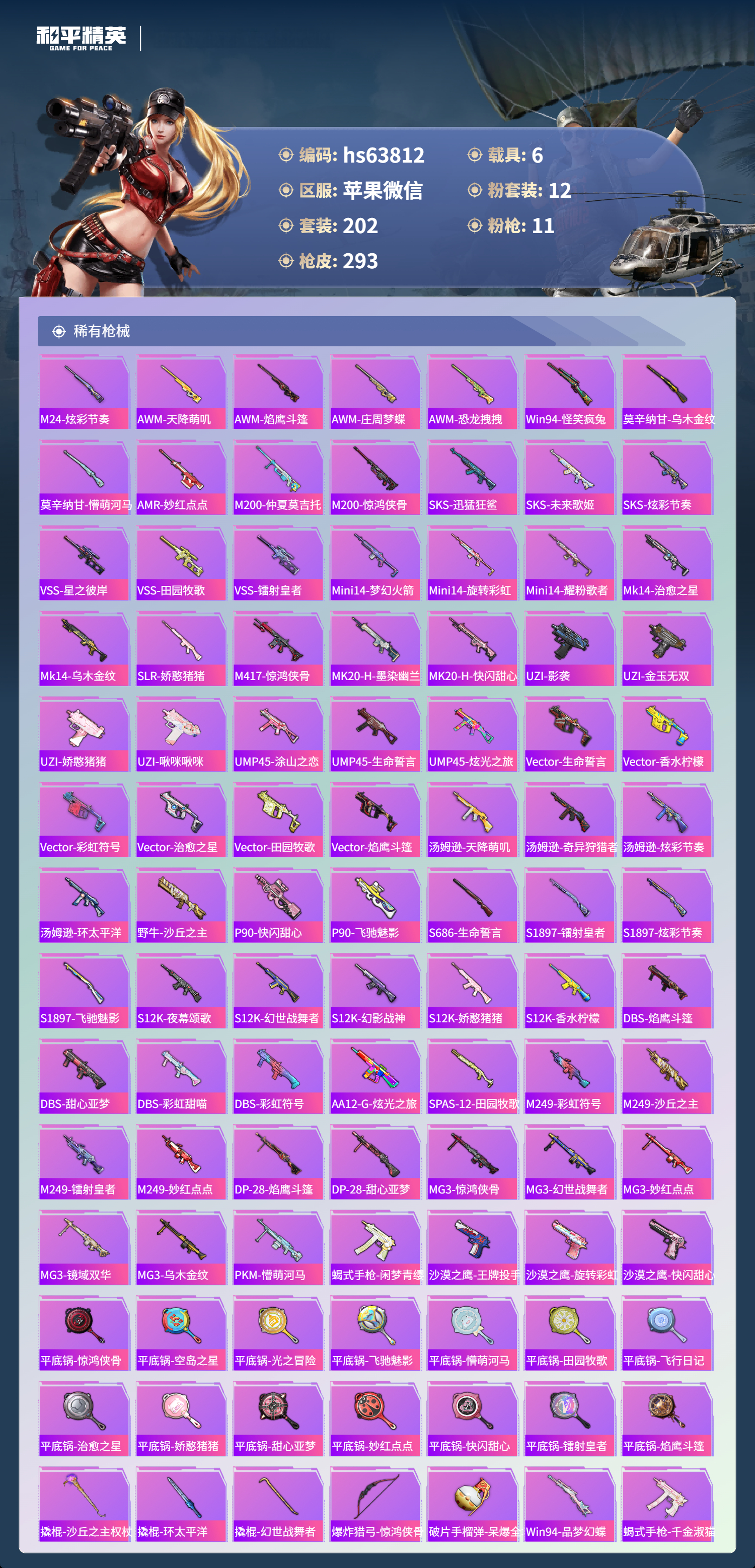 hs63812 苹果微信-20王牌印记-3红装-12粉装-11特效枪-6载具-热力值-202套装-293枪皮-5卓越印记-2传奇印记