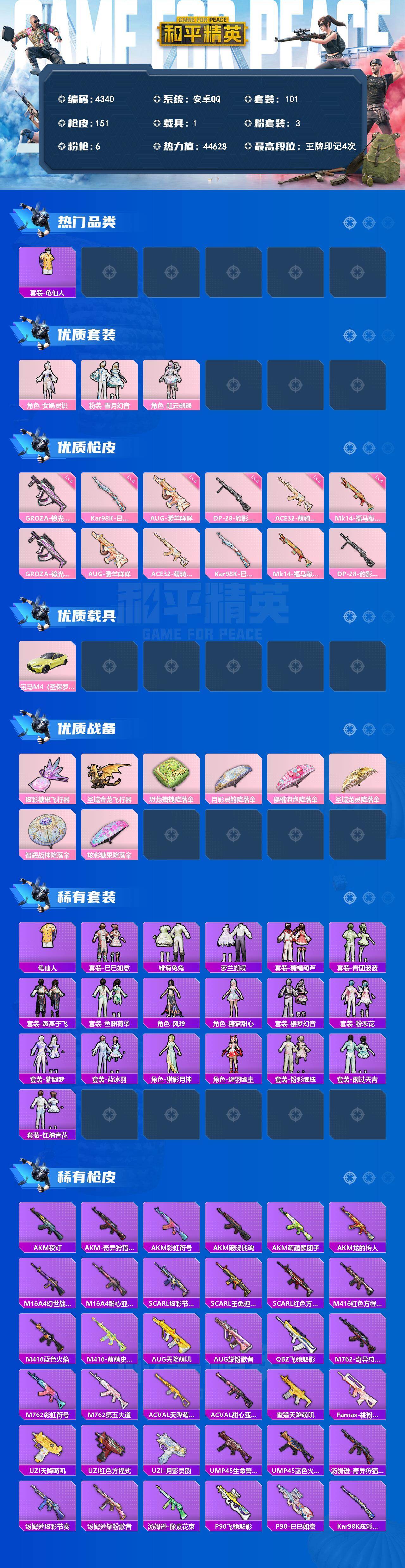 安卓 手Q-3粉装-6特效枪-1载具-2粉色飞行器-44628热力值-4王牌印记-101套装-151枪皮