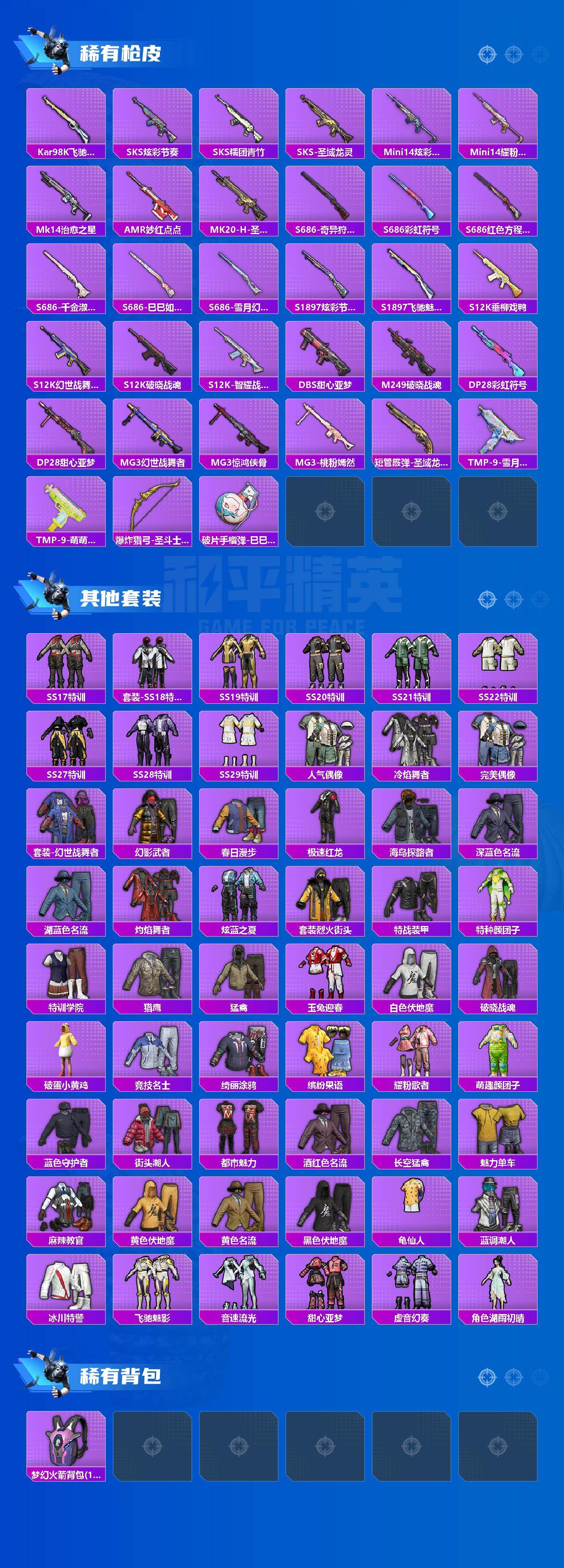 【粉色枪皮等级】:GROZA-镜光银凌(五级),AUG-暖羊咩咩(五级),ACE32-萌骑漫游(五级),Kar98K-巳巳如意(五级),Mk14-福马献瑞(四级),DP-28-豹影疾电(五级)