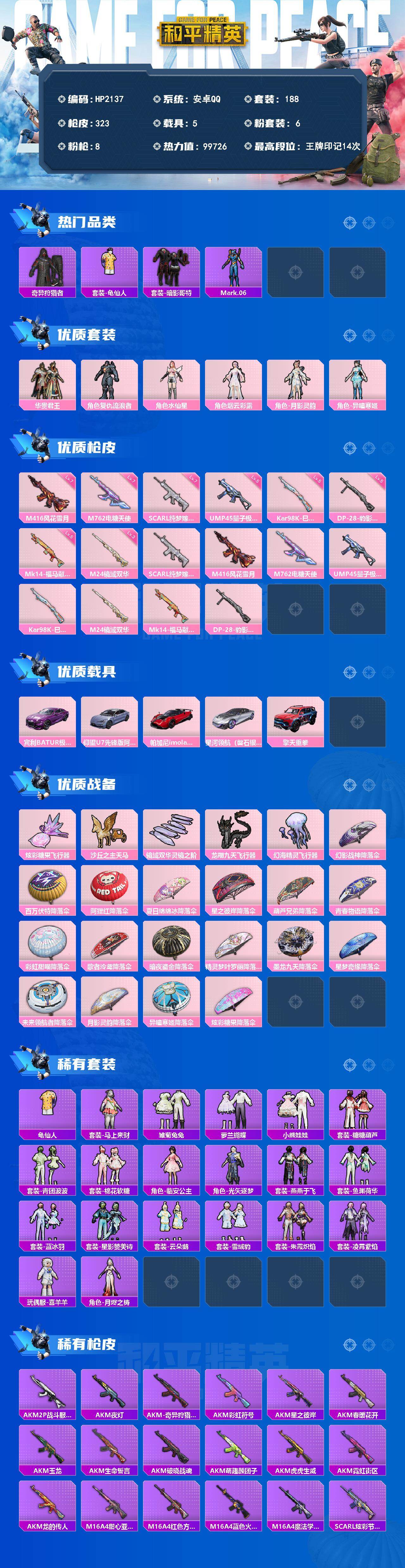 【HP2137】188套装/枪械8/装备339/载具5/战备202/王牌印记14/热力值99726/七级SCAR-L-纯梦嫁纱/七级M416-风花雪月/七级M762-电糖天使/五级UMP45-量子极限/五级Kar98K-巳巳如意/三级M24-镜域双华/五级Mk14-福马献瑞/五级DP-28-豹影疾电/套装-奇异狩猎者/套装-龟仙人/套装-暗影哥特/角色-Mark.06/粉装-华贵君王/角色-复仇流浪者/角色-水仙星/角色-烟云彩露/角色-月影灵韵/角色-异瞳寒姬/宾利BATUR(极速紫)/仰望U