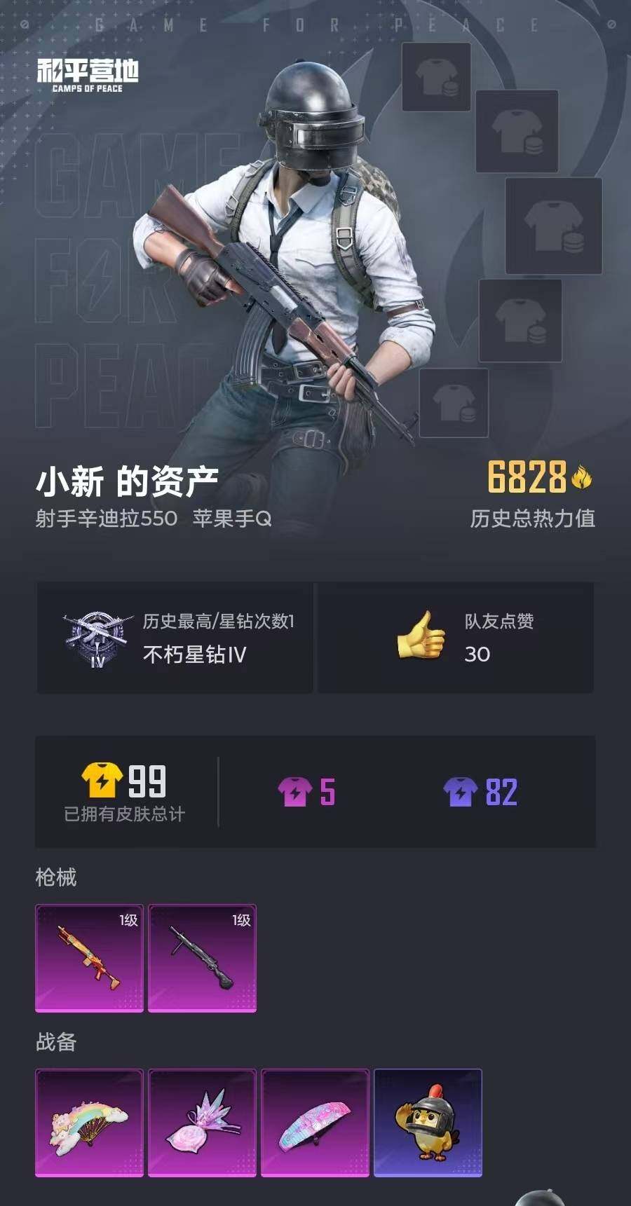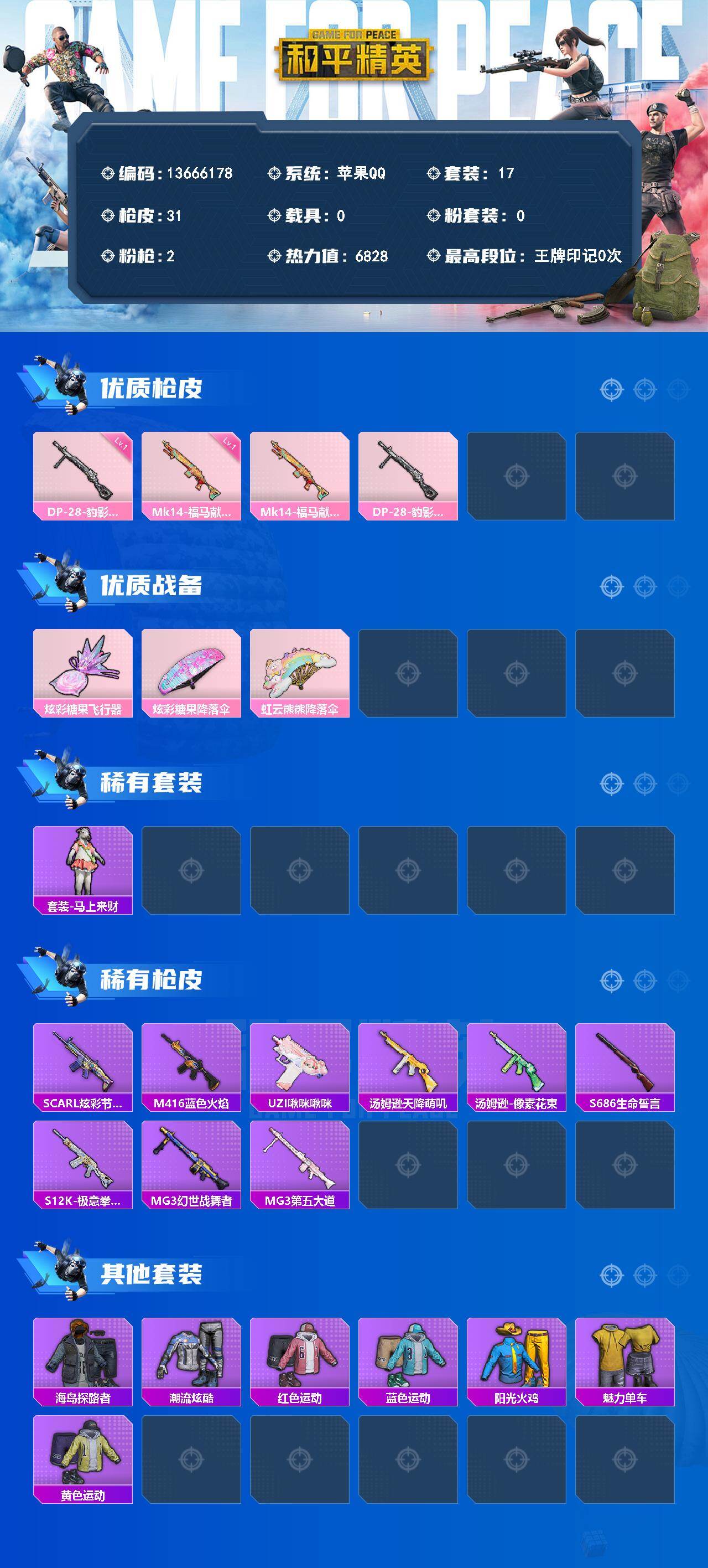 17套装/枪械2/装备32/战备19/热力值6828/一级Mk14-福马献瑞/一级DP-28-豹影疾电/Mk14-福马献瑞/DP-28-豹影疾电/炫彩糖果飞行器/炫彩糖果降落伞/虹云熊熊降落伞/套装-雪国风尚/套装-马上来财/SCAR-L-炫彩节奏/M416-蓝色火焰/UZI-啾咪啾咪/汤姆逊-天降萌叽/汤姆逊-像素花束/S686-生命誓言/S12K-极意拳锋/MG3-幻世战舞者/MG3-第五大
