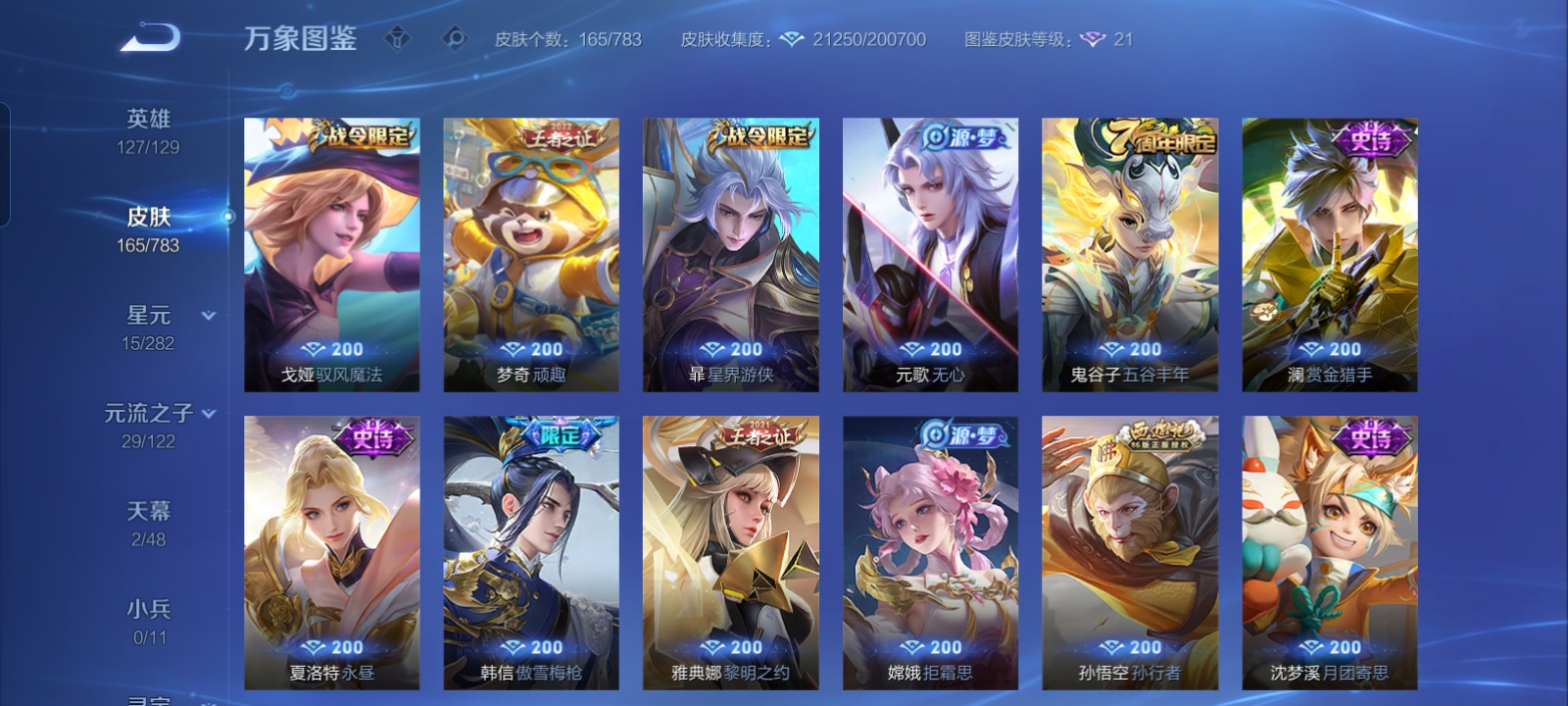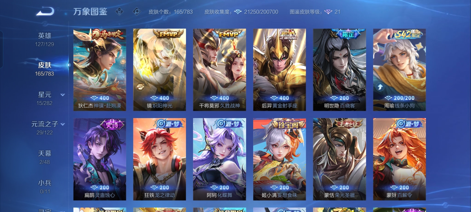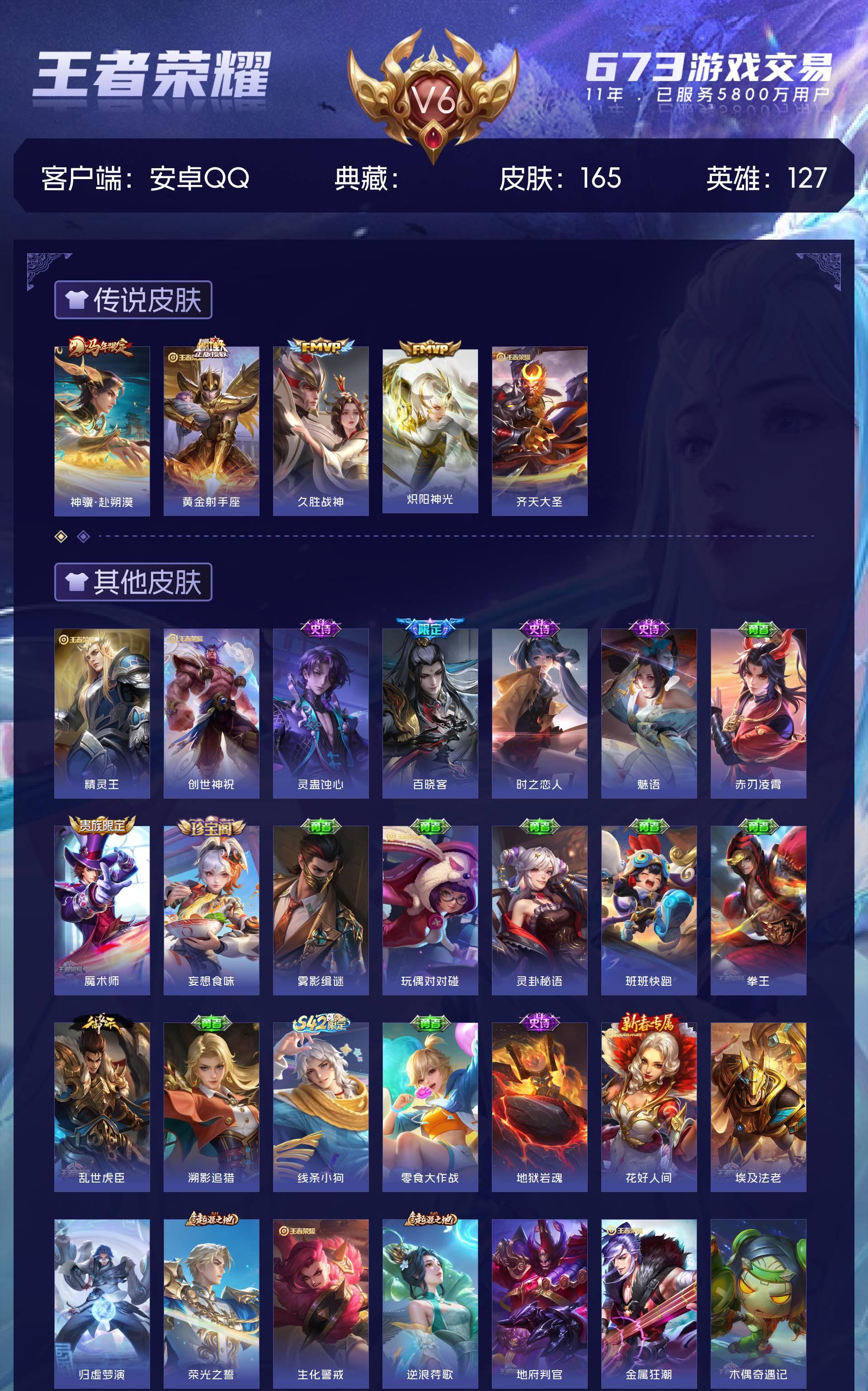V6 皮肤165 英雄127 无双王者 传说5 其他皮肤167