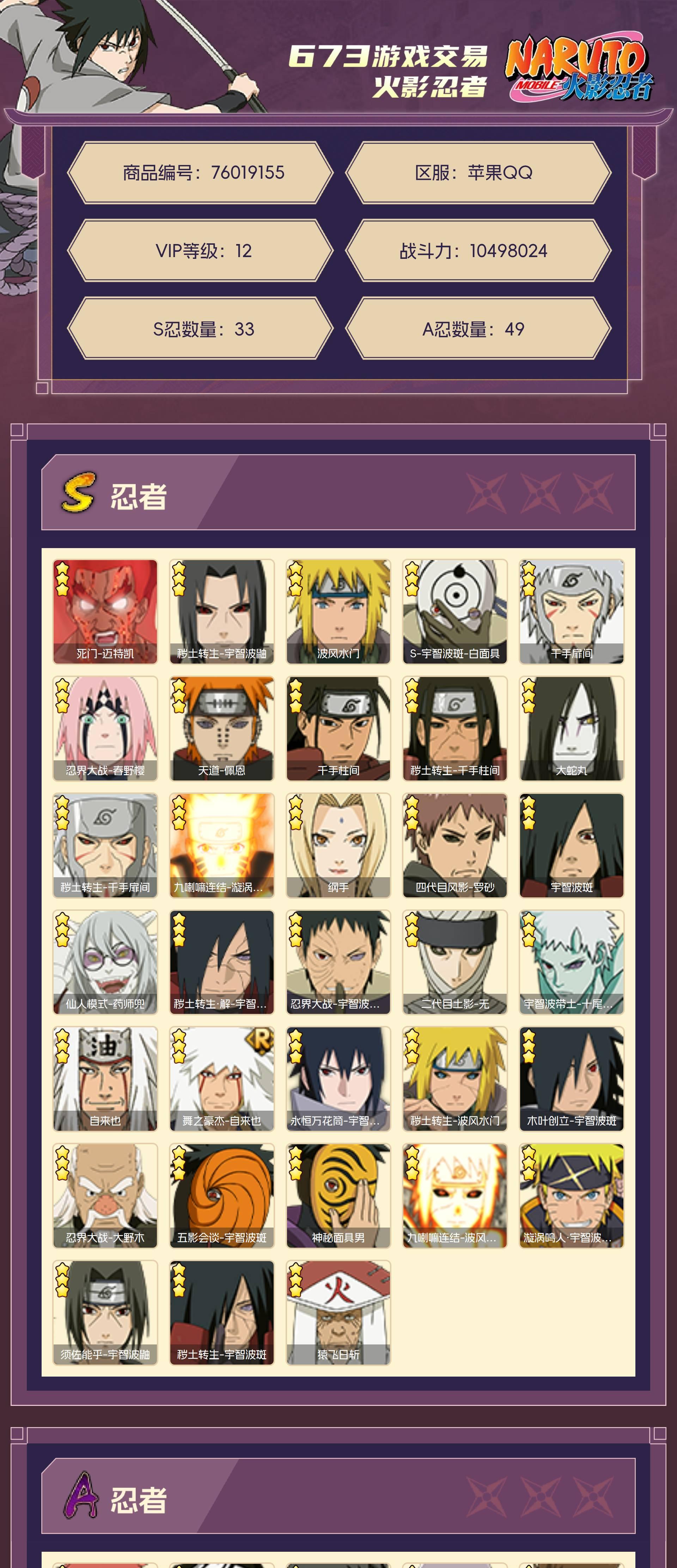角色等级149 战斗力10498024 S忍33 A忍49 12 段位暗部