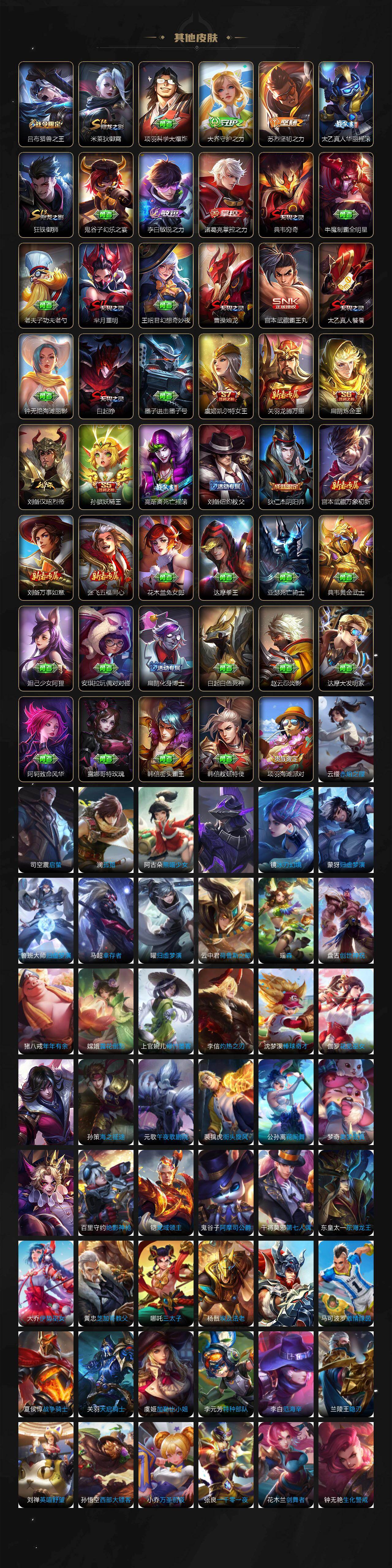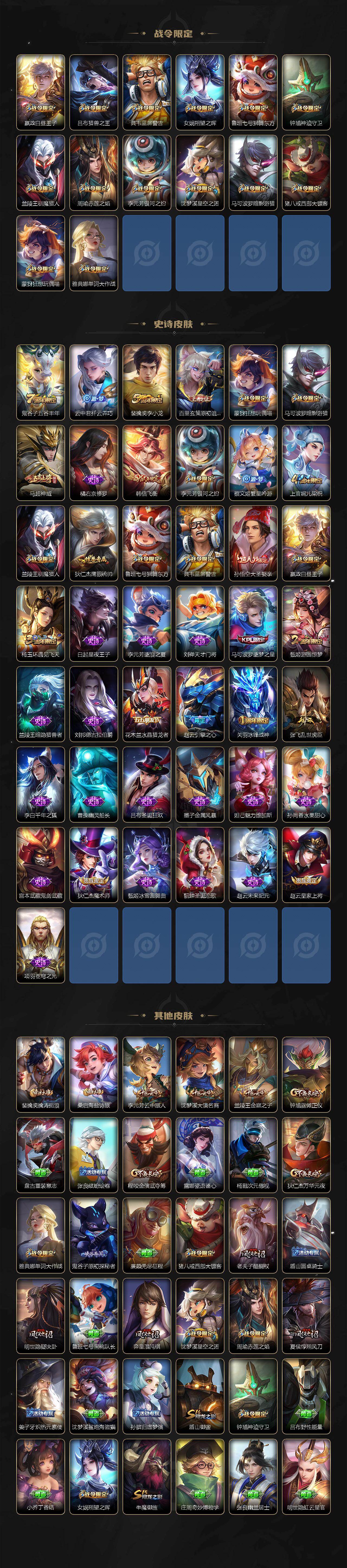 【限定皮肤】:白起狰,狄仁杰阴阳师,虞姬凯尔特女王,赵云皇家上将,赵云引擎之心,嬴政白昼王子,鲁班七号狮舞东方,高渐离死亡摇滚,孙膑妖精王,扁鹊炼金王,芈月重明,吕布猎兽之王,周瑜赤莲之焰,夏侯惇朔风刀,甄姬游园惊梦,曹操烛龙,典韦穷