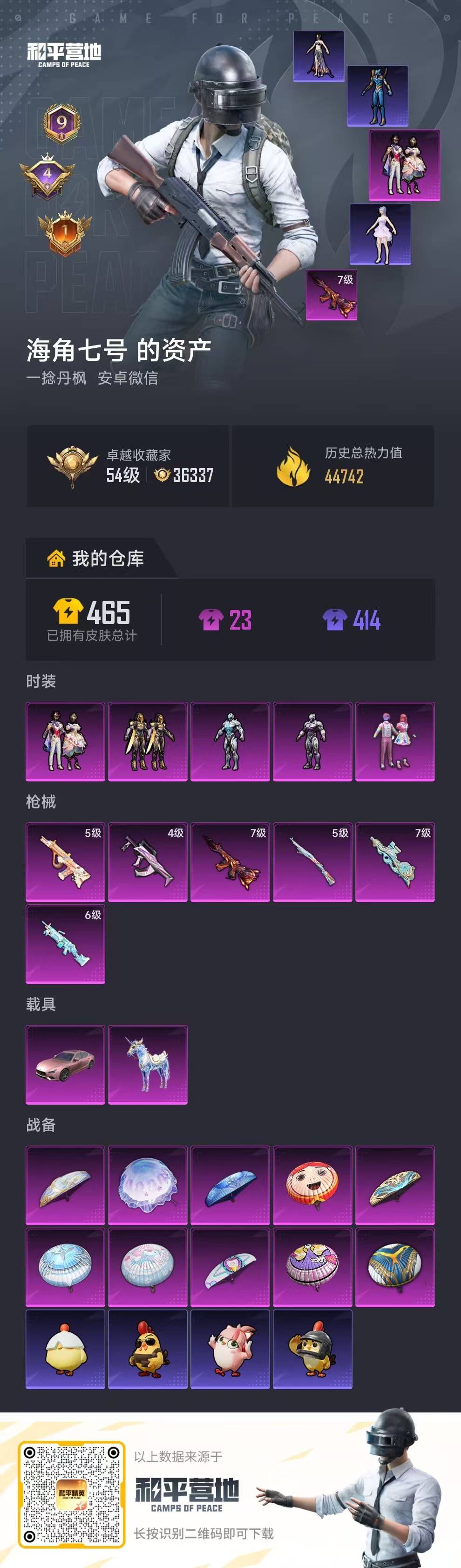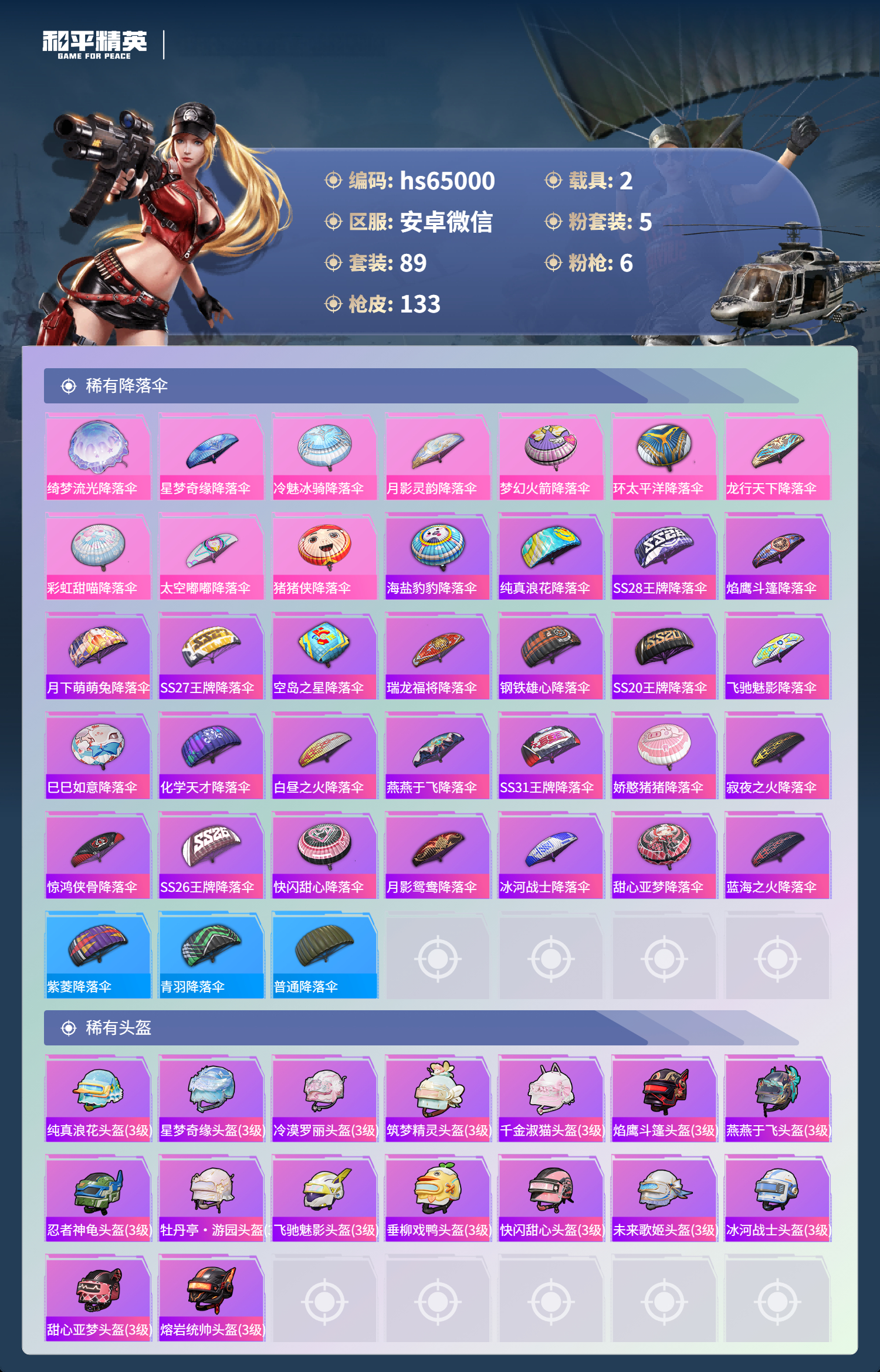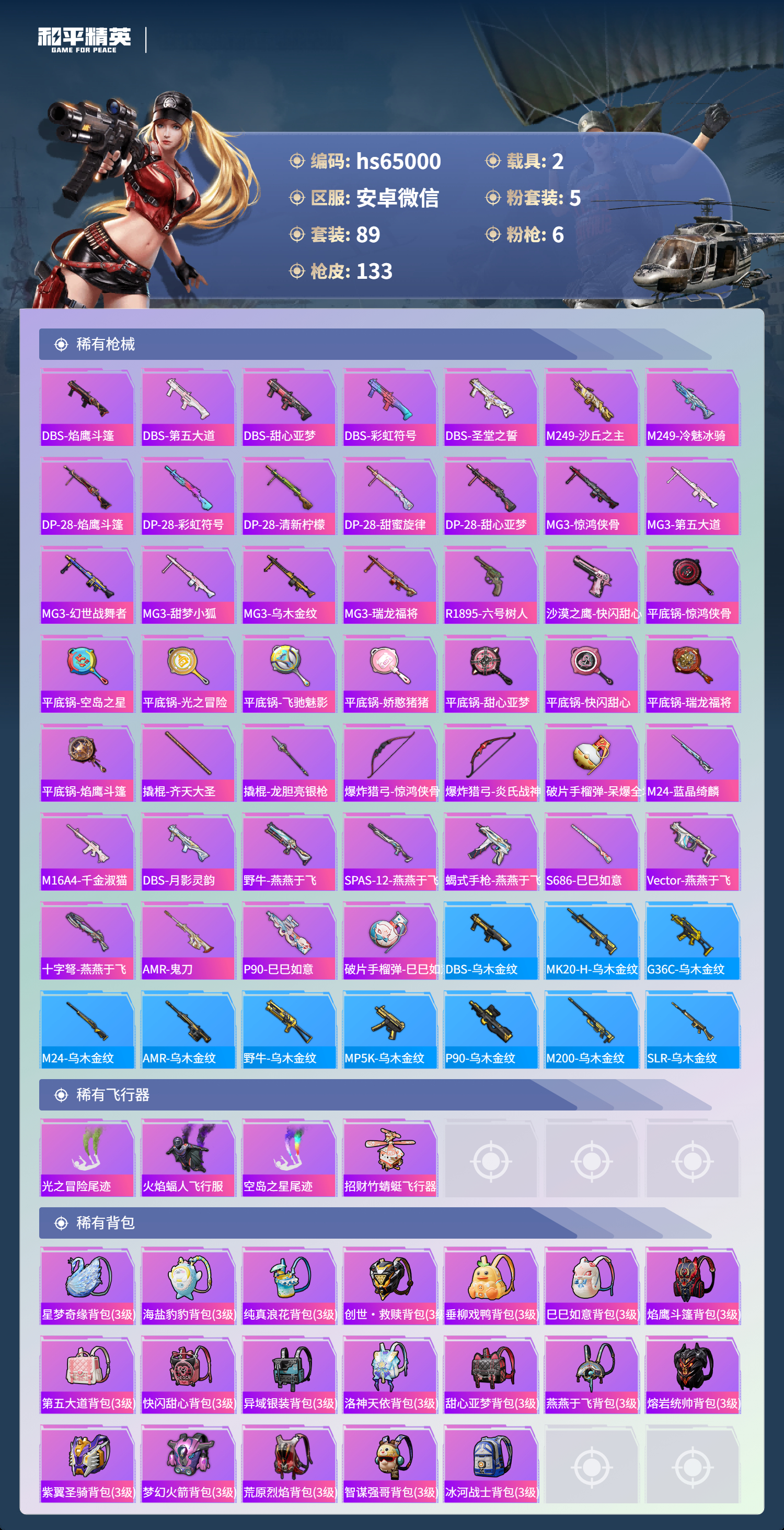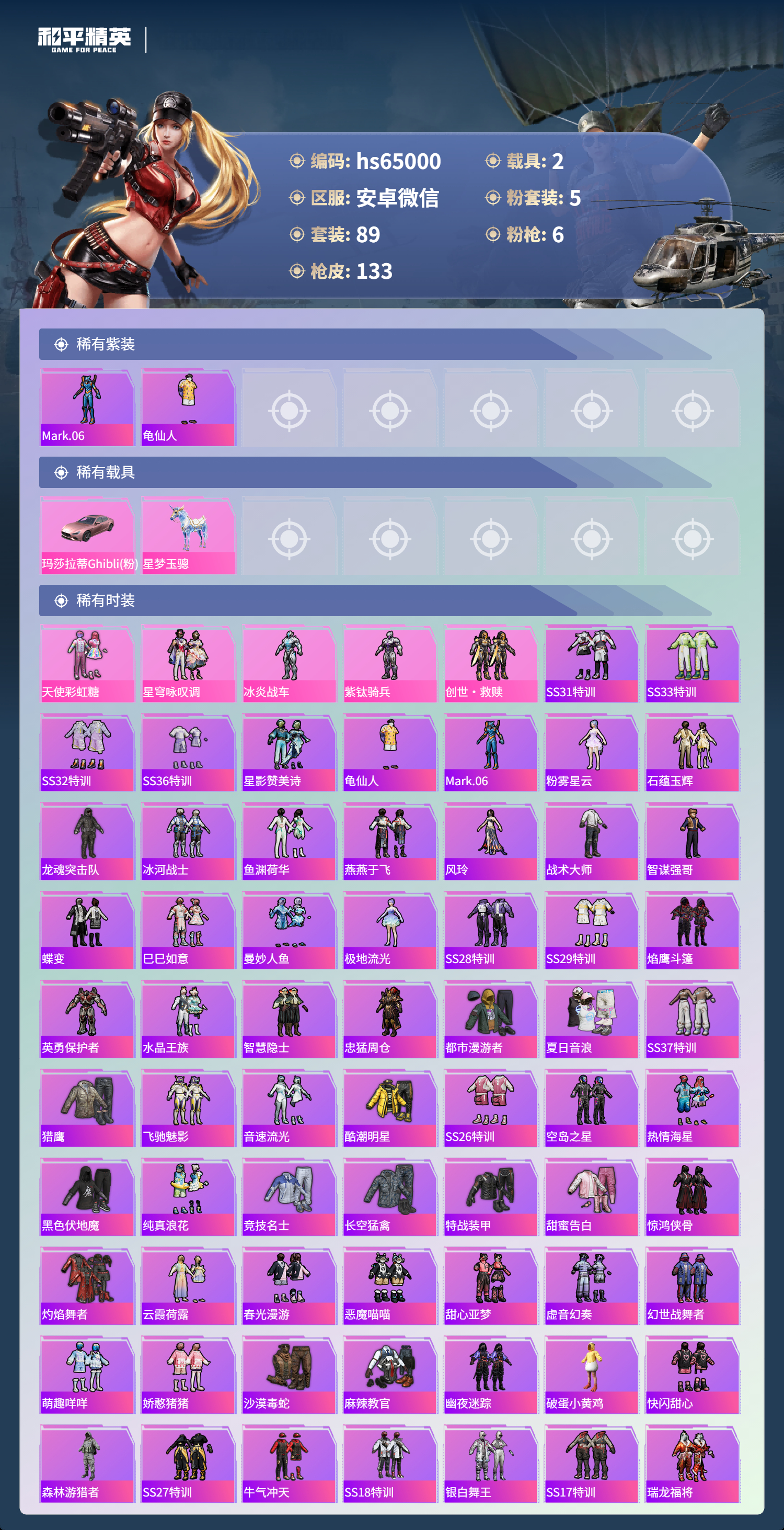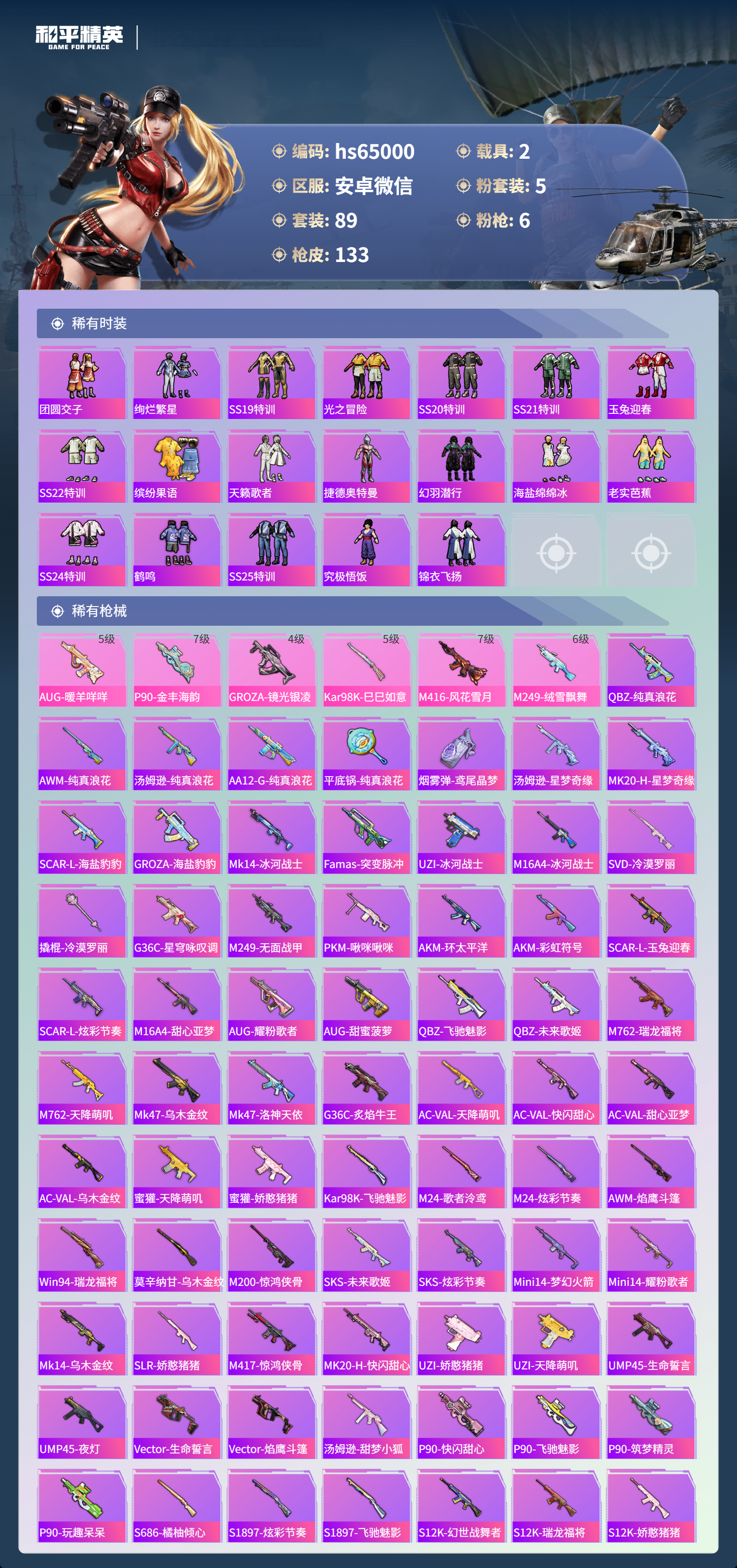 hs65000 安卓微信-9王牌印记-5粉装-6特效枪-2载具-44747热力值-89套装-133枪皮-4卓越印记-1传奇印记