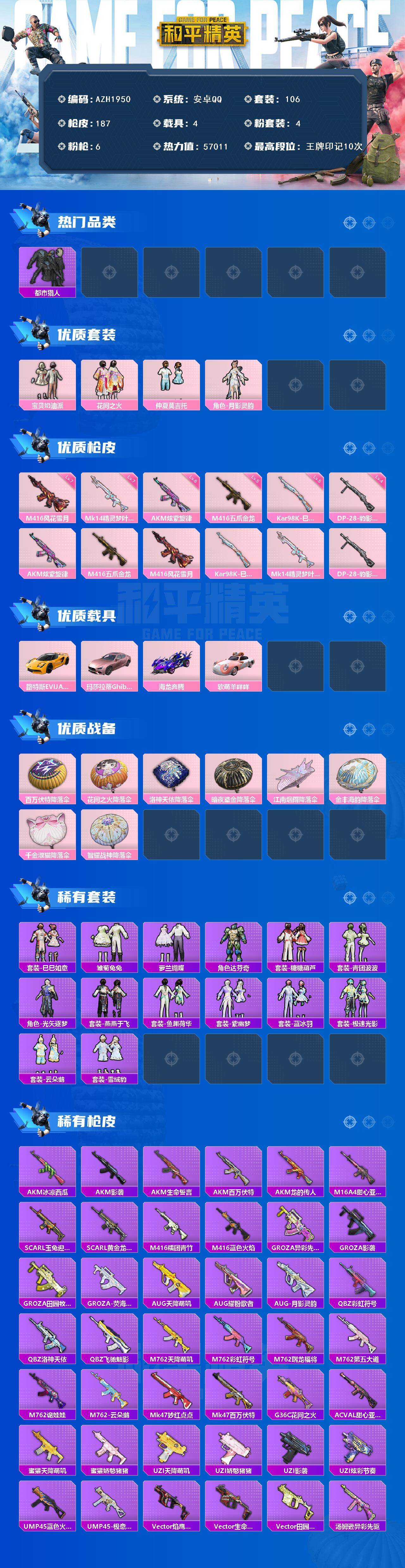 【AZH1950】安卓 手Q【都市花间之火 满级风花雪月M416满级精灵梦叶罗丽Mk14 百万伏特背包 4载具】4粉装-6特效枪-4载具-0粉色飞行器-57011热力值-10王牌印记-106套装-187枪皮