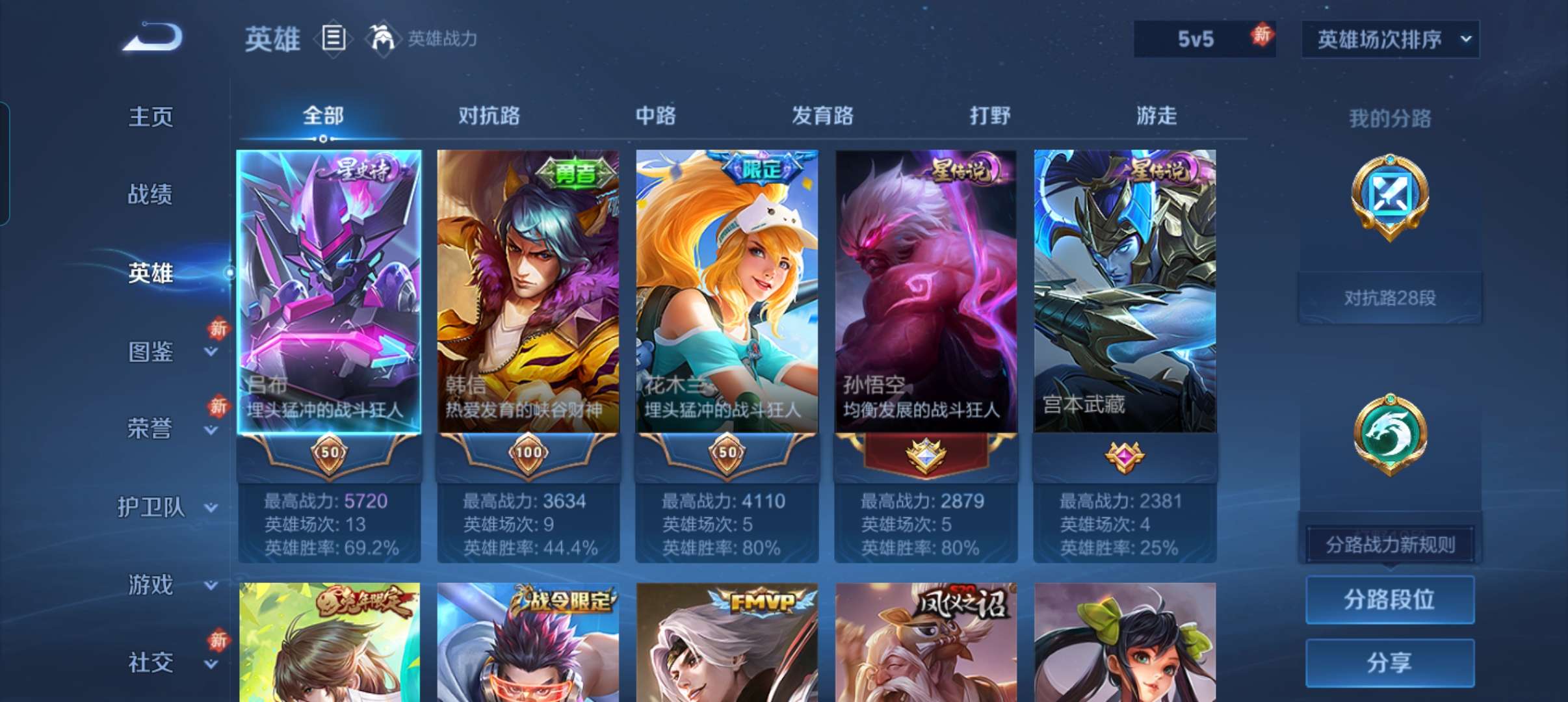 较多为对抗路及打野英雄熟练度以及稀有皮肤星元传说等,v7,对抗路28段