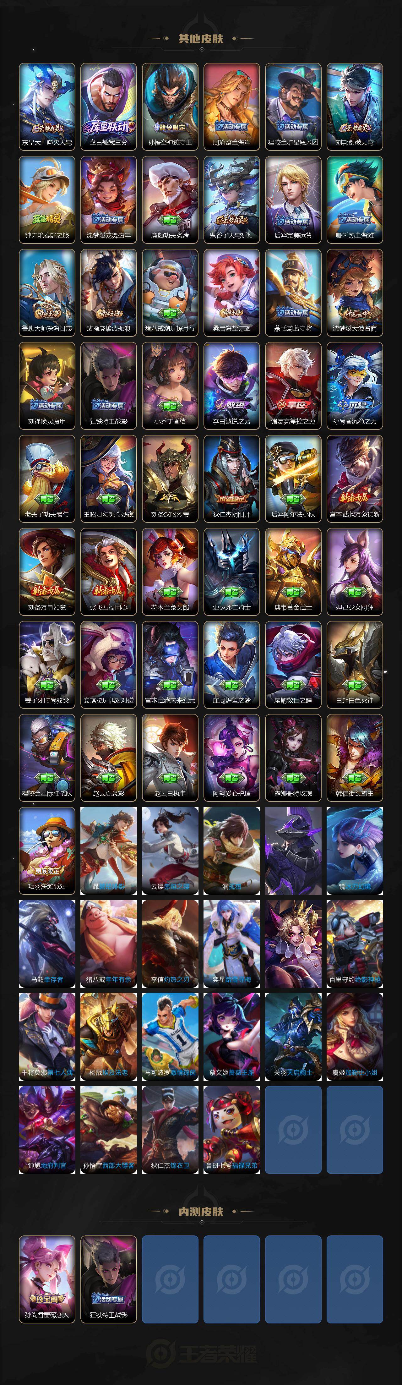 【限定皮肤】:狄仁杰阴阳师,赵云皇家上将,孙尚香蔷薇恋人,元歌无心,项羽海滩派对,百里玄策原初追逐者,沈梦溪大漠名商,裴擒虎擒涛扼浪,鲁班大师探海日志,桑启海盐诗旅,鬼谷子天穹祈