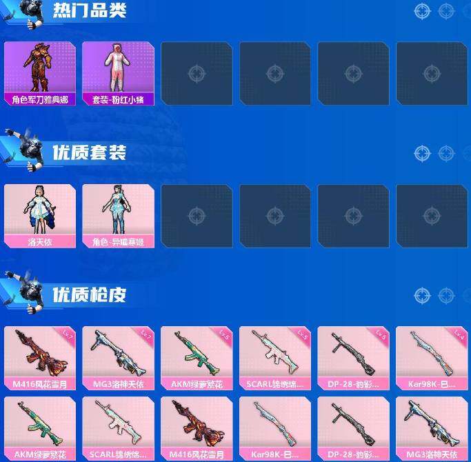 【粉色枪皮等级】:AKM-绿萝繁花(五级),SCAR-L-锦绣绵绵(五级),M416-风花雪月(七级),Kar98K-巳巳如意(四级),DP-28-豹影疾电(五级),MG3-洛神天依(七级)